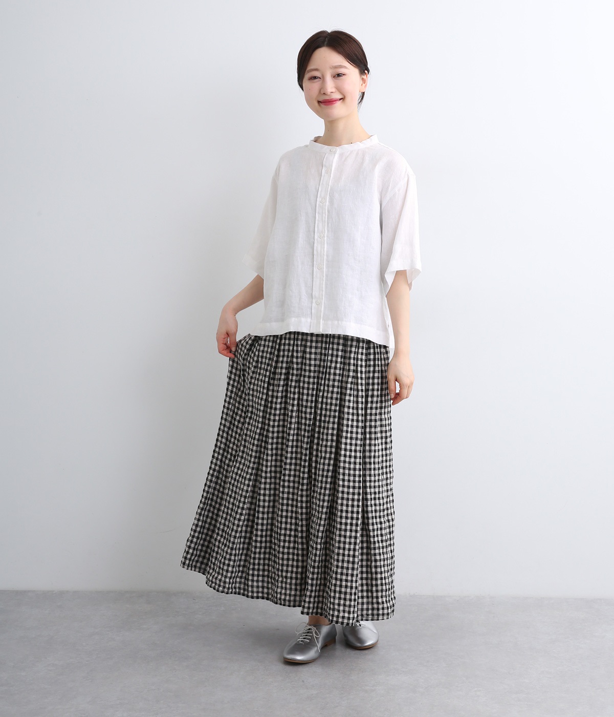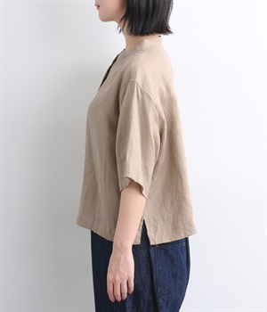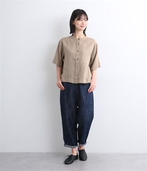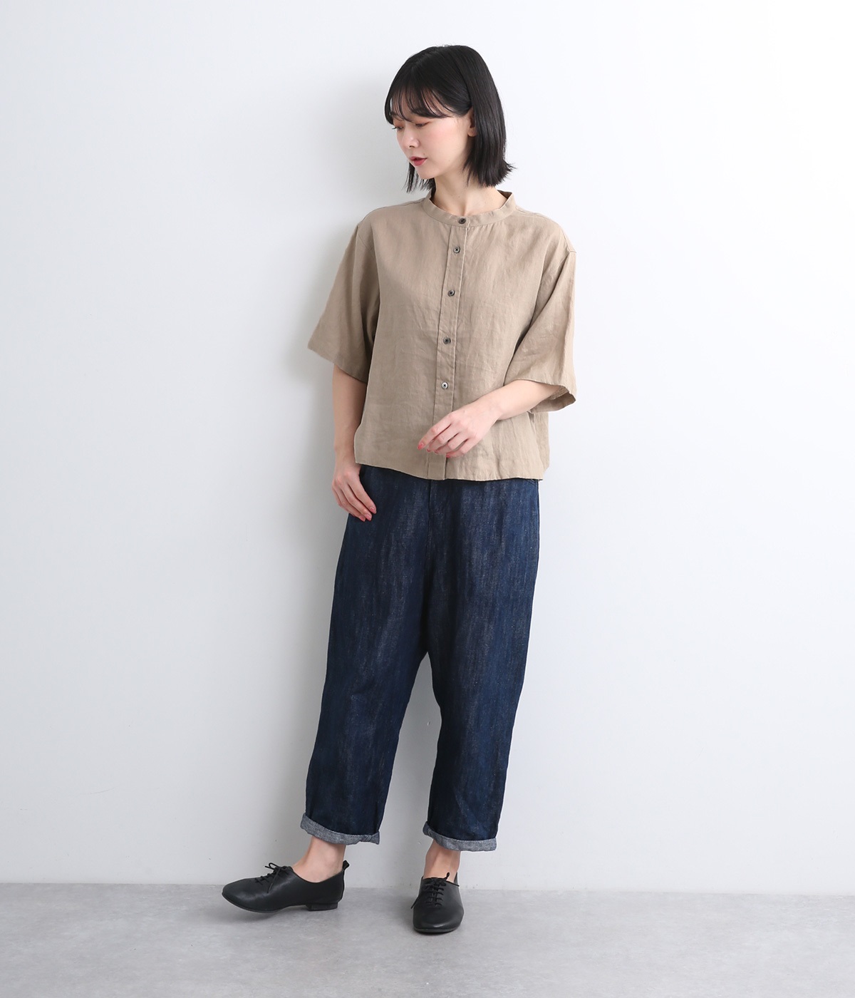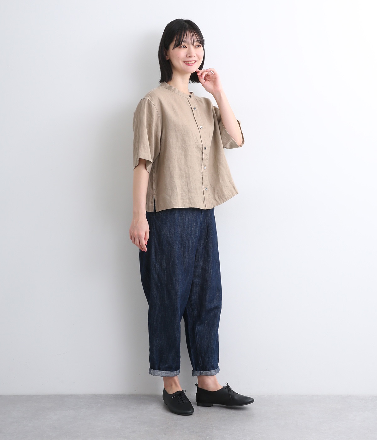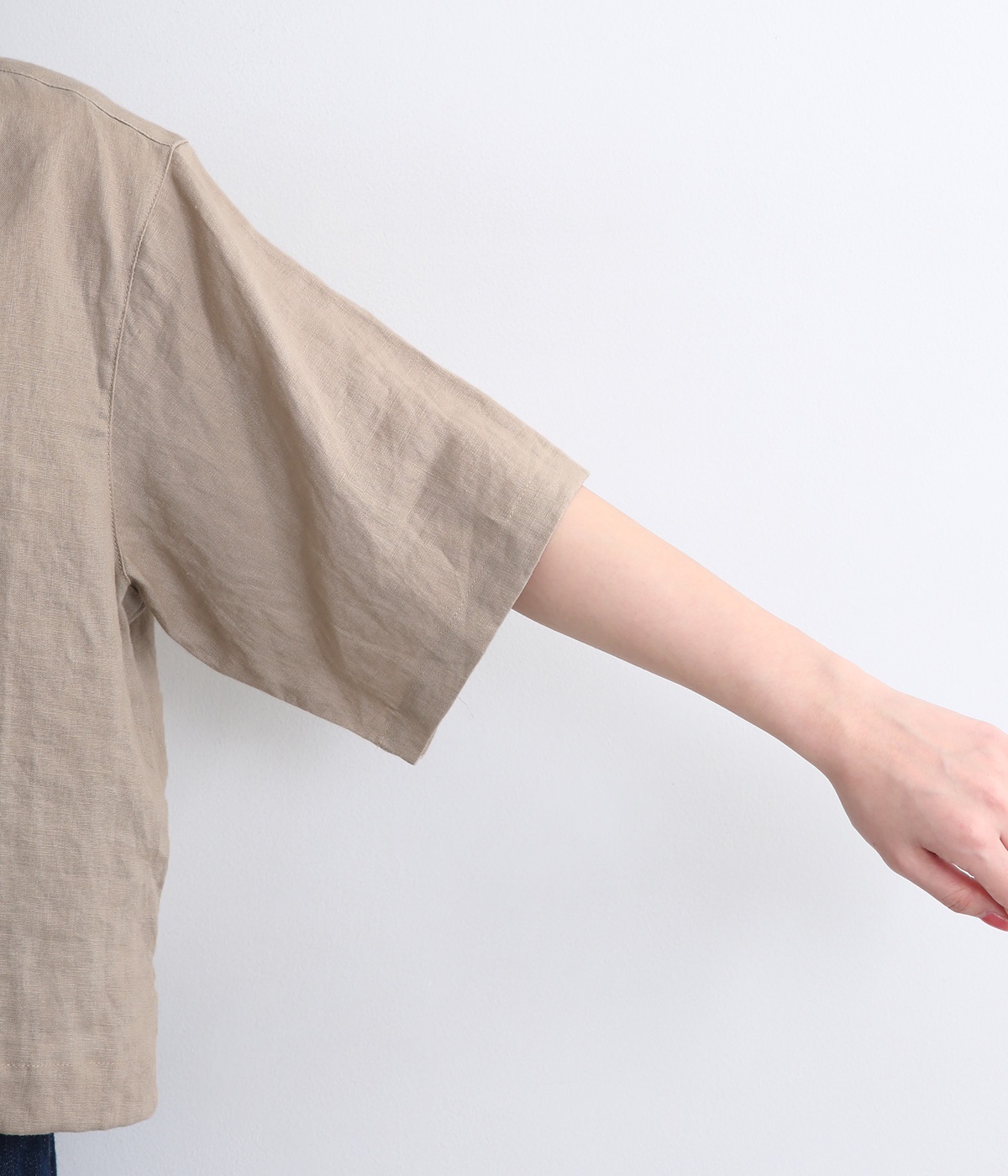 リネン素材ならではの、ふっくらとしたハリ感とナチュラルな風合いが魅力の生地。吸湿性・速乾性に優れ、汗をかいてもさらっと快適な着心地が続きます。