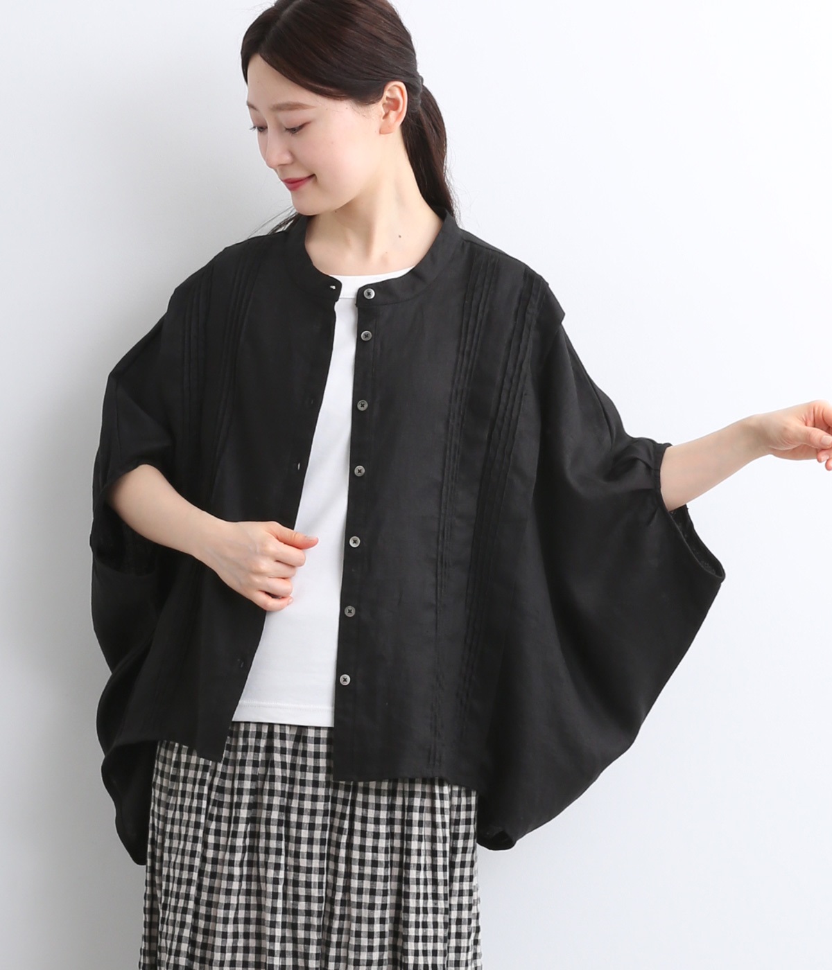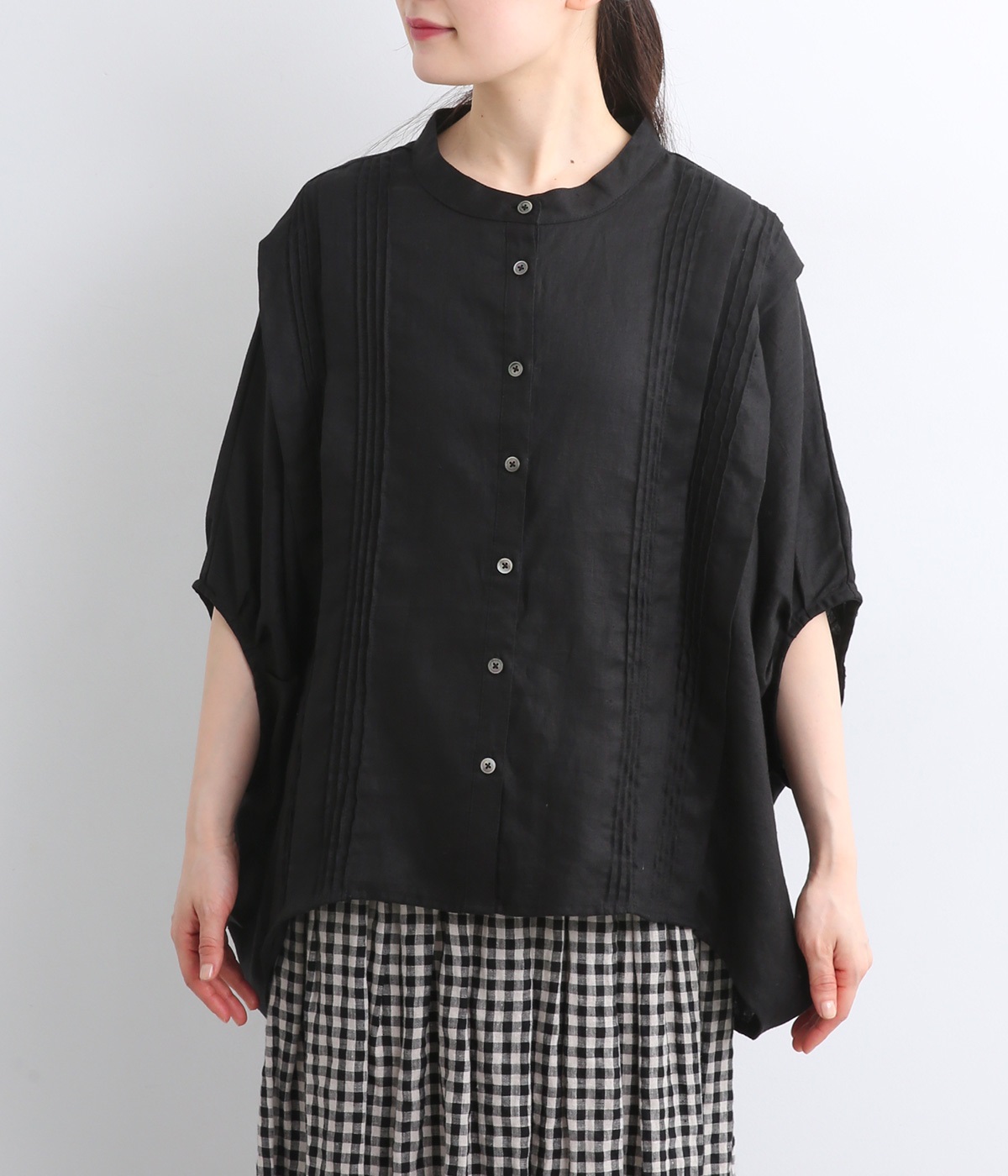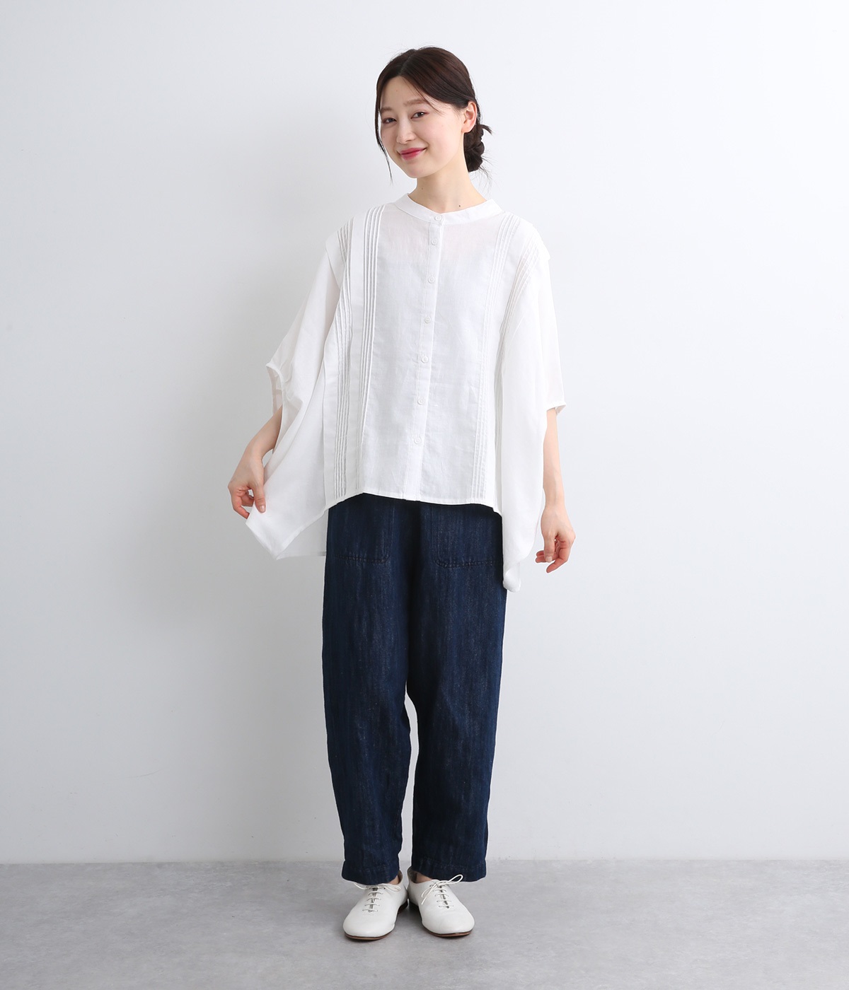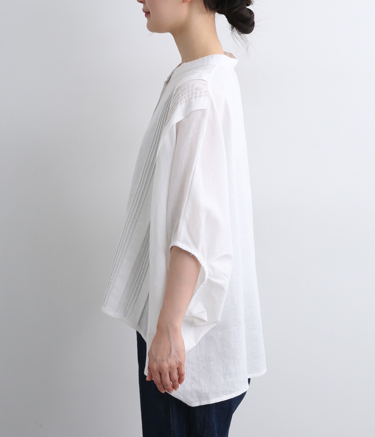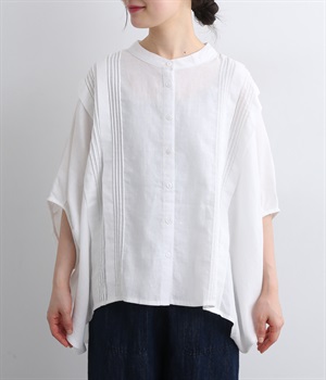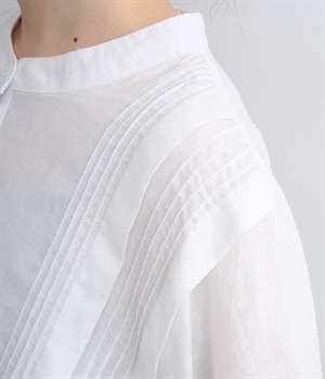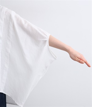 贅沢なワイドシルエットが魅力のブラウス。風が通り抜けるようなたっぷりとしたゆとりが、リラックス感を漂わせます。胸元には縦ラインを強調するピンタックをあしらい、表情に奥行きをプラス。コーディネートの主役になる存在感のある一枚です。