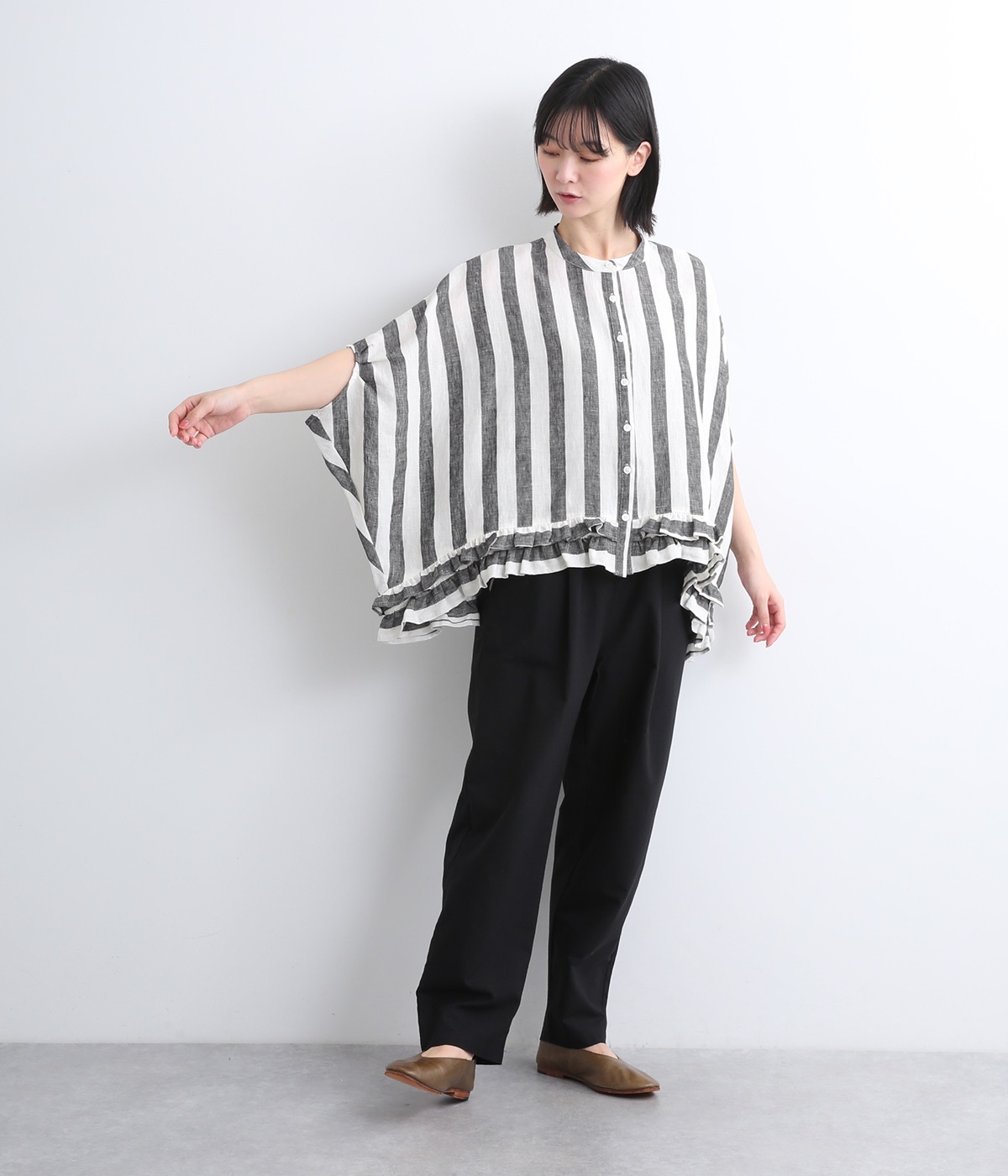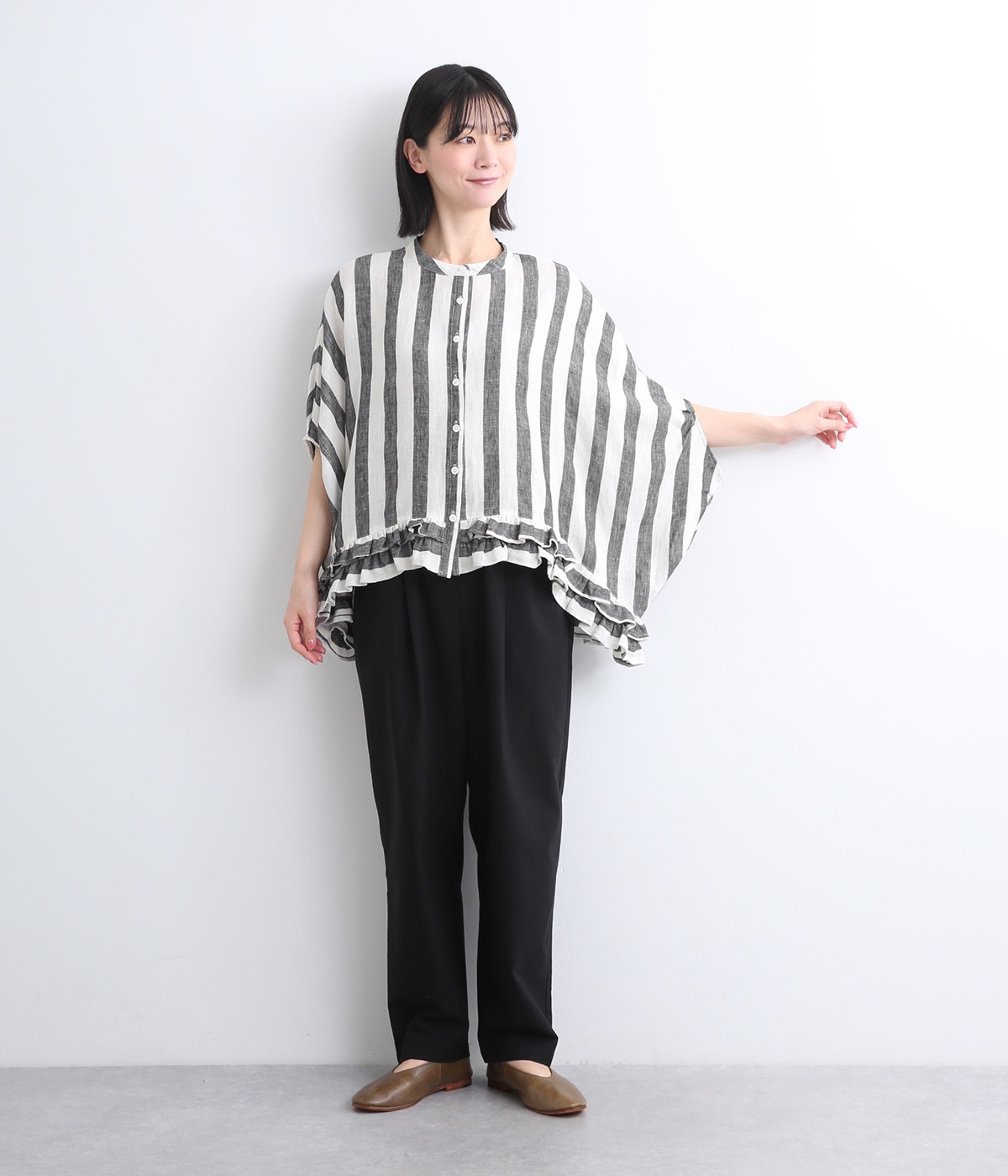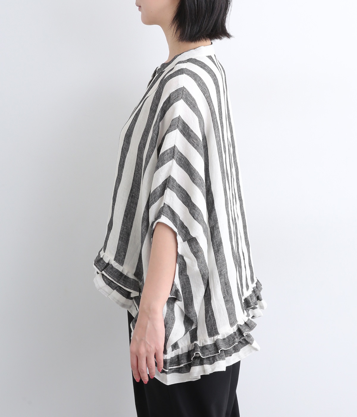 たっぷりと生地を使ったワイドシルエットが存在感を放つブラウス。動くたびにサイドがふわりと広がり、風をはらむようなやわらかな表情に。抜け感を生む前後差ヘムには二段フリルをあしらい、甘さが薫る大人のこなれた着こなしを叶えます。