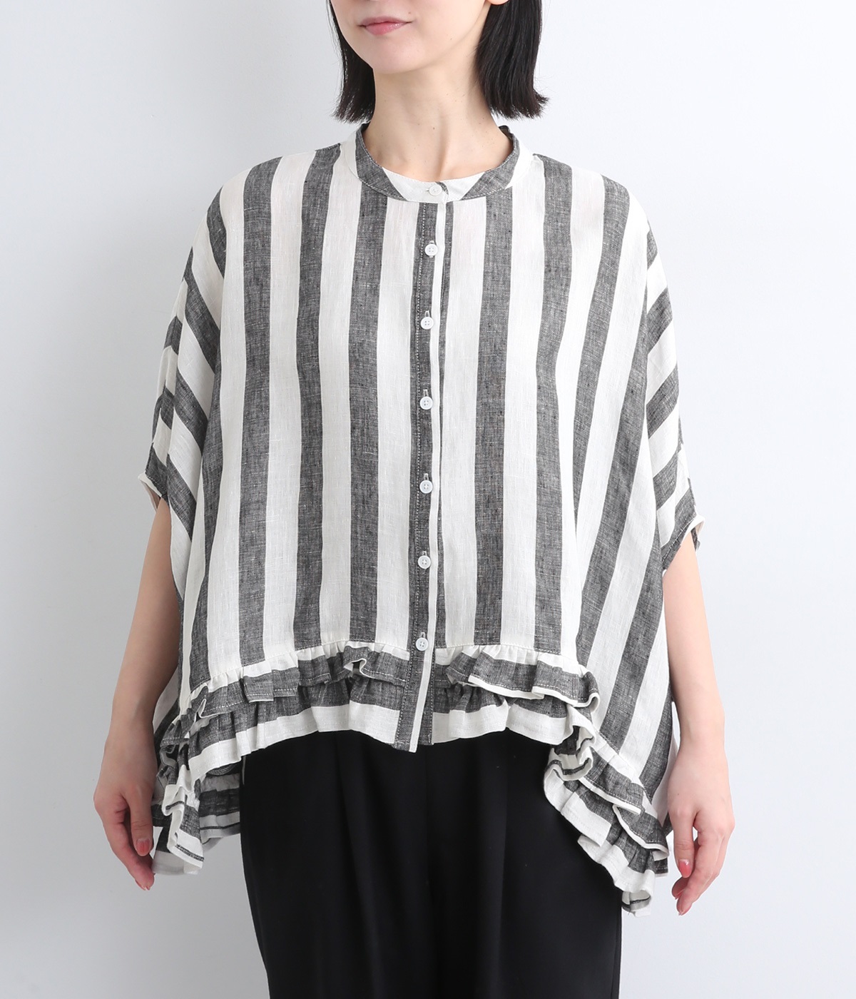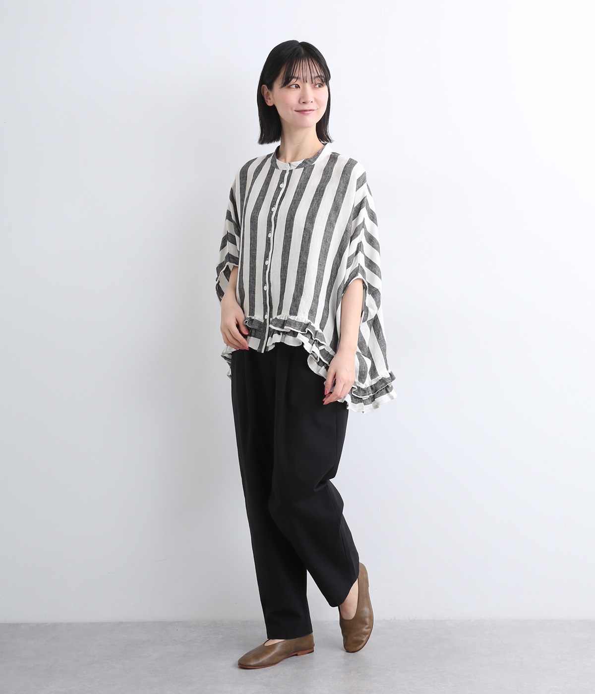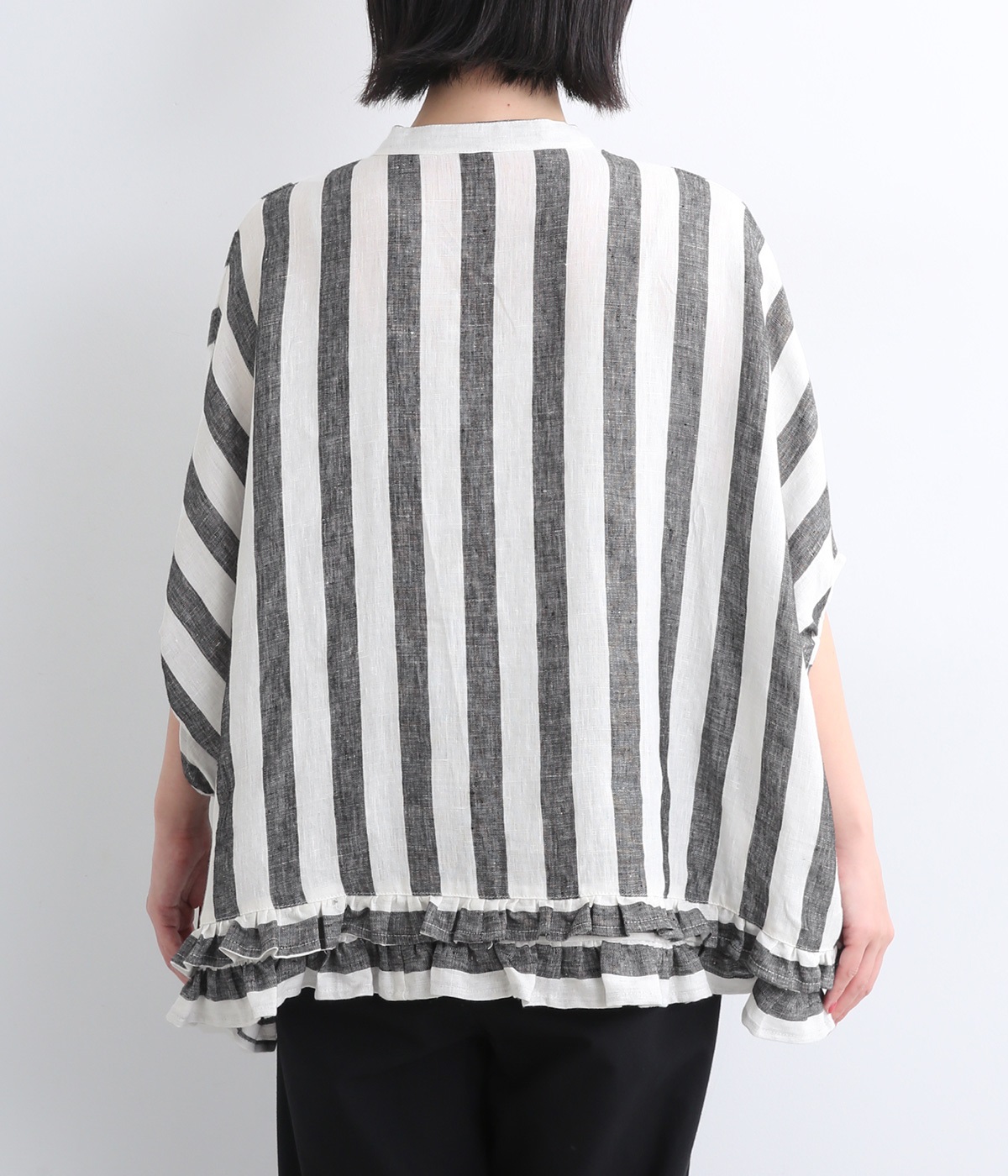 たっぷりと生地を使ったワイドシルエットが存在感を放つブラウス。動くたびにサイドがふわりと広がり、風をはらむようなやわらかな表情に。抜け感を生む前後差ヘムには二段フリルをあしらい、甘さが薫る大人のこなれた着こなしを叶えます。