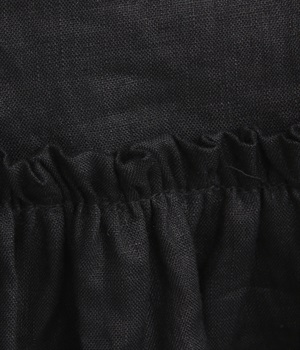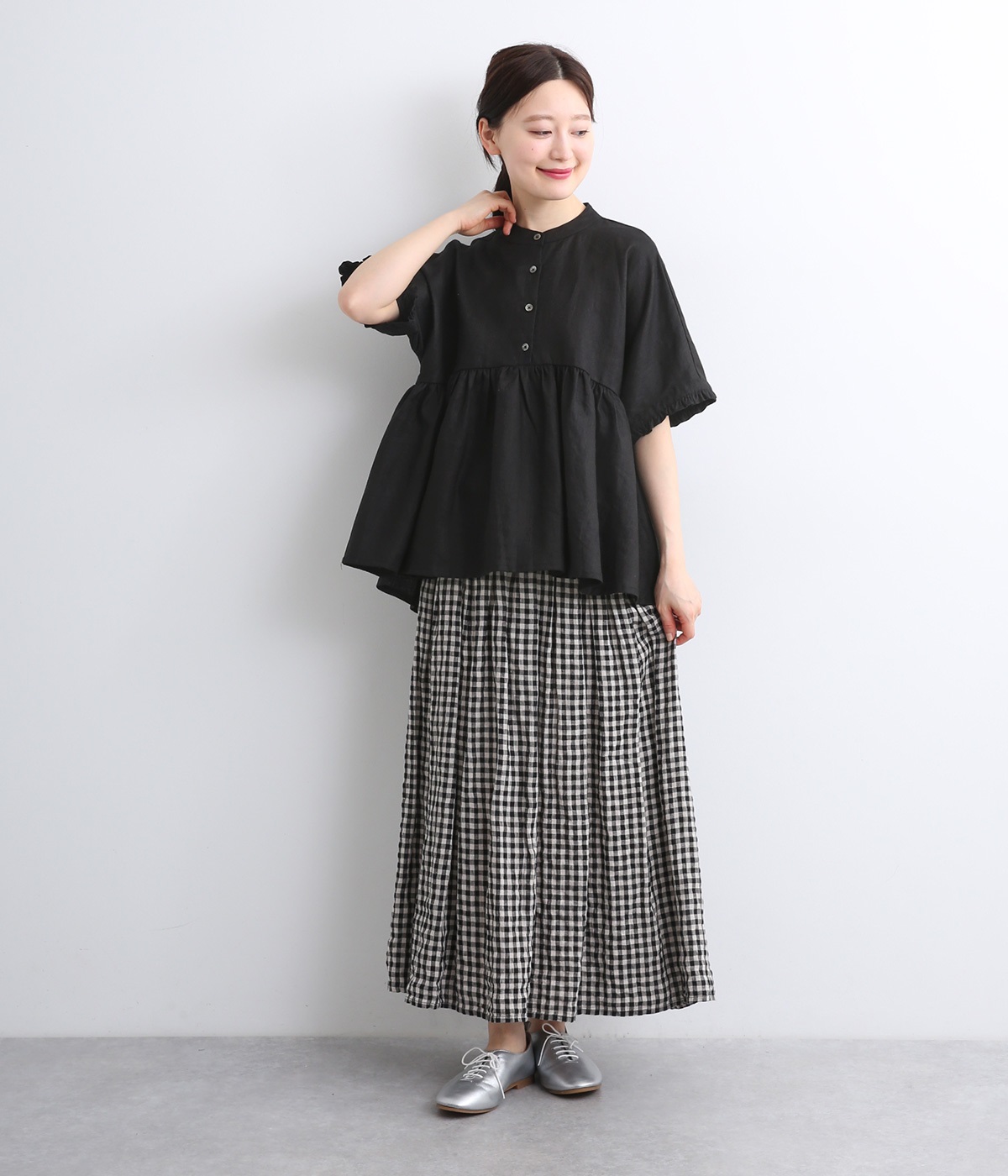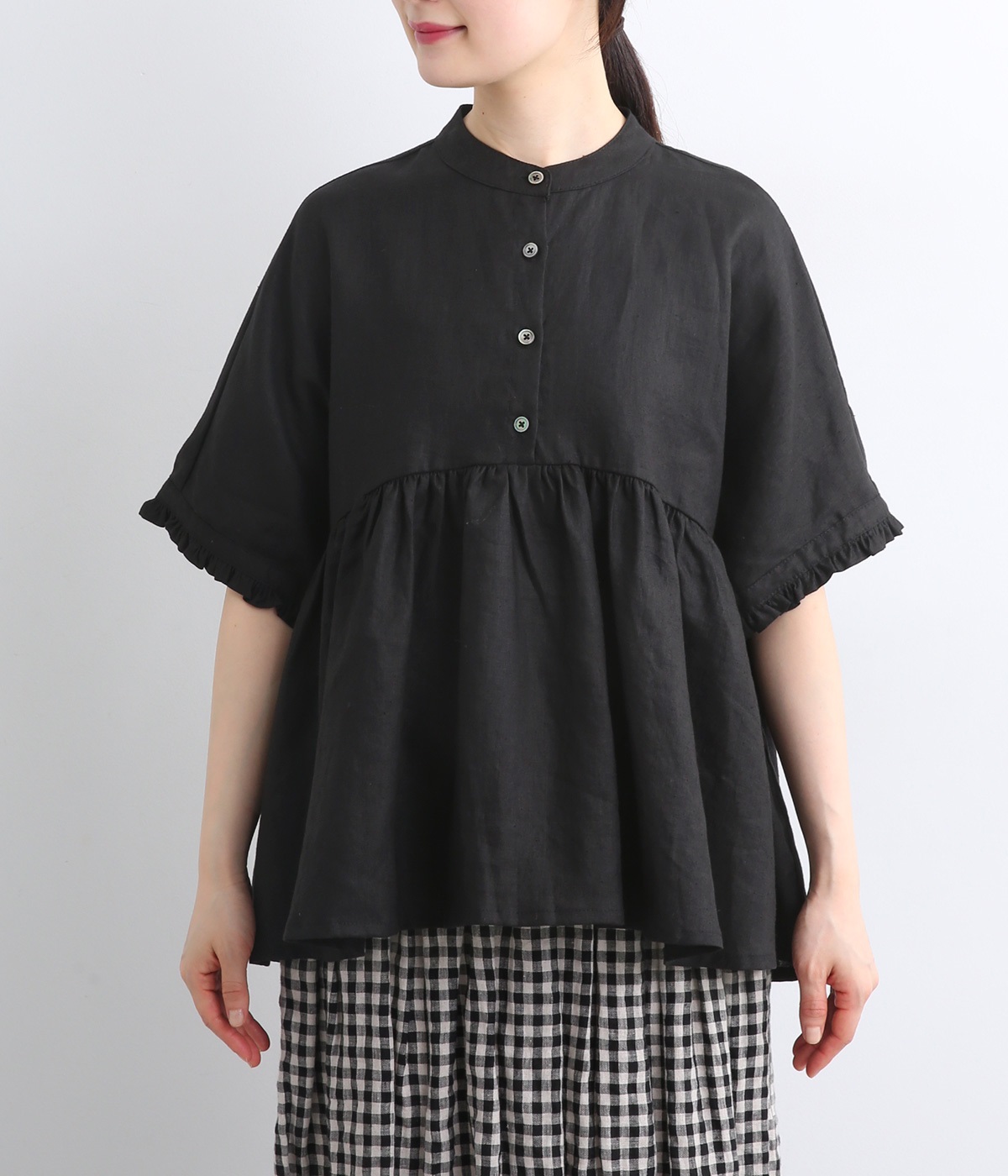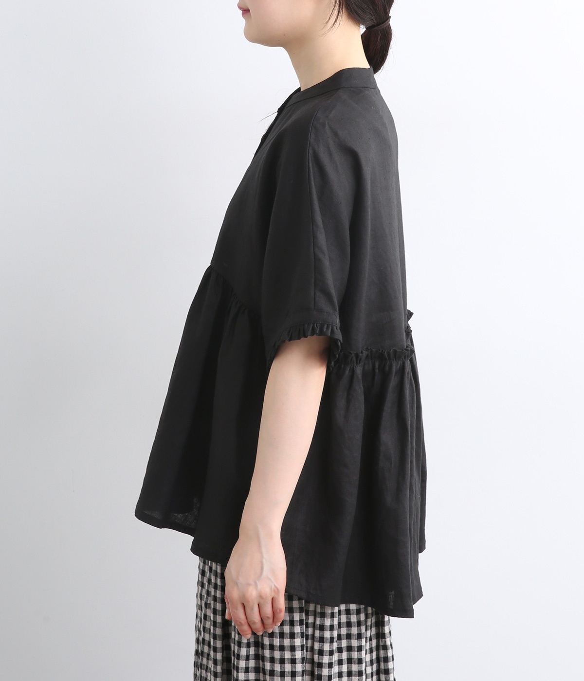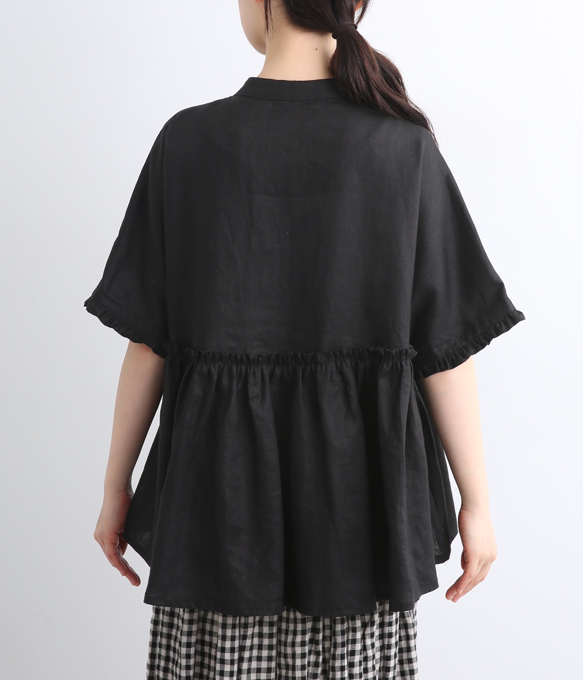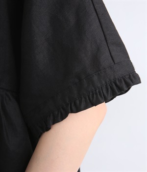 ふんわりと腰まわりをカバーする軽やかなシルエットを描くプルオーバー。袖口と背面のフリルが、甘さを漂わせます。胸元には貝ボタンを配し、さりげない艶めきをプラス。動くたびに揺らめくドレープに気分も上がります。