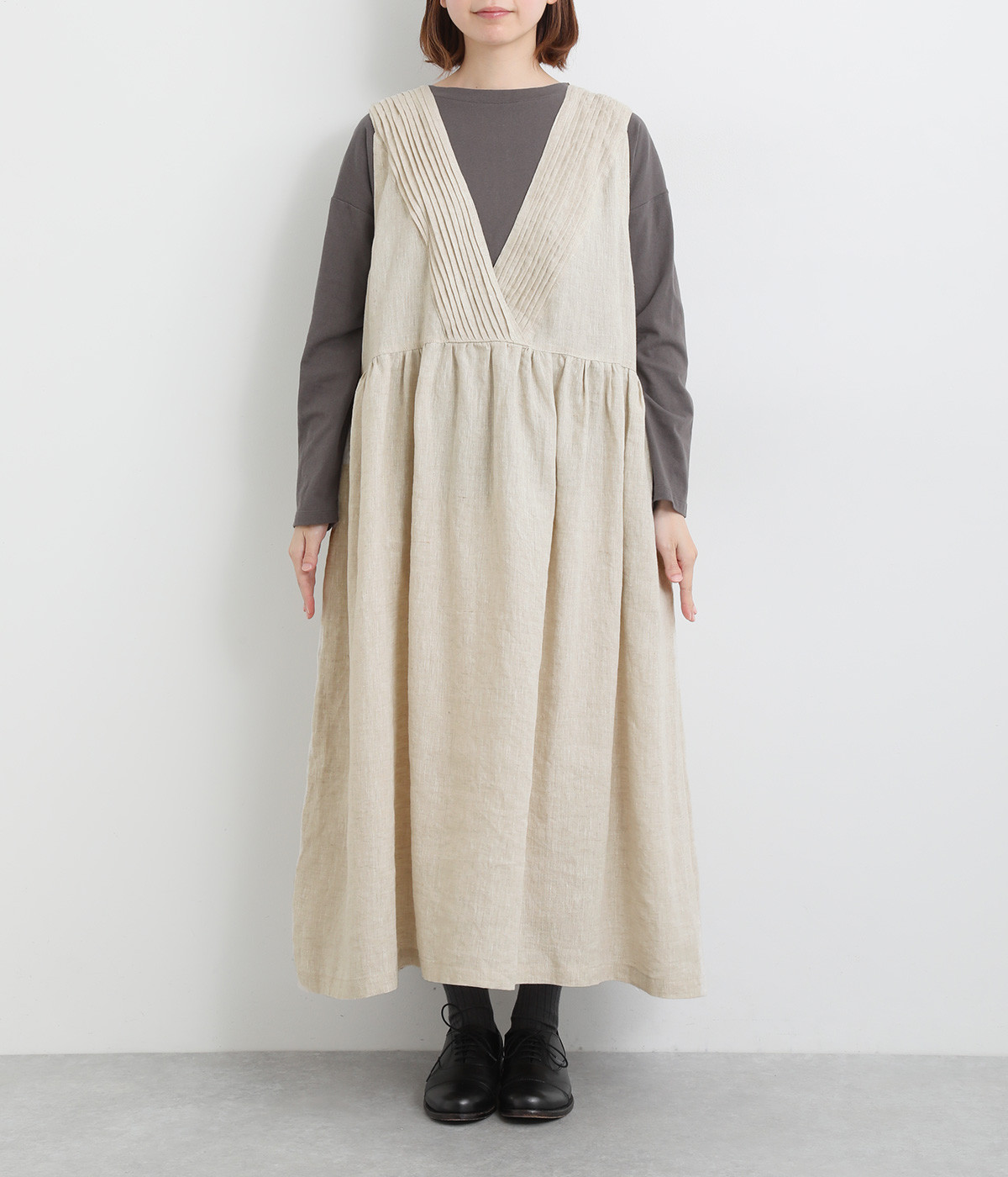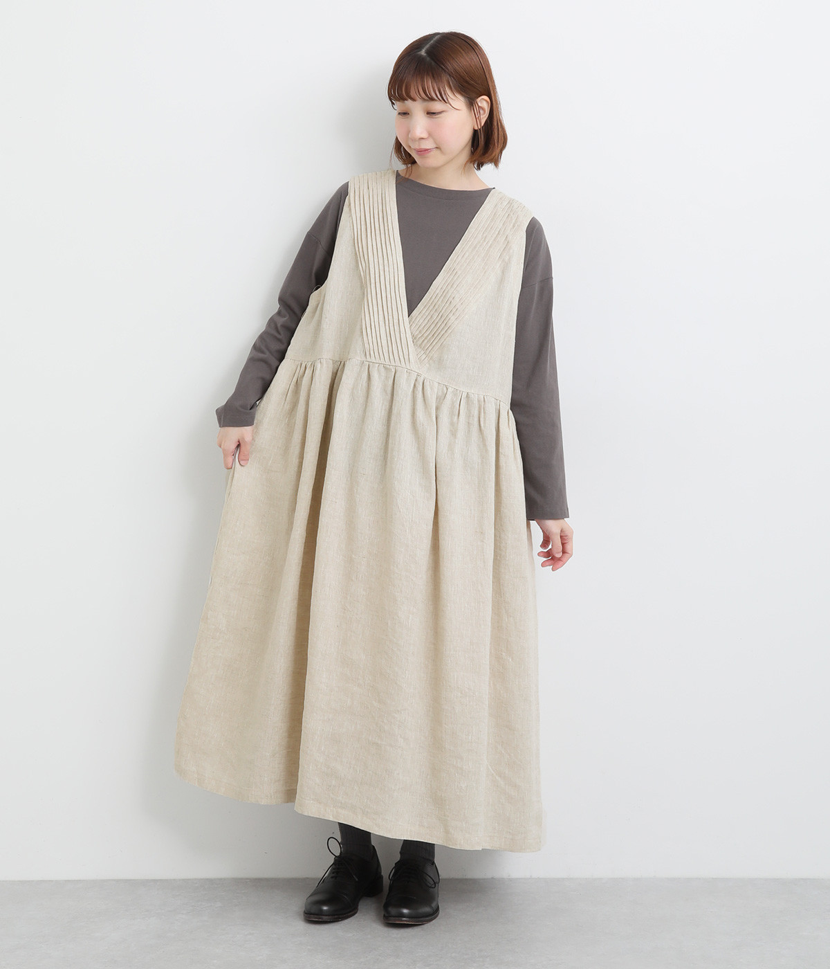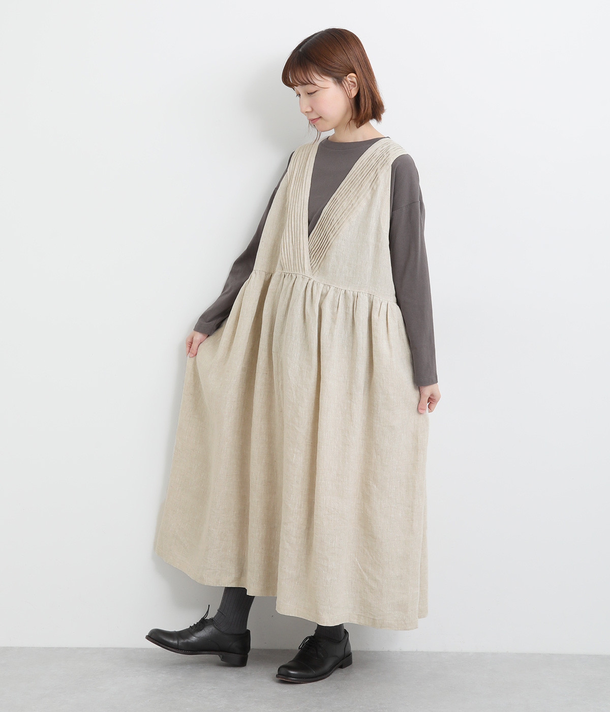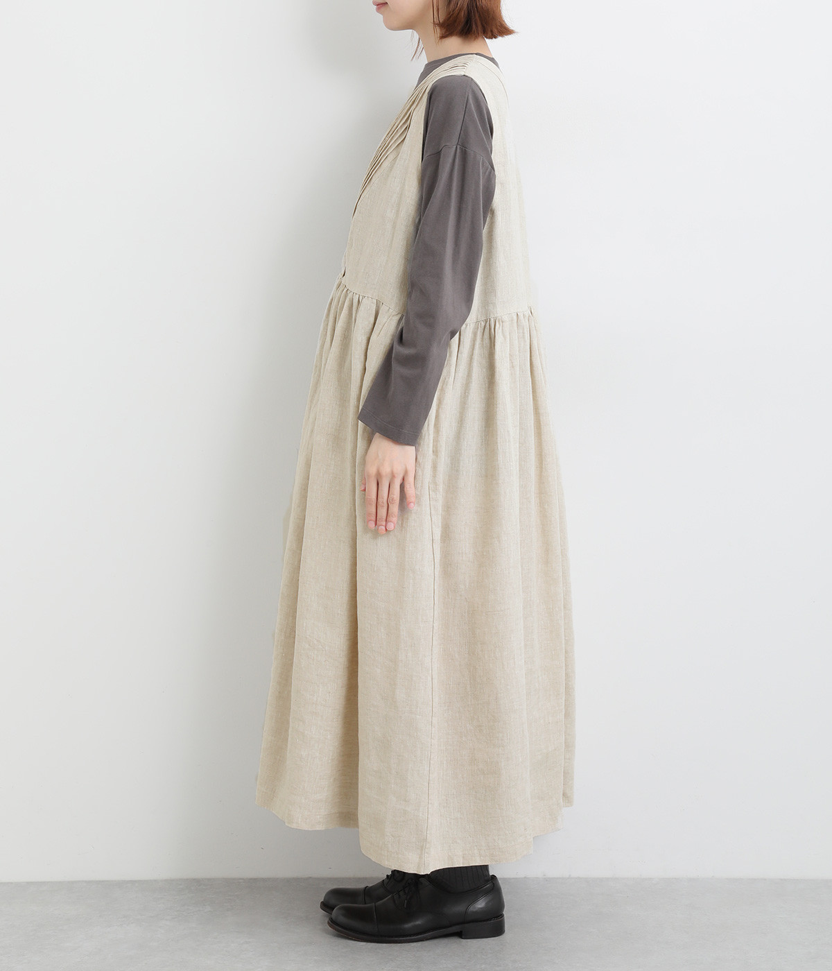 切り替えにギャザーを入れたゆとりのあるシルエット