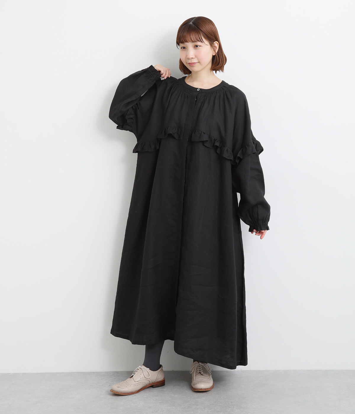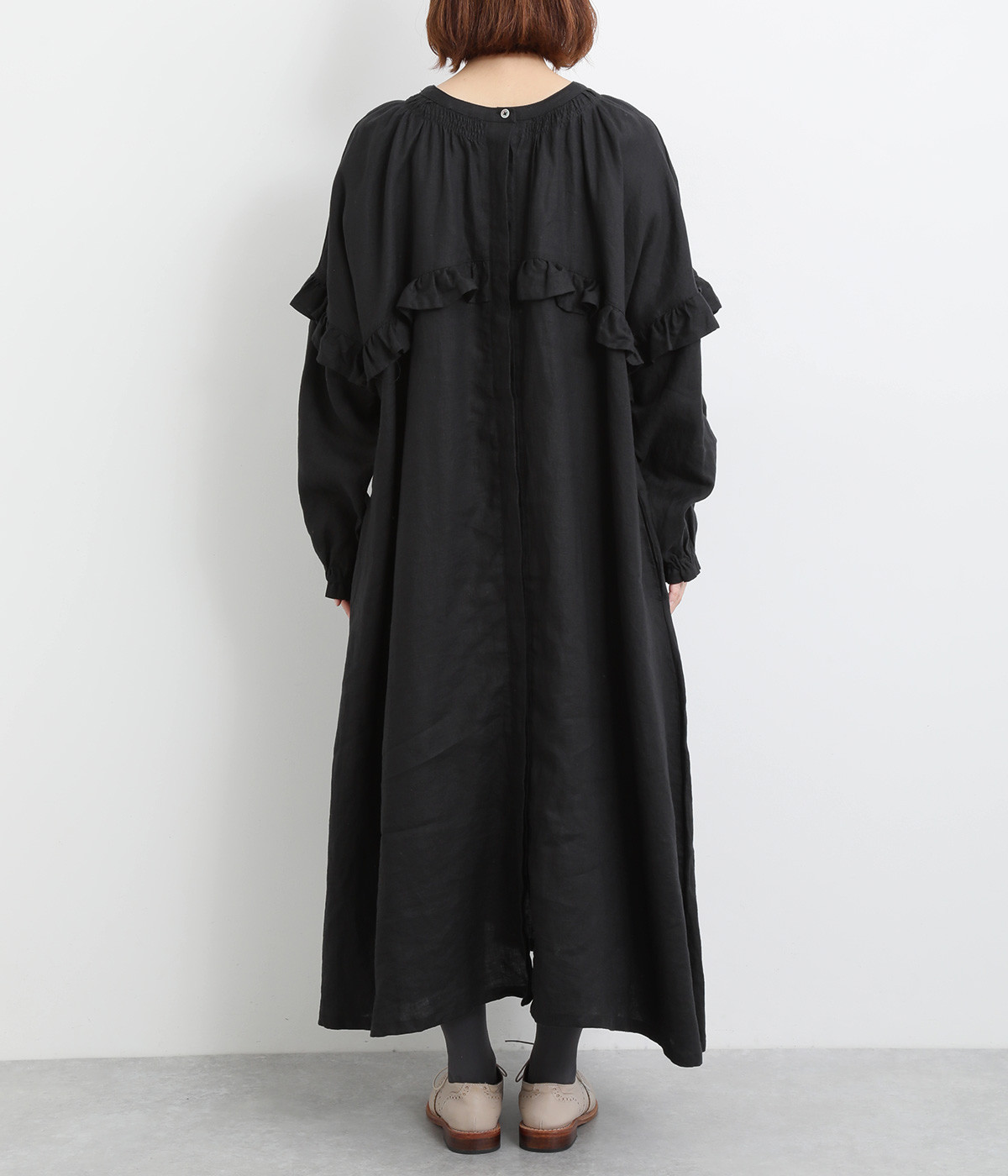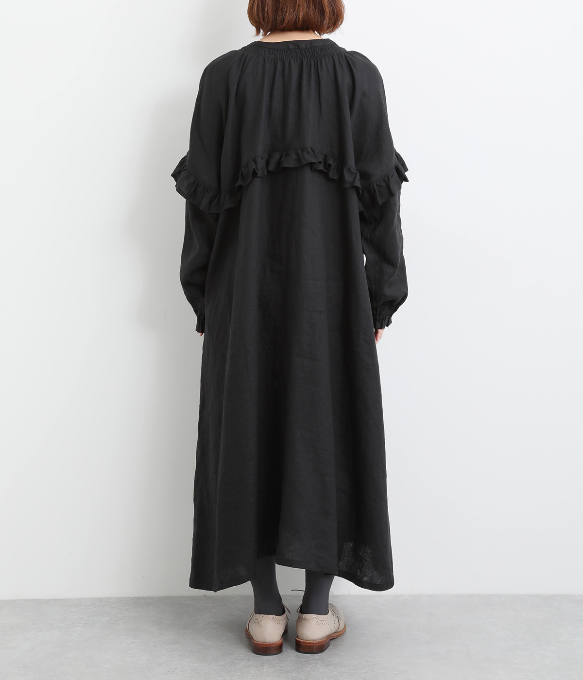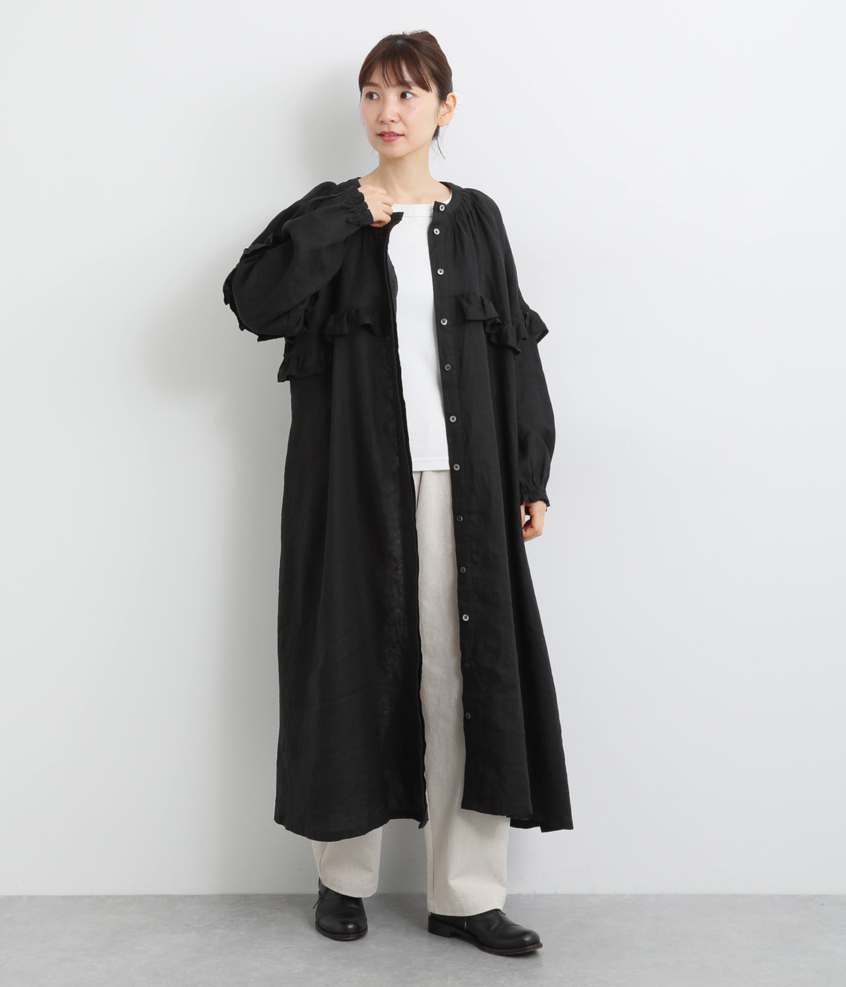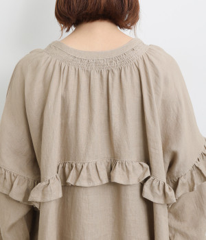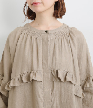 ゆったりフレアなシルエットに大胆なフリルディテールが目を惹く一着