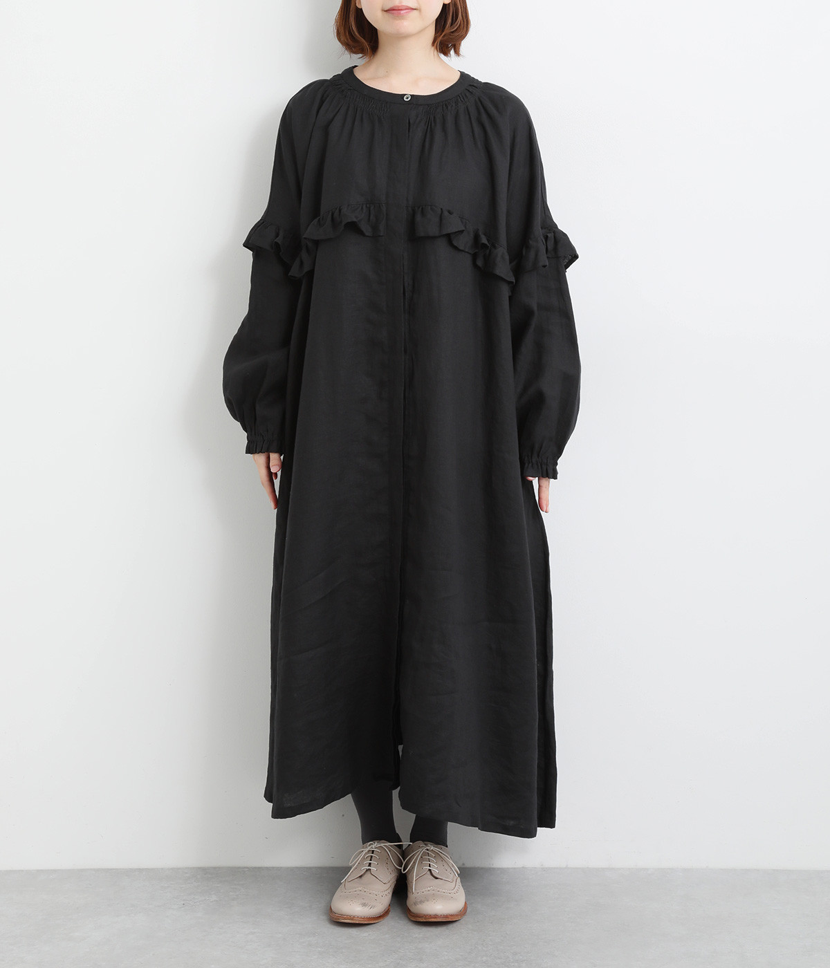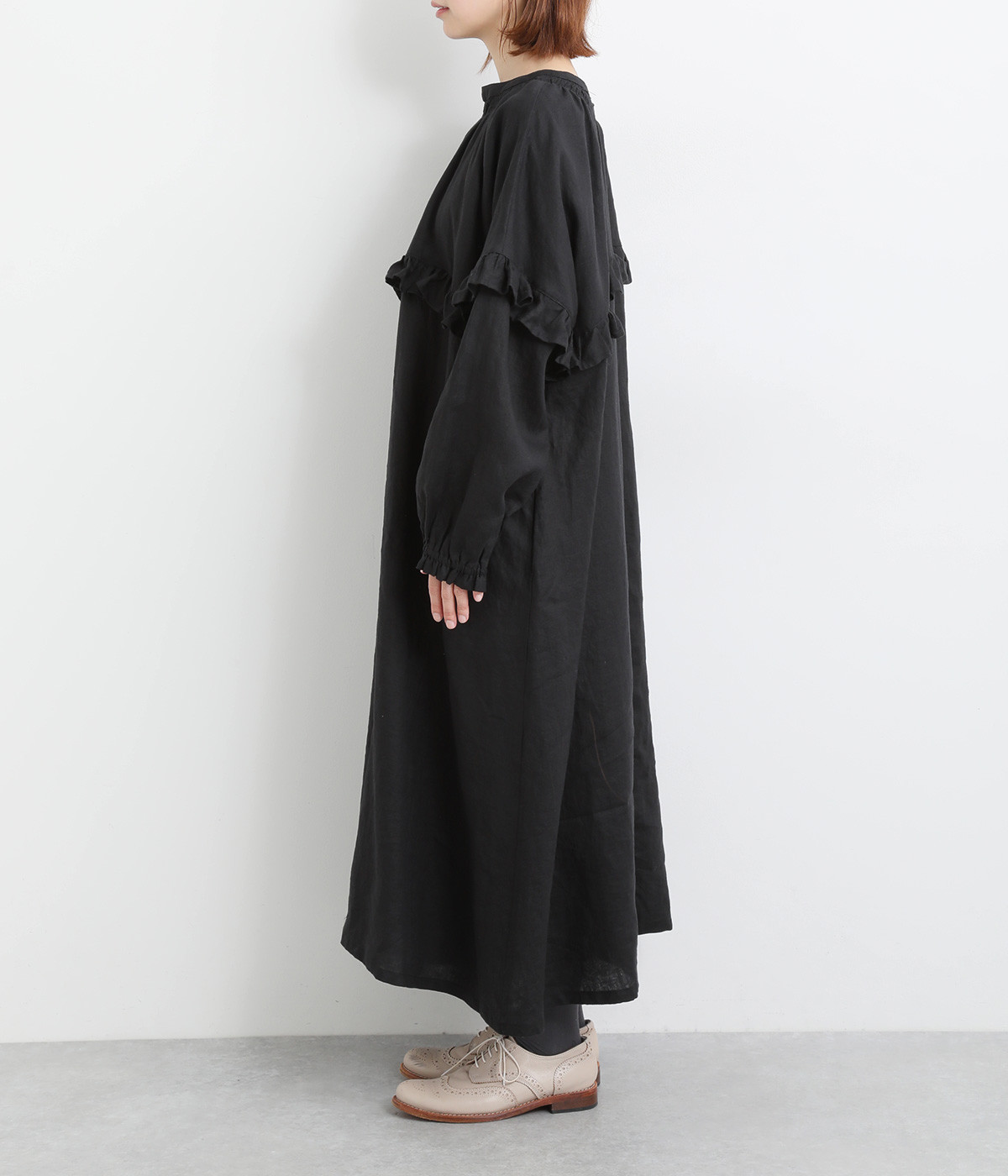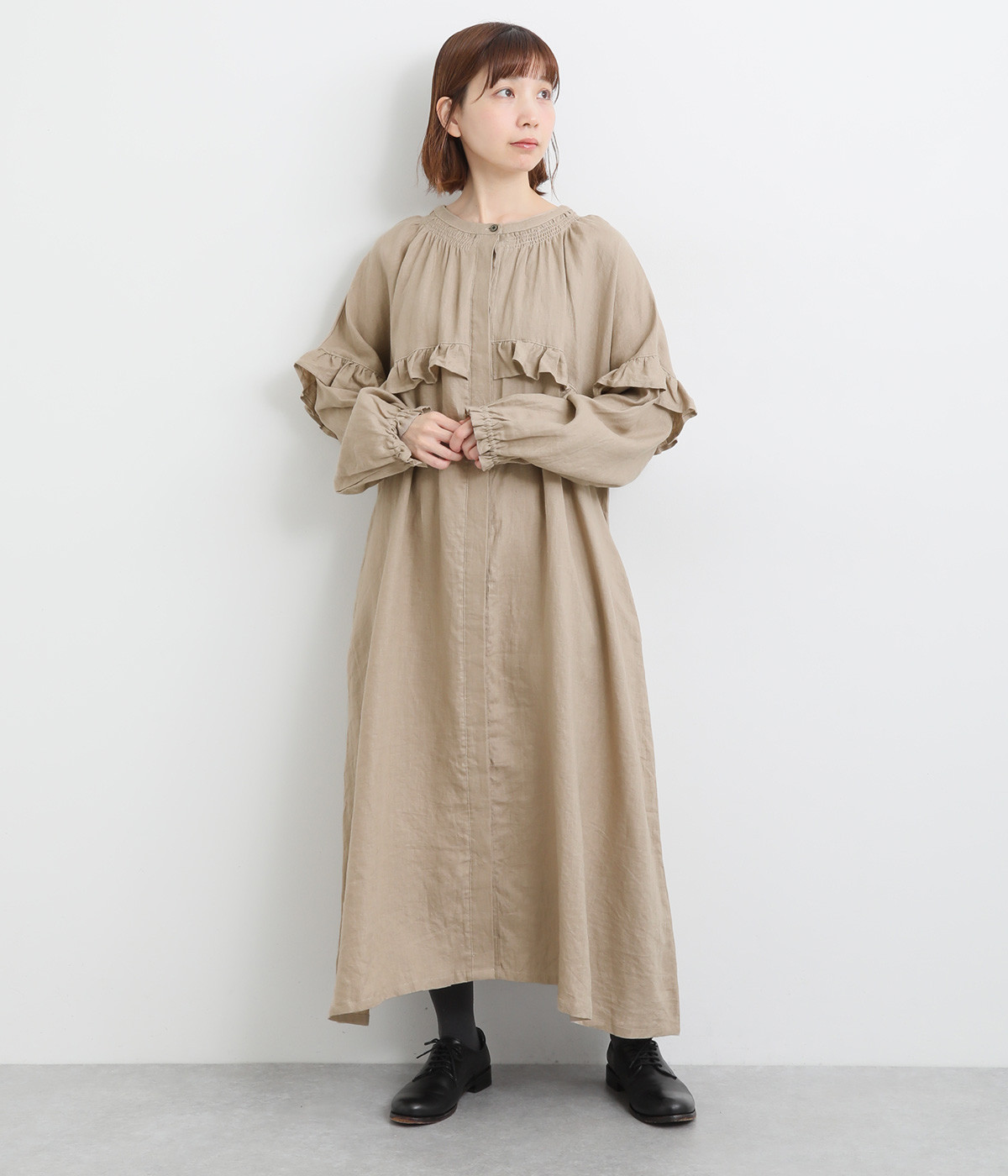 ゆったりフレアなシルエットに大胆なフリルディテールが目を惹く一着