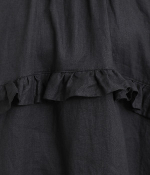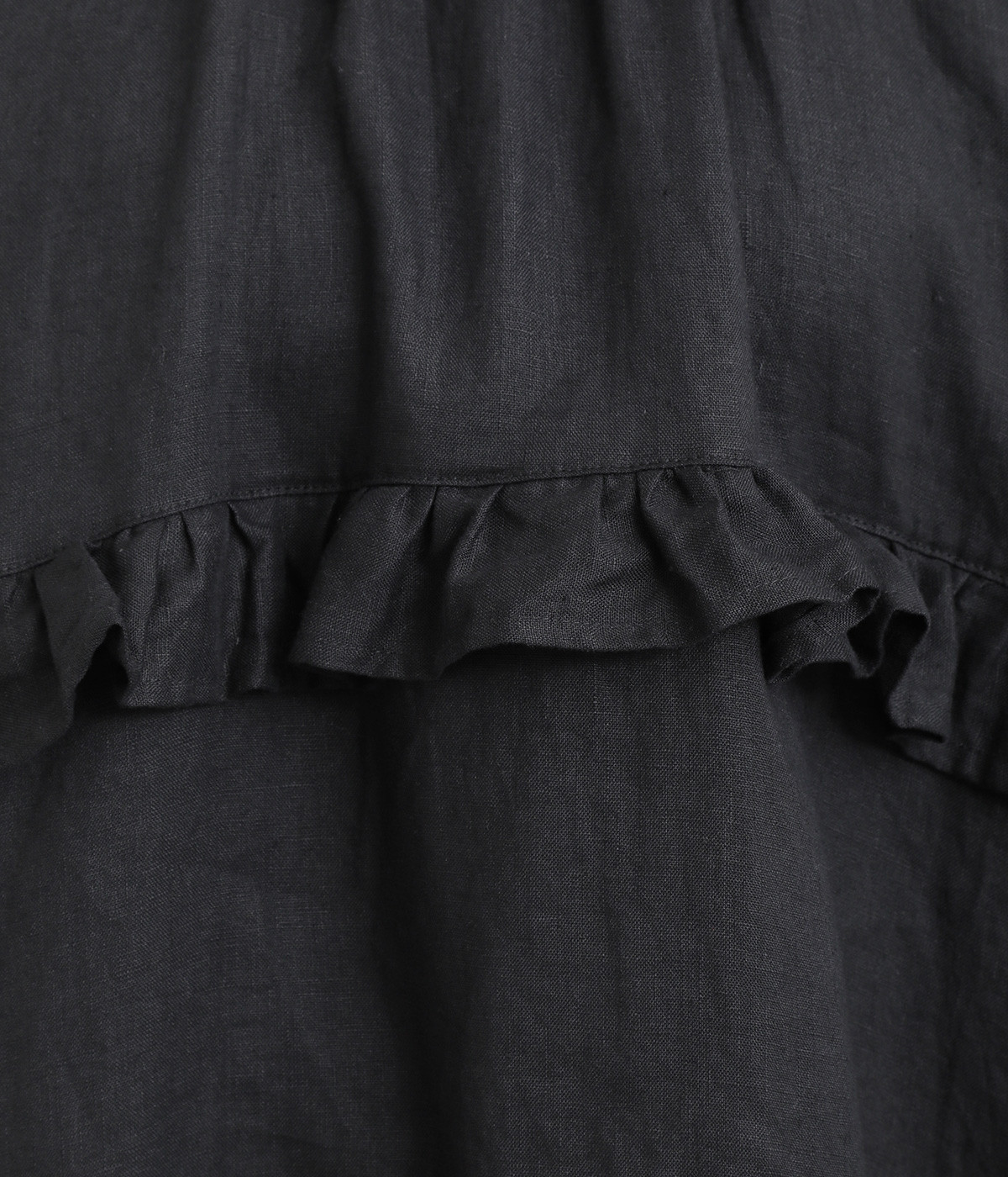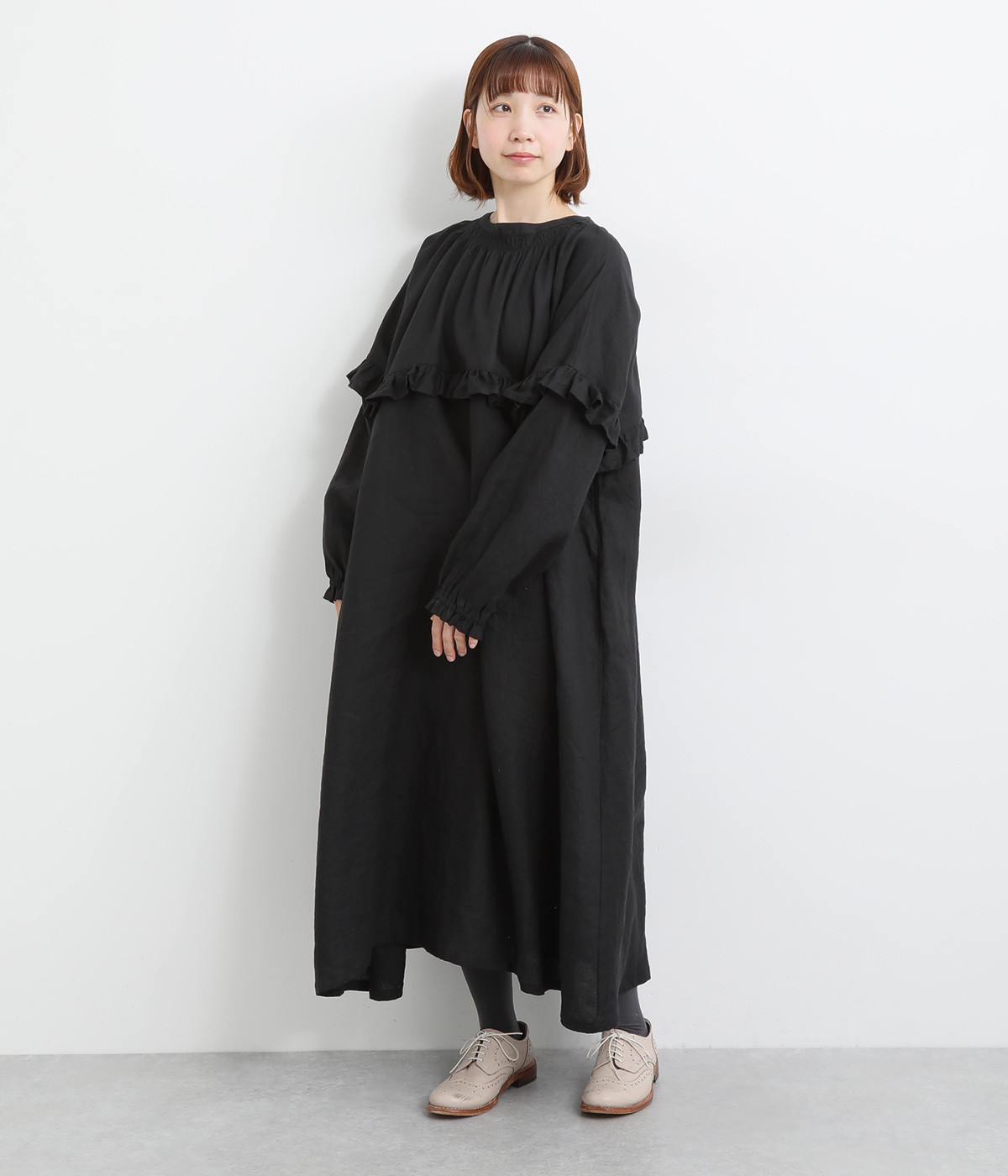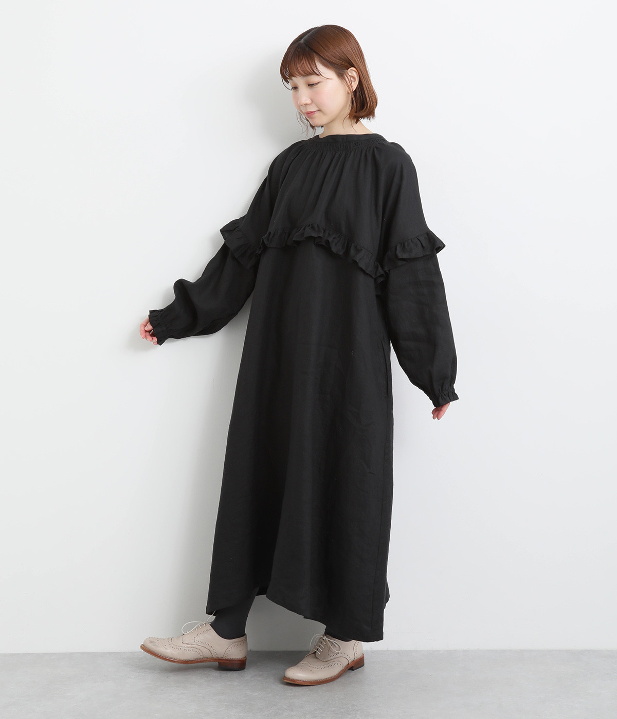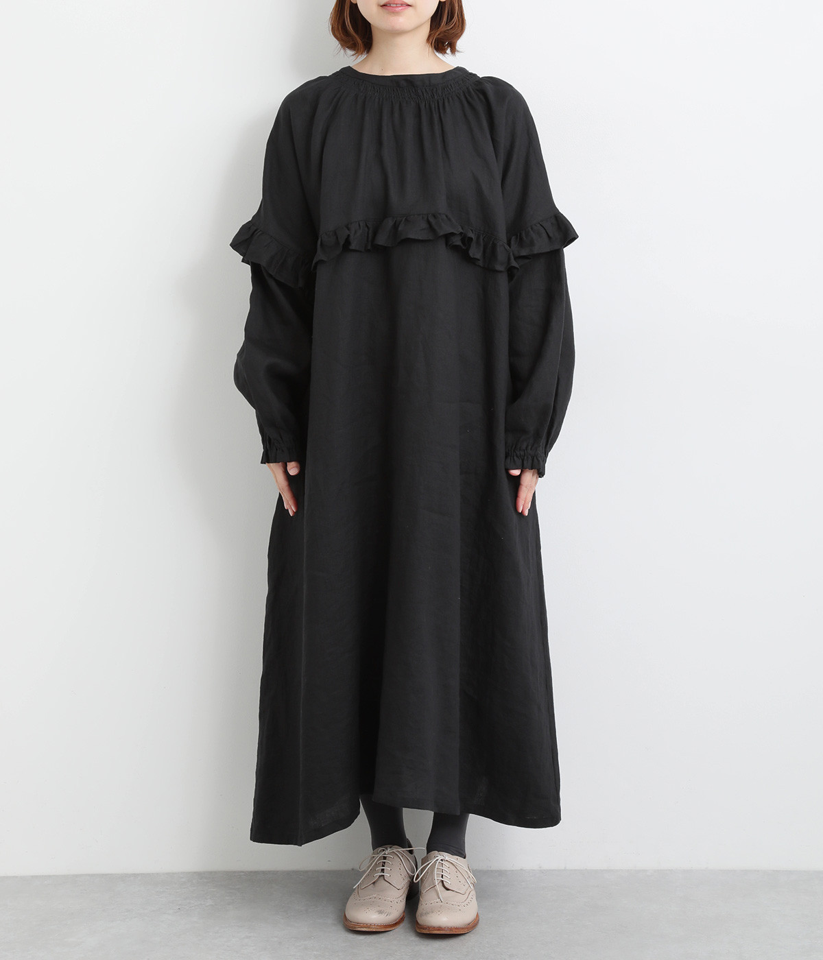 ゆったりフレアなシルエットに大胆なフリルディテールが目を惹く一着