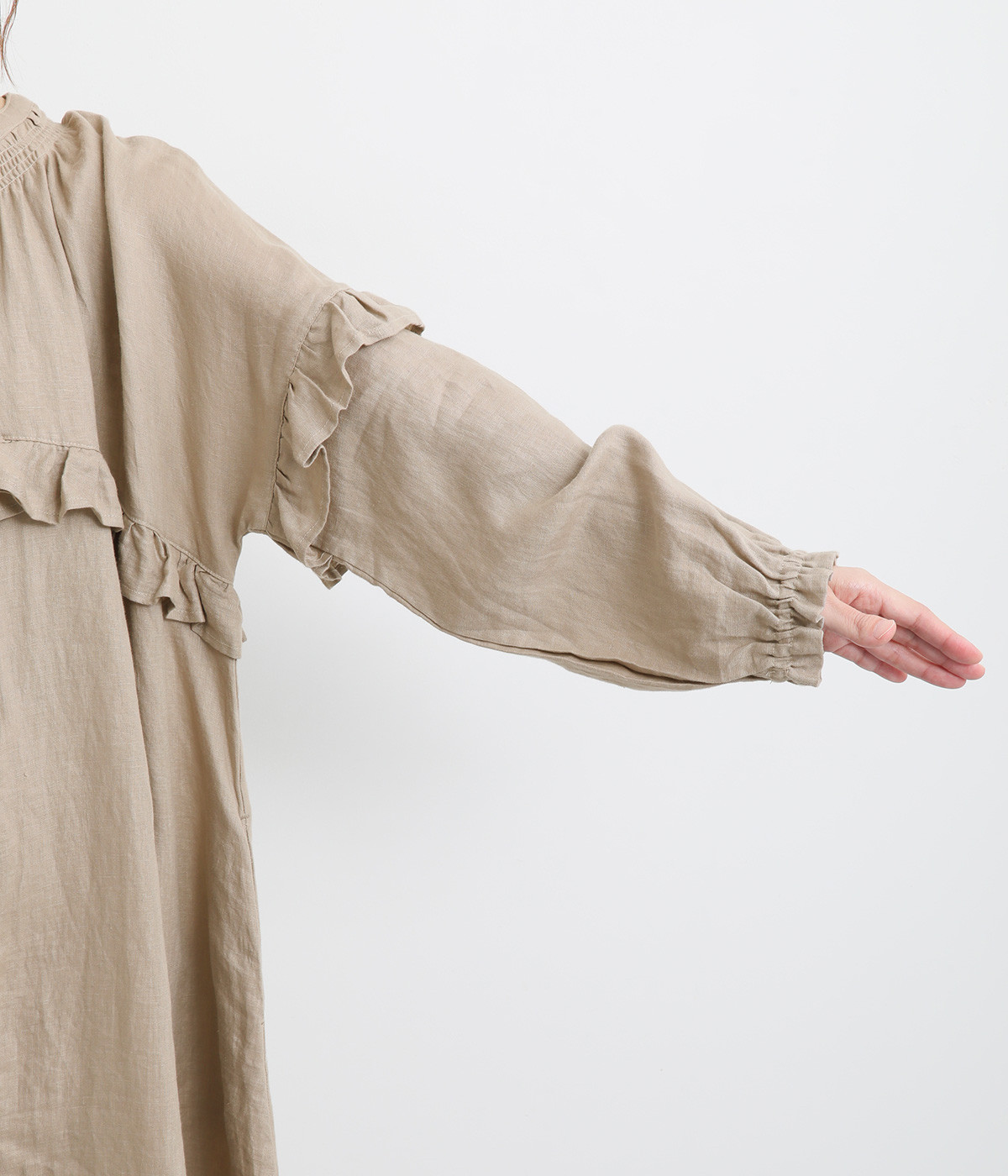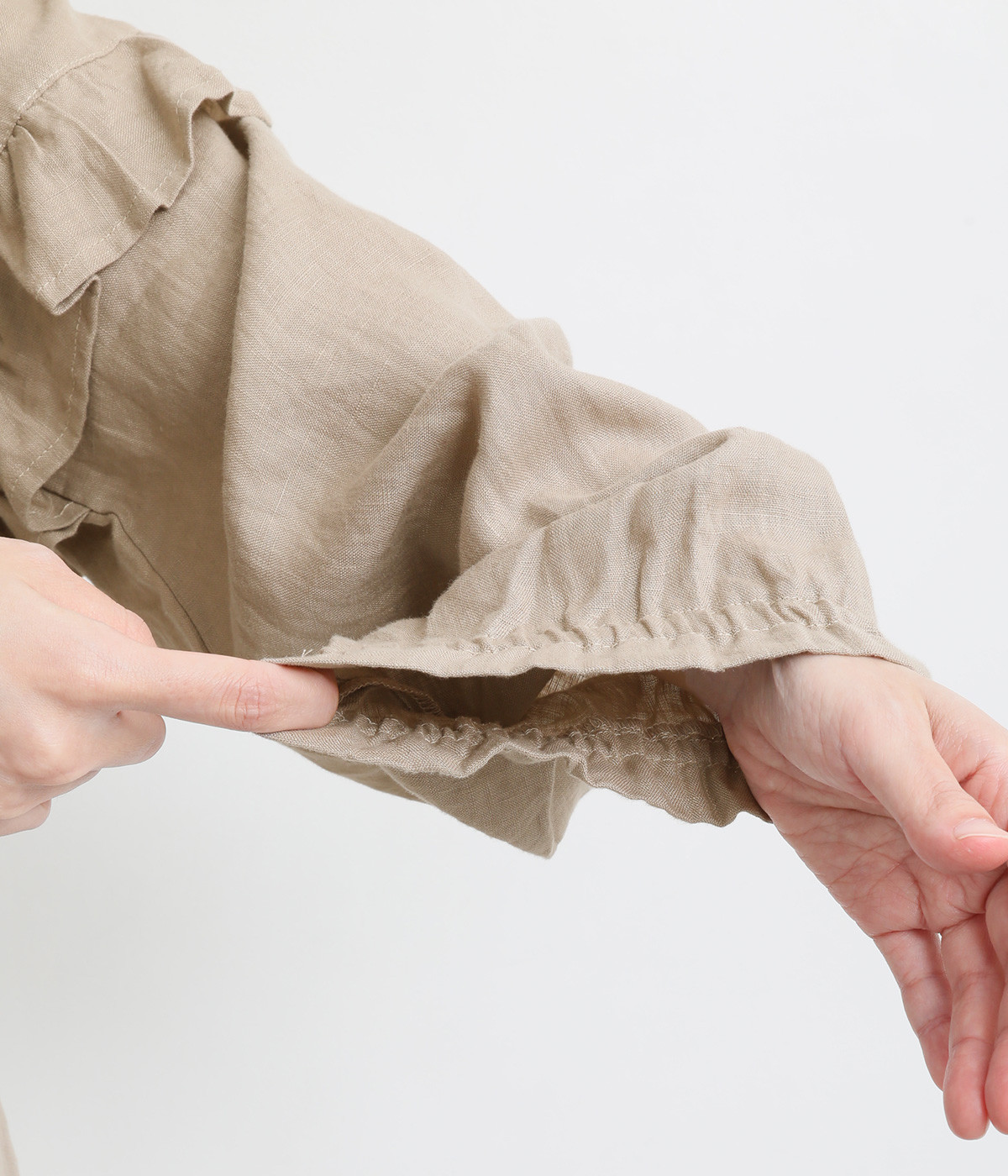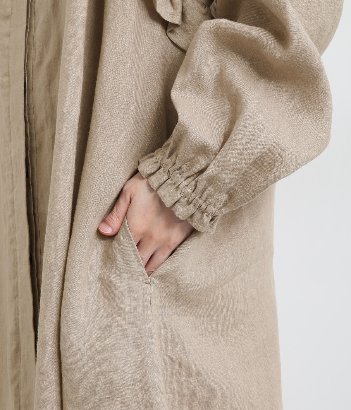 袖口はゴムシャーリングでたくし上げのアレンジも