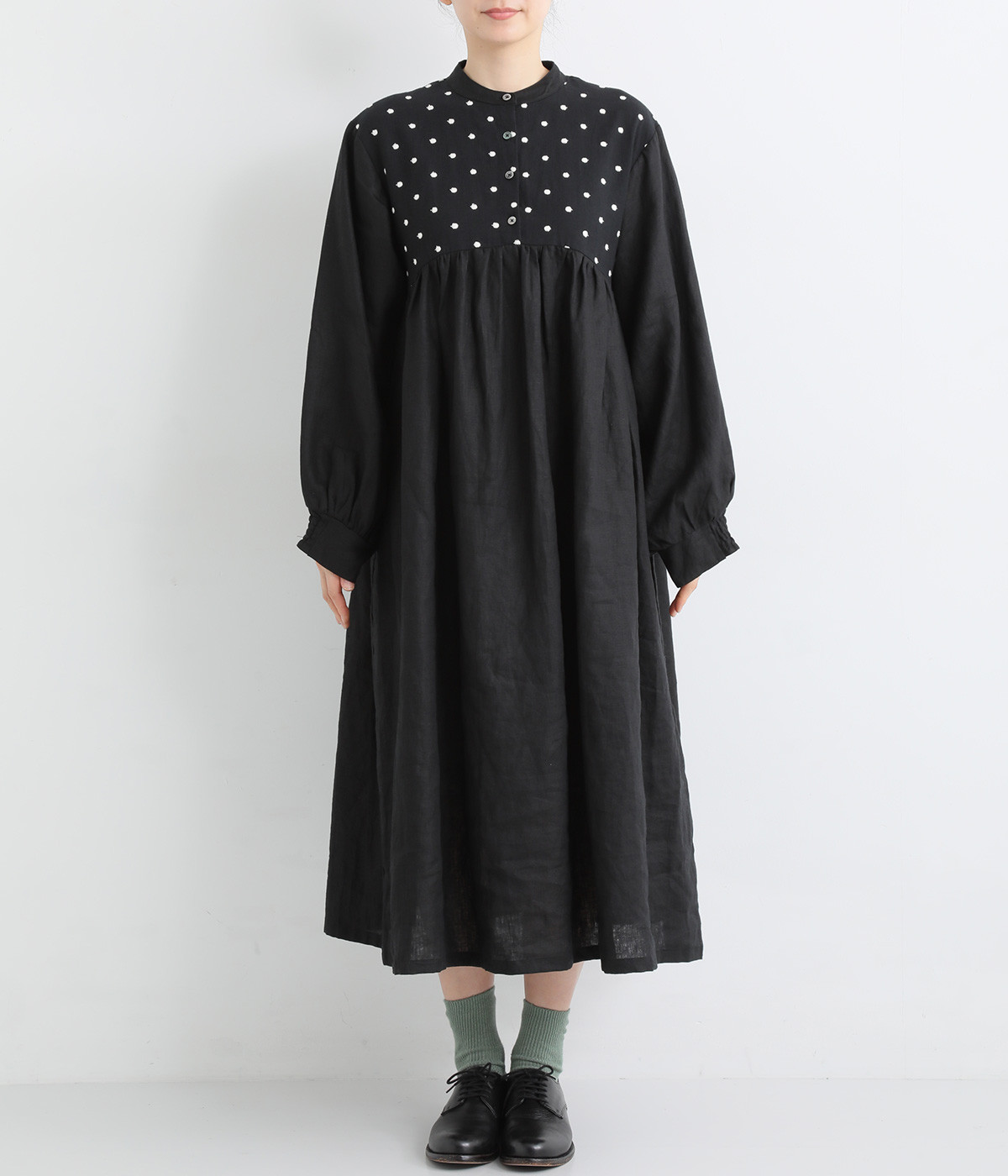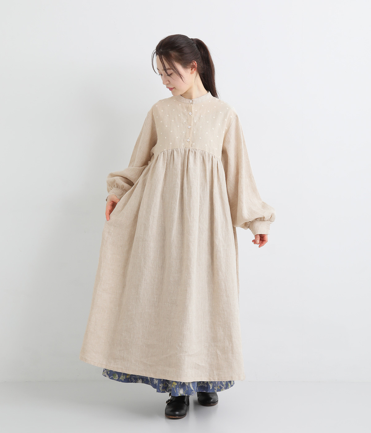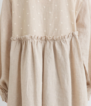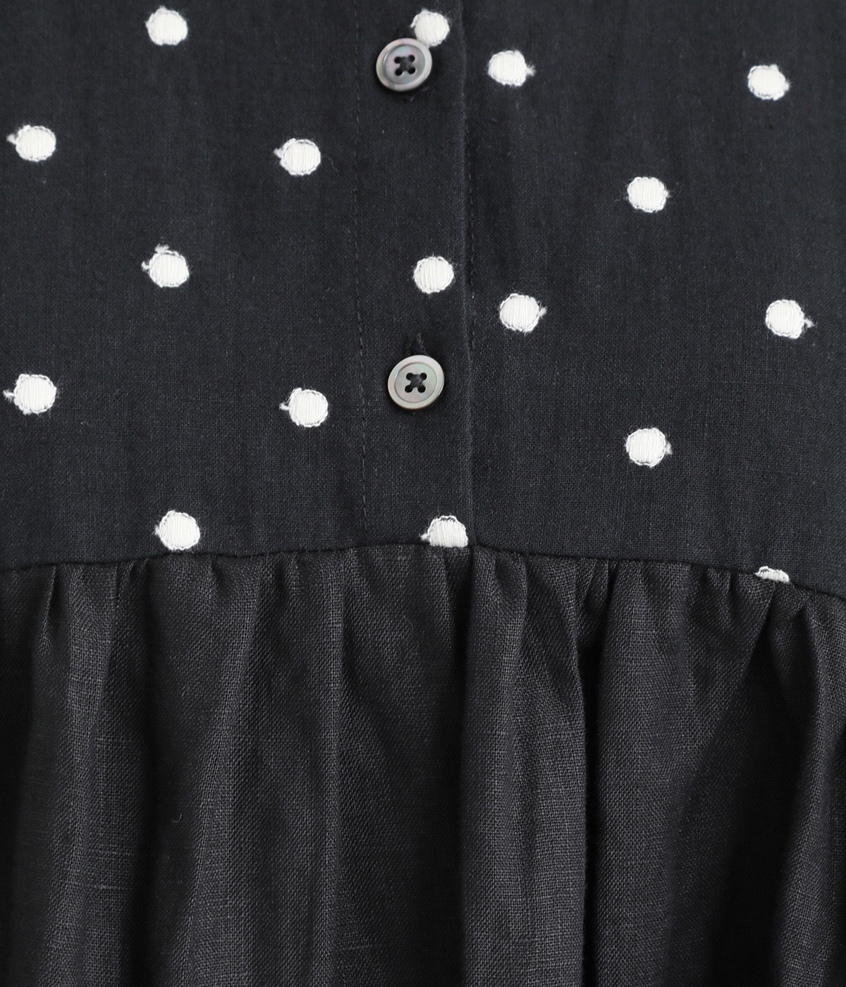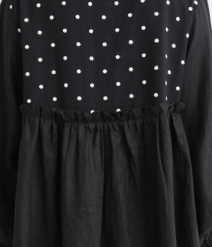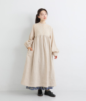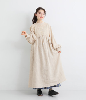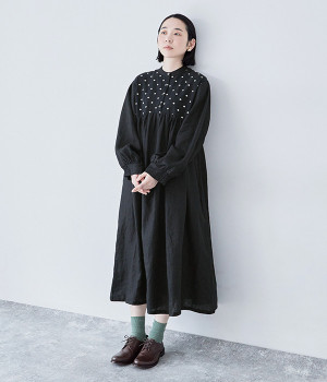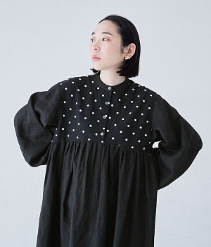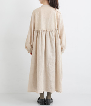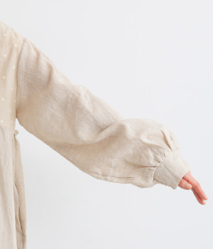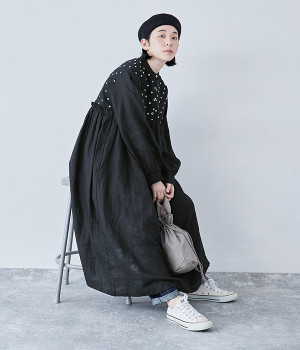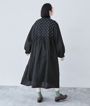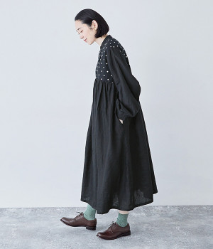 洗いざらしのナチュラルな風合いが楽しめるリネンを使用。ほどよい厚みで通年対応可能です。トップス部分はドットの刺しゅう生地で切り替えてアクセントに。