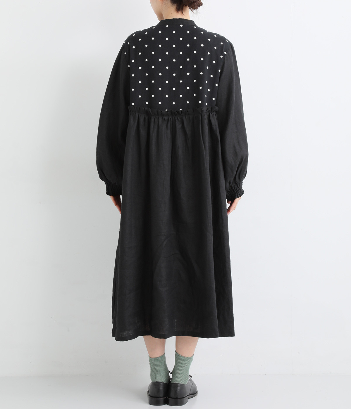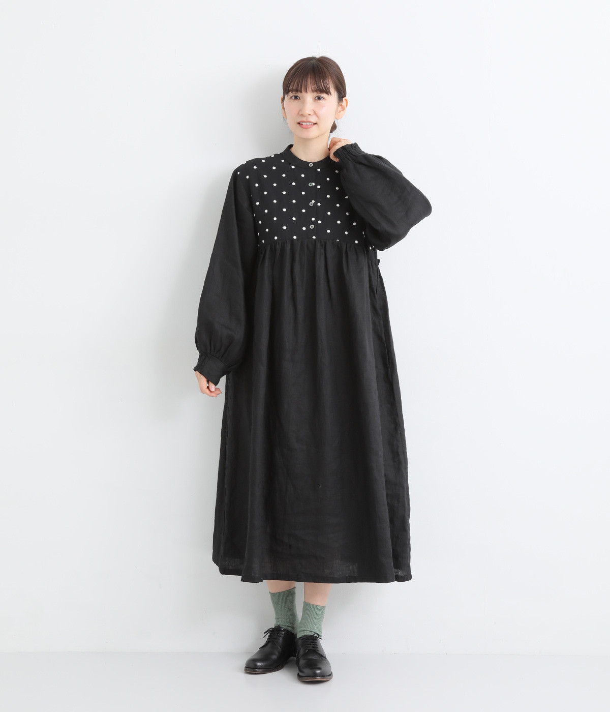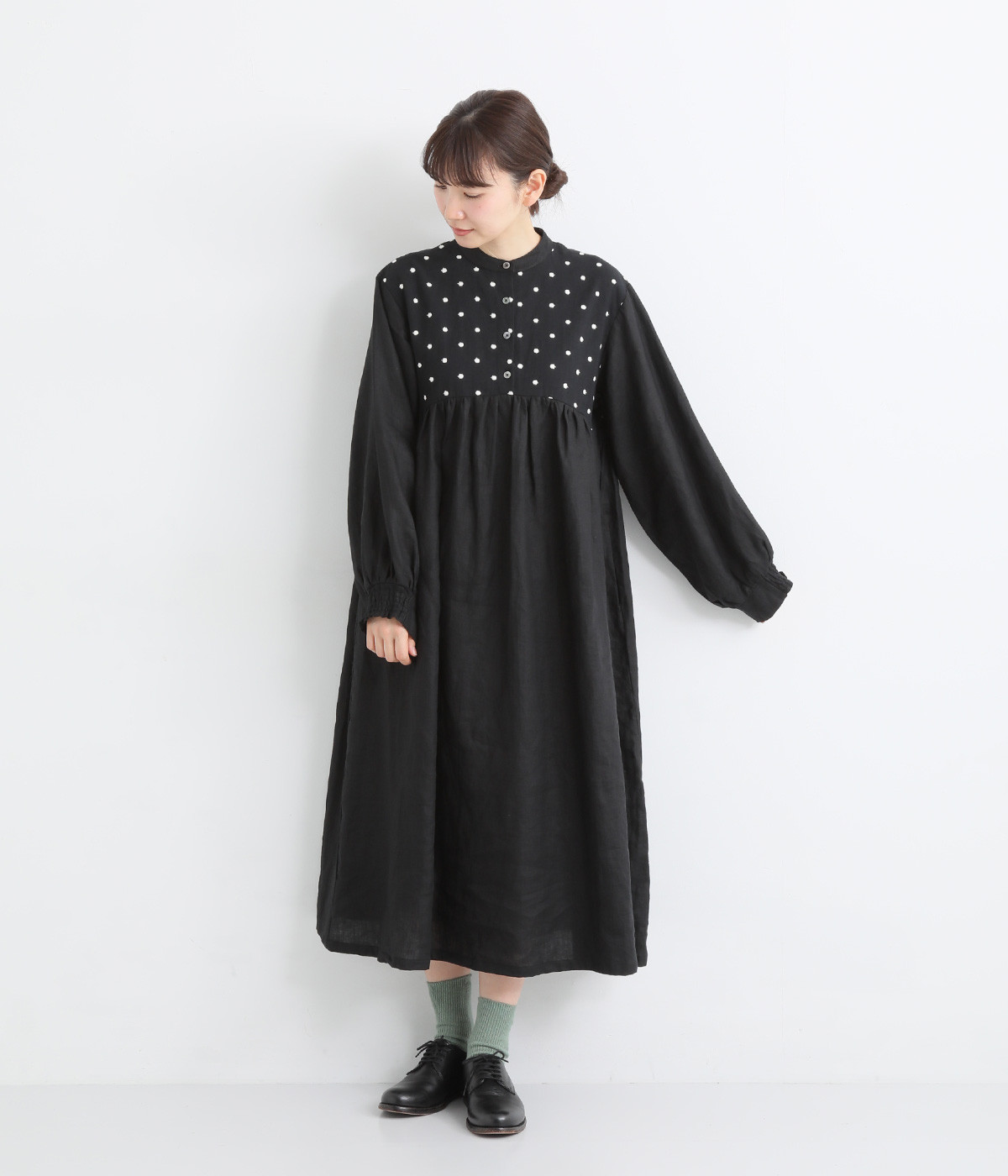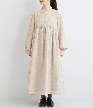 洗いざらしのナチュラルな風合いが楽しめるリネンを使用。ほどよい厚みで通年対応可能です。トップス部分はドットの刺しゅう生地で切り替えてアクセントに。