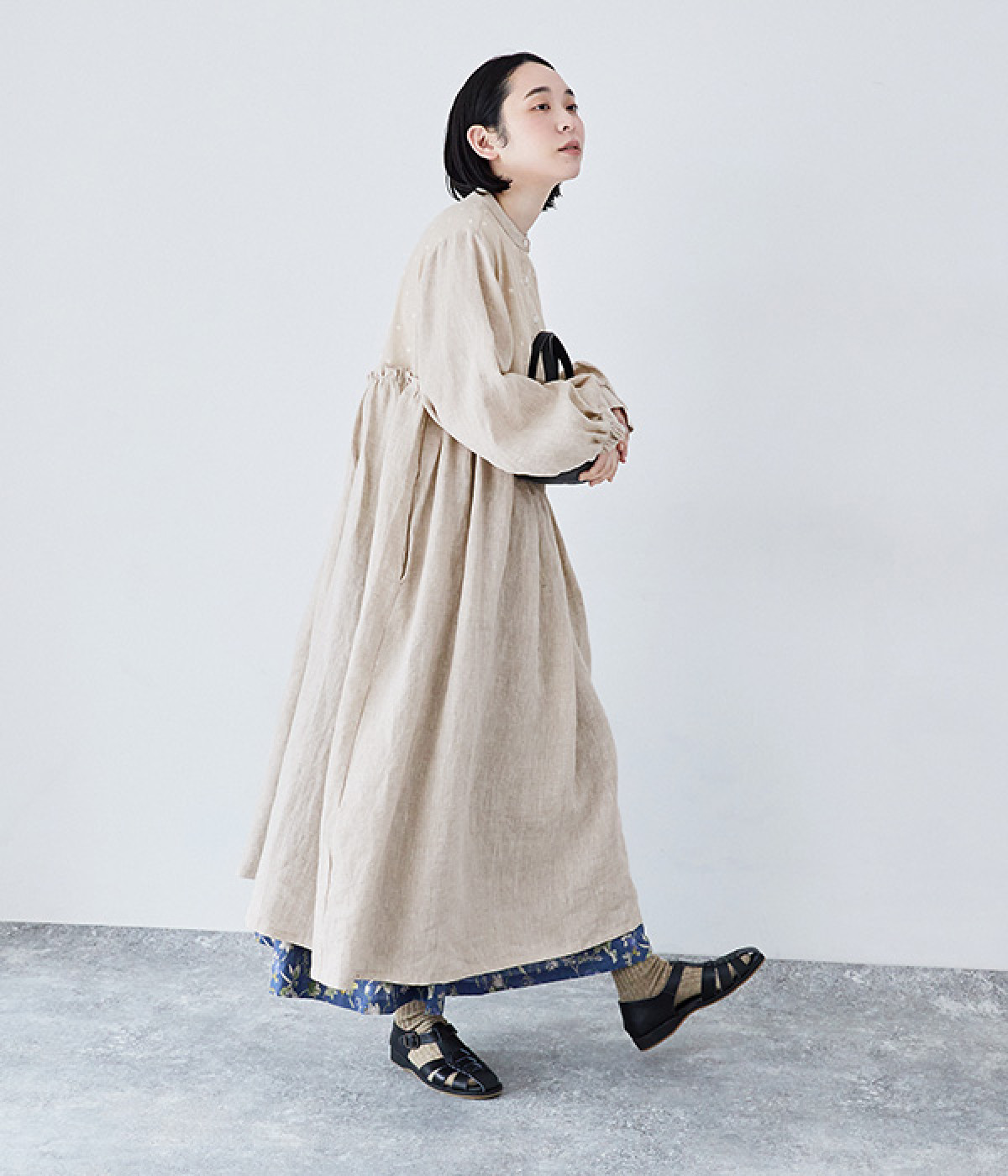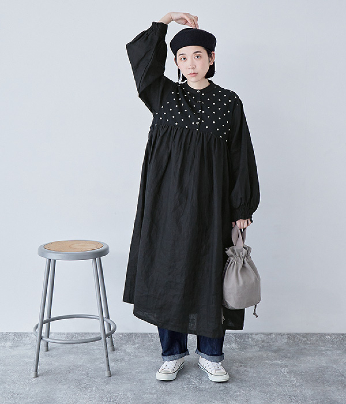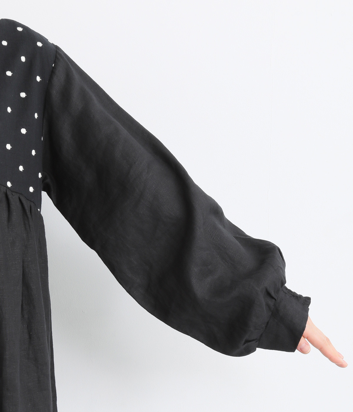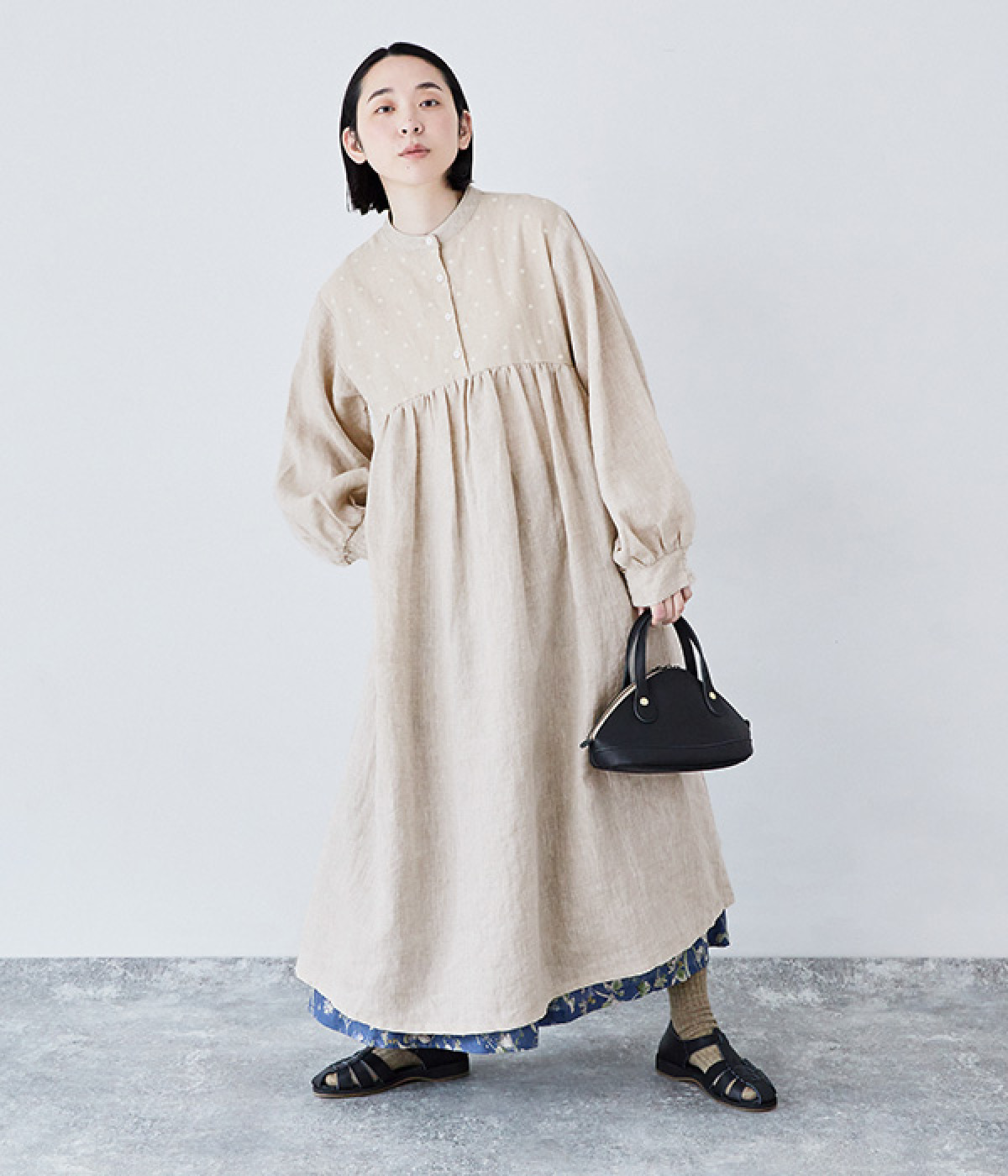 洗いざらしのナチュラルな風合いが楽しめるリネンを使用。ほどよい厚みで通年対応可能です。トップス部分はドットの刺しゅう生地で切り替えてアクセントに。