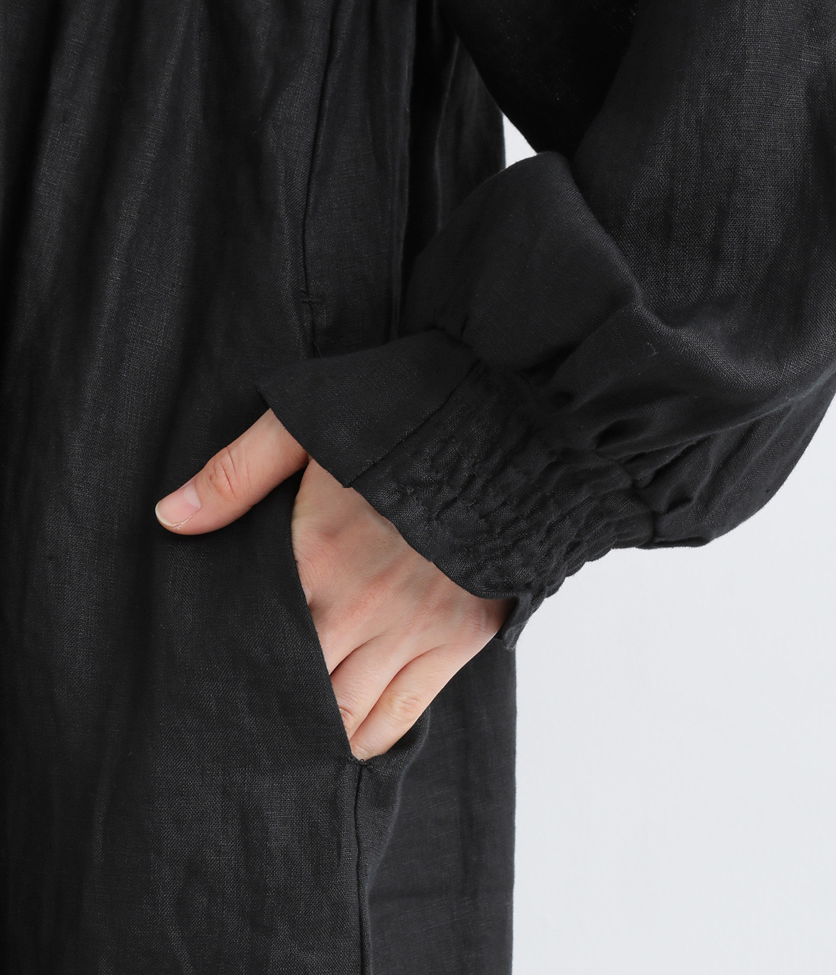 襟元はすっきりとしたバンドカラー、袖口は半面ゴム入りのシャーリングを施した、メリハリのあるデザイン。胸元のギャザーから裾にかけて広がり、華やかな印象を与えてくれます。後ろの切り替え部分はフリルになった、ディテールにこだわった一枚。