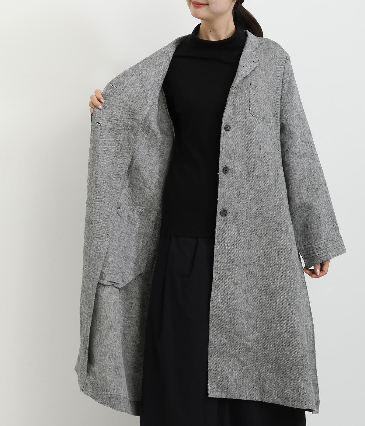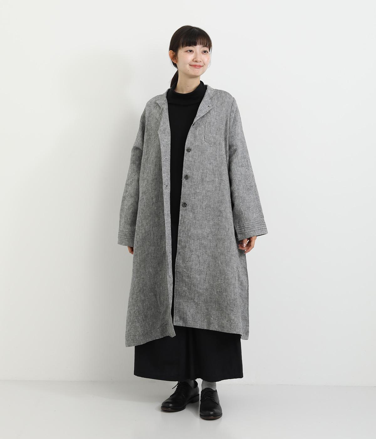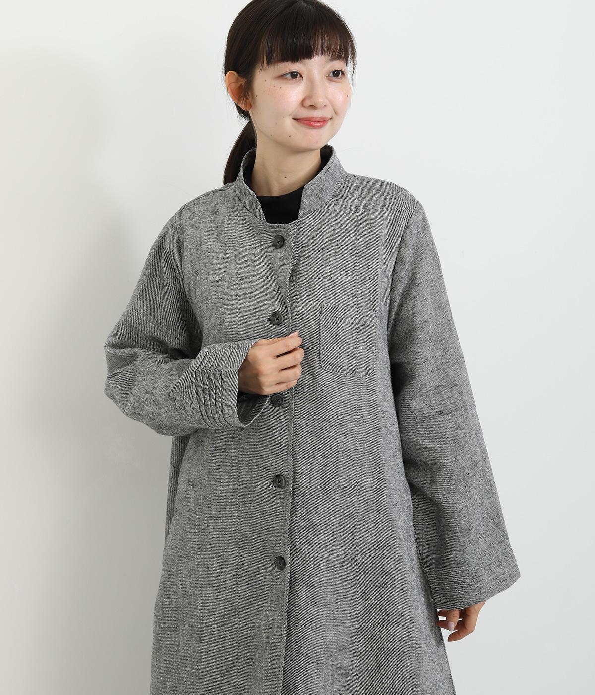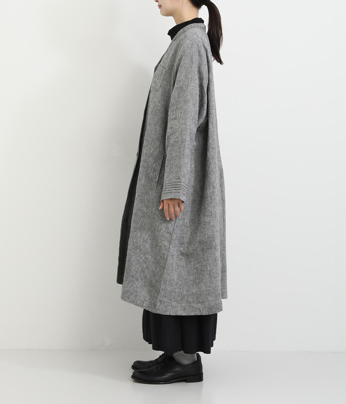 袖の切り替えがなく、腕を広げると矢のようなシルエットを描くアローコート。存在感がありながらも軽やかな着心地です。袖口に施したピンタックがさりげないアクセントです。第一ボタンを留めてスタンドカラーに、開けてオープンカラーにと、気分に合わせて表情を変えられます。