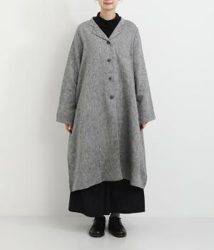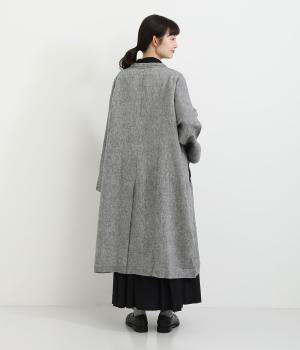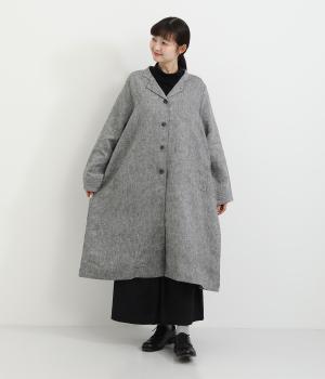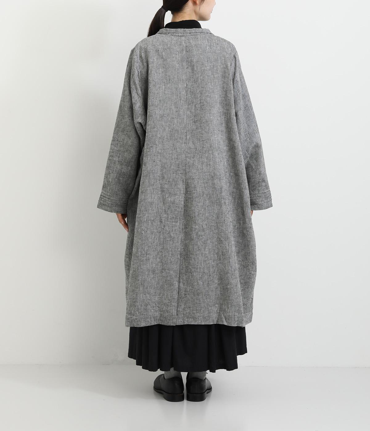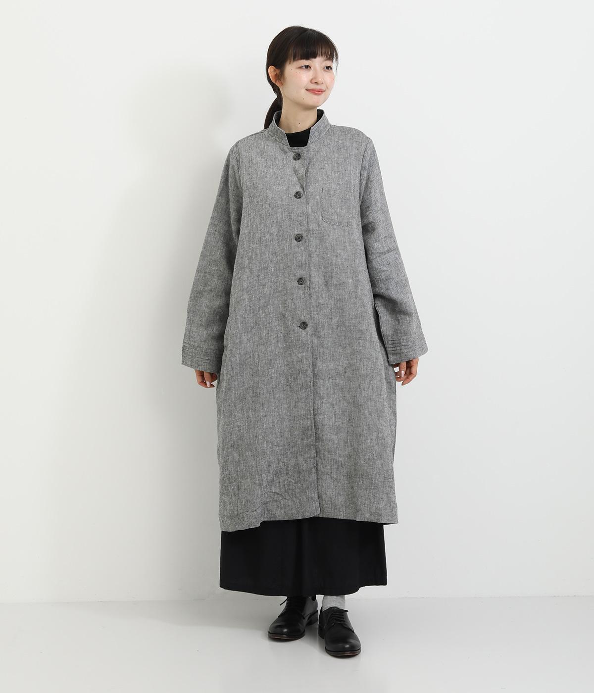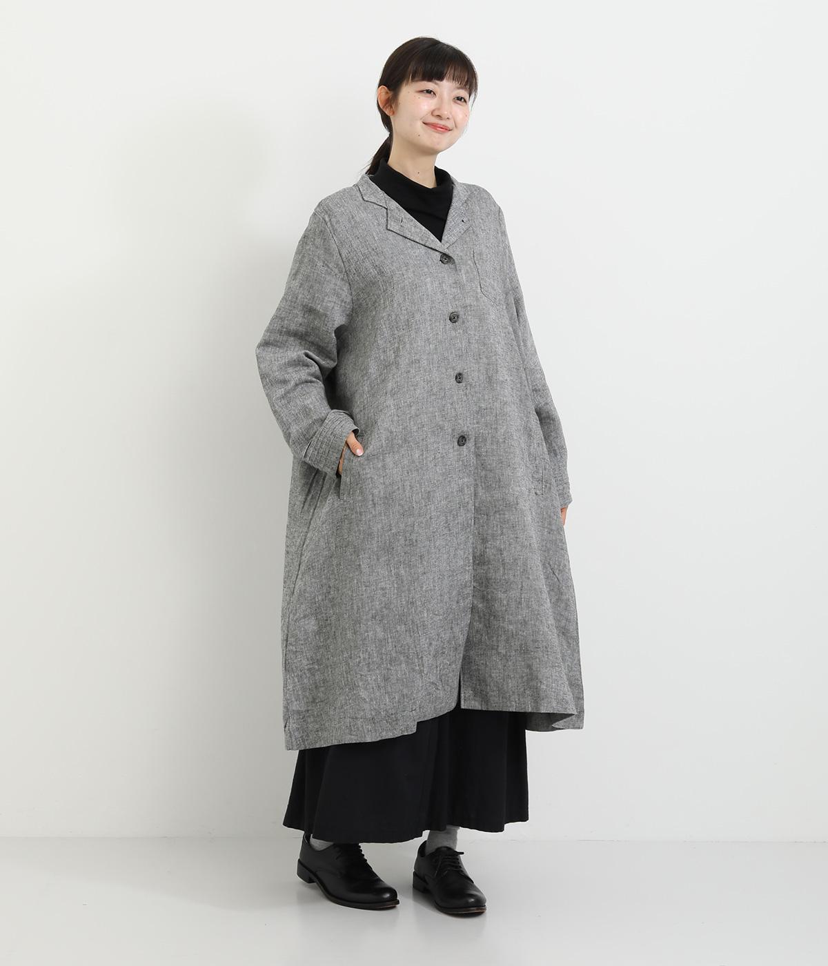 袖の切り替えがなく、腕を広げると矢のようなシルエットを描くアローコート。存在感がありながらも軽やかな着心地です。袖口に施したピンタックがさりげないアクセントです。第一ボタンを留めてスタンドカラーに、開けてオープンカラーにと、気分に合わせて表情を変えられます。