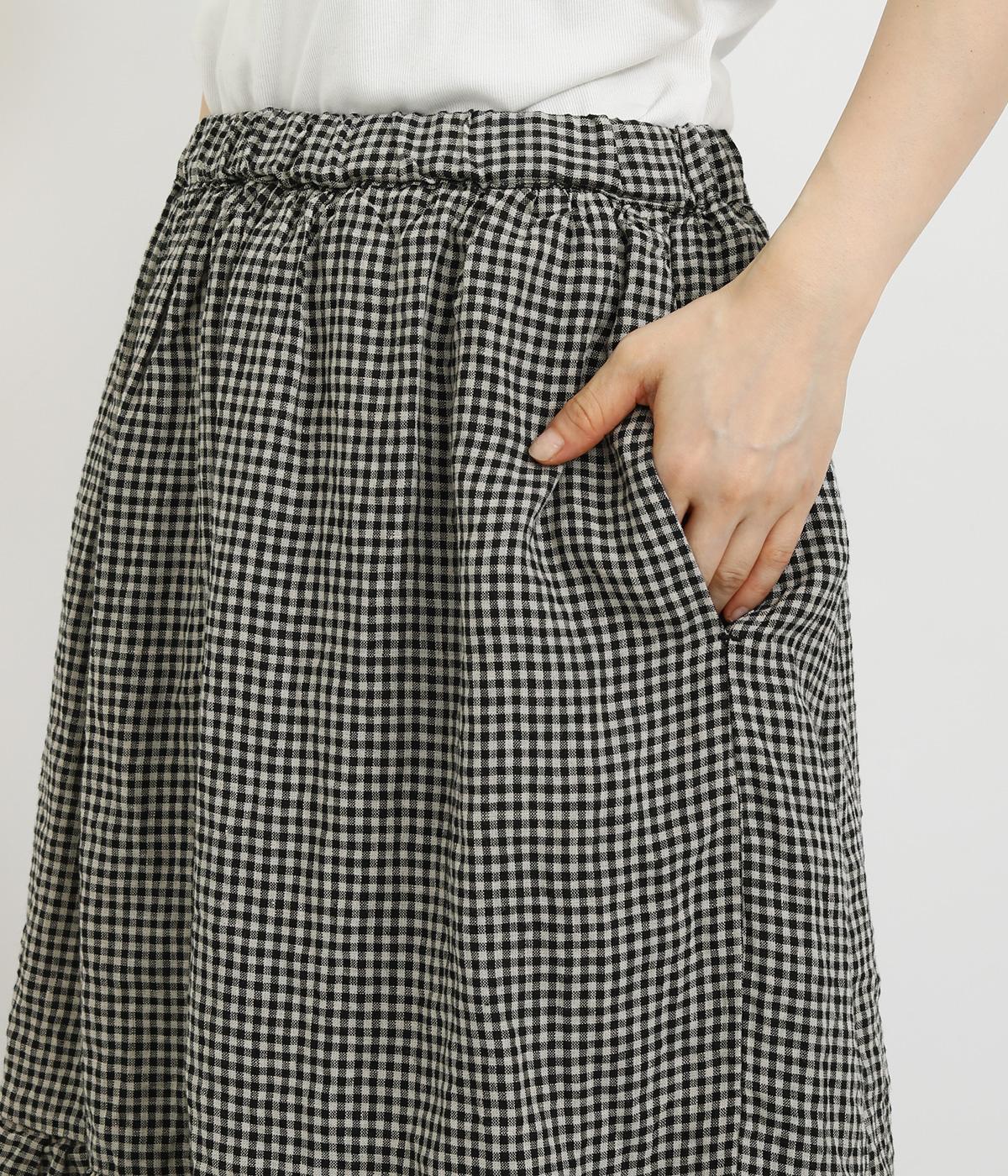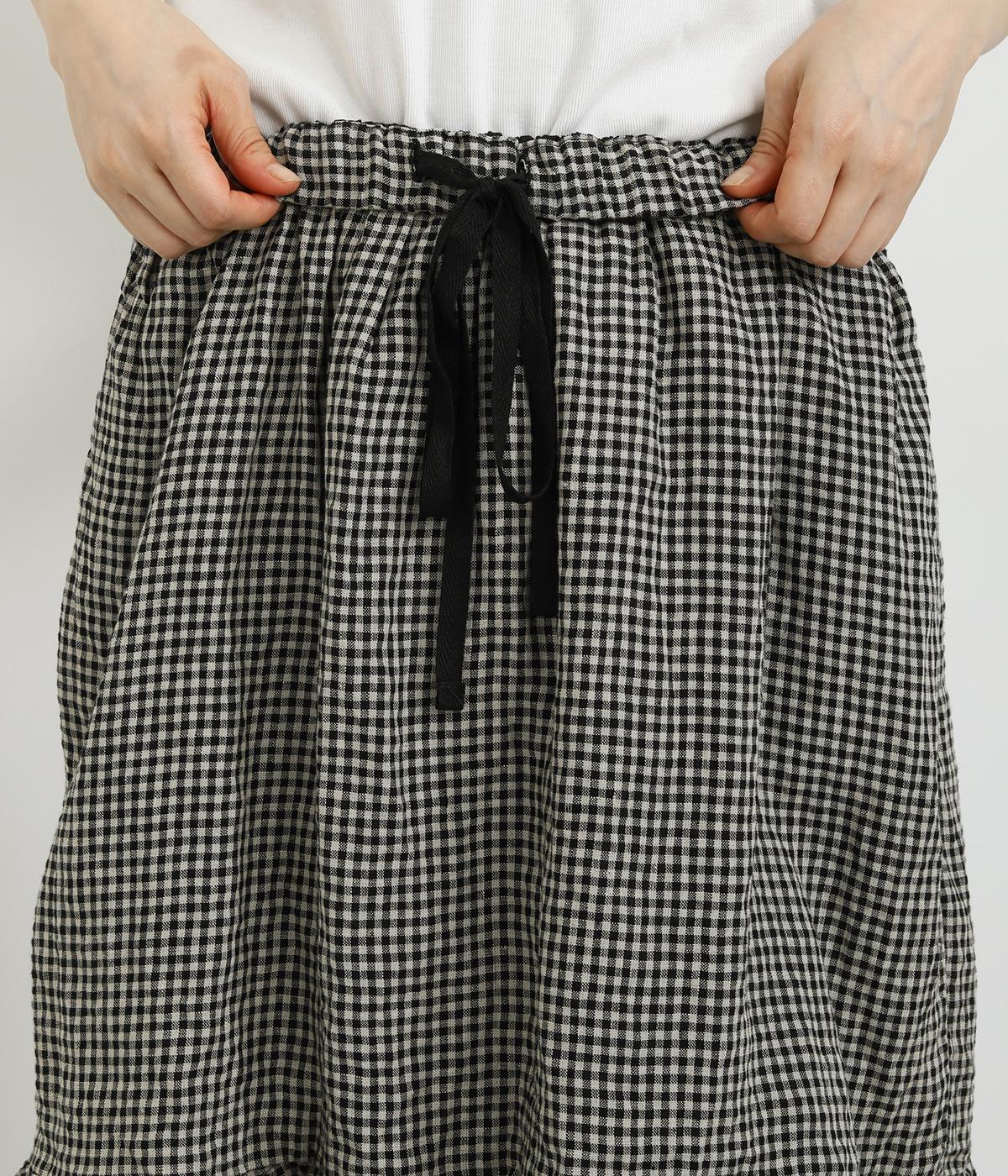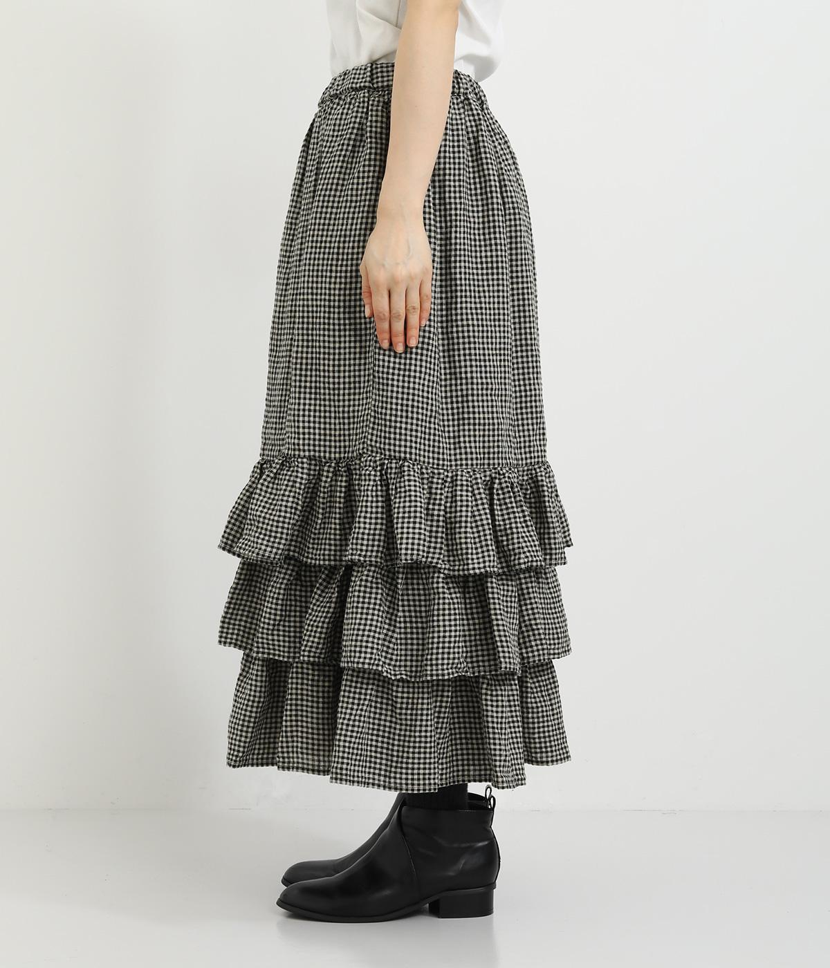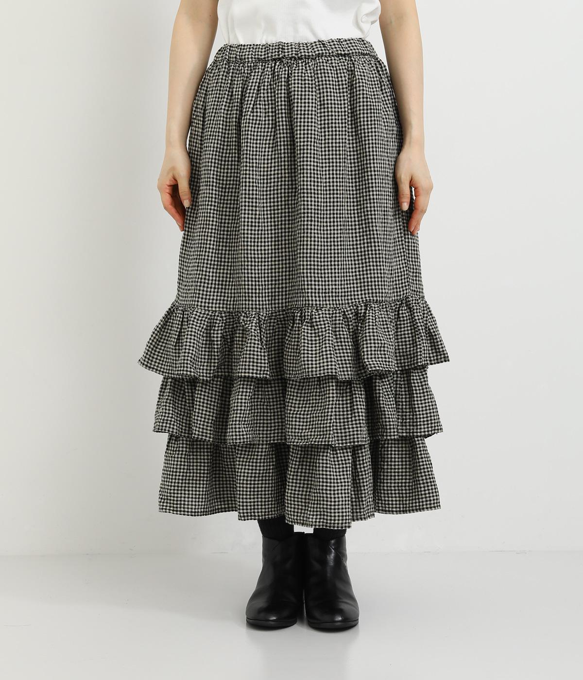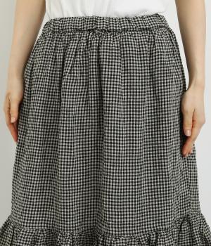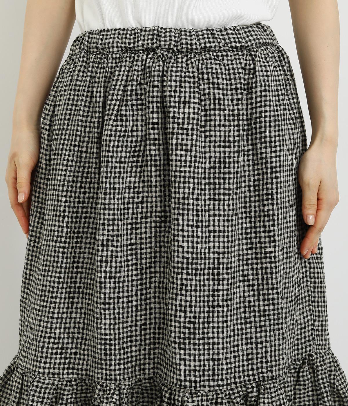 パッと華やかな印象を与えるティアードスカート。ナチュラルな素材感が甘さをほどよく中和しています。シンプルなトップスと合わせるだけでスタイリングが完成。ウエストは紐でサイズ調節が可能な総ゴム仕様。裏地つきで安心の穿き心地です。