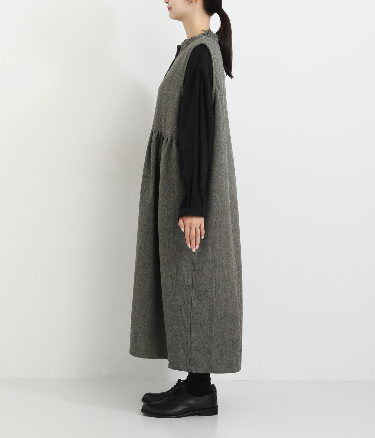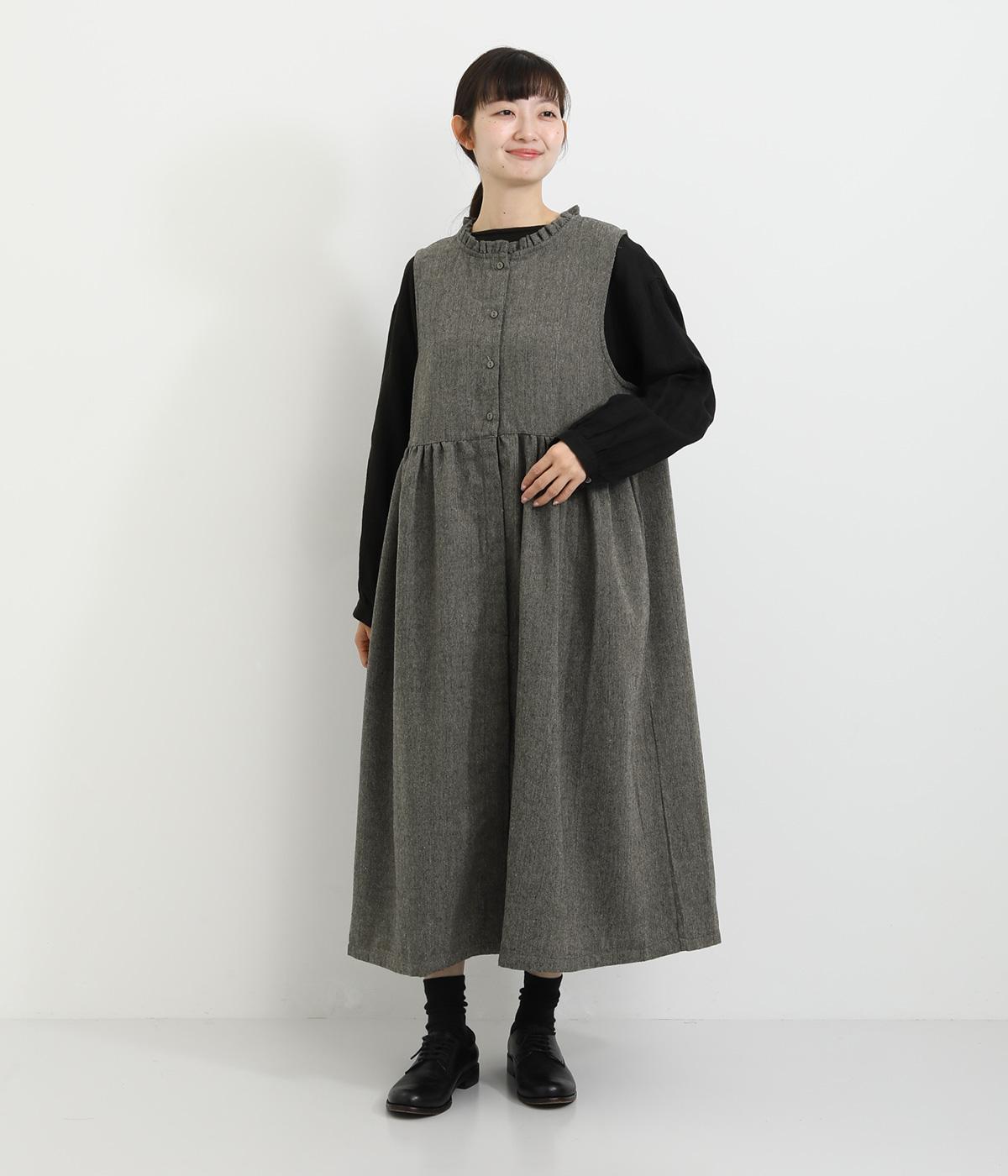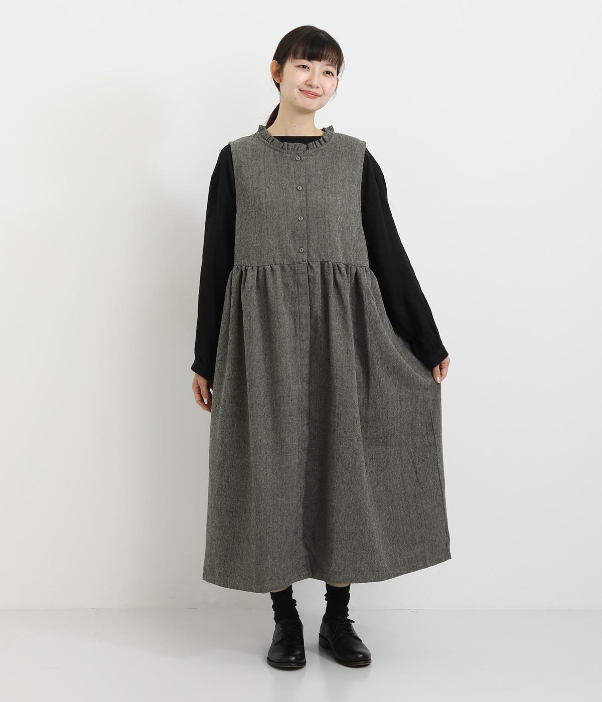 襟にあしらったフリルがかわいらしい印象のノースリーブワンピース。さりげないフリルで甘すぎない上品な雰囲気に仕上がりました。ウエストから下は比翼仕立てでギャザーをほどこし、きれいな落ち感を生みます。シンプルながら存在感のある一枚です。