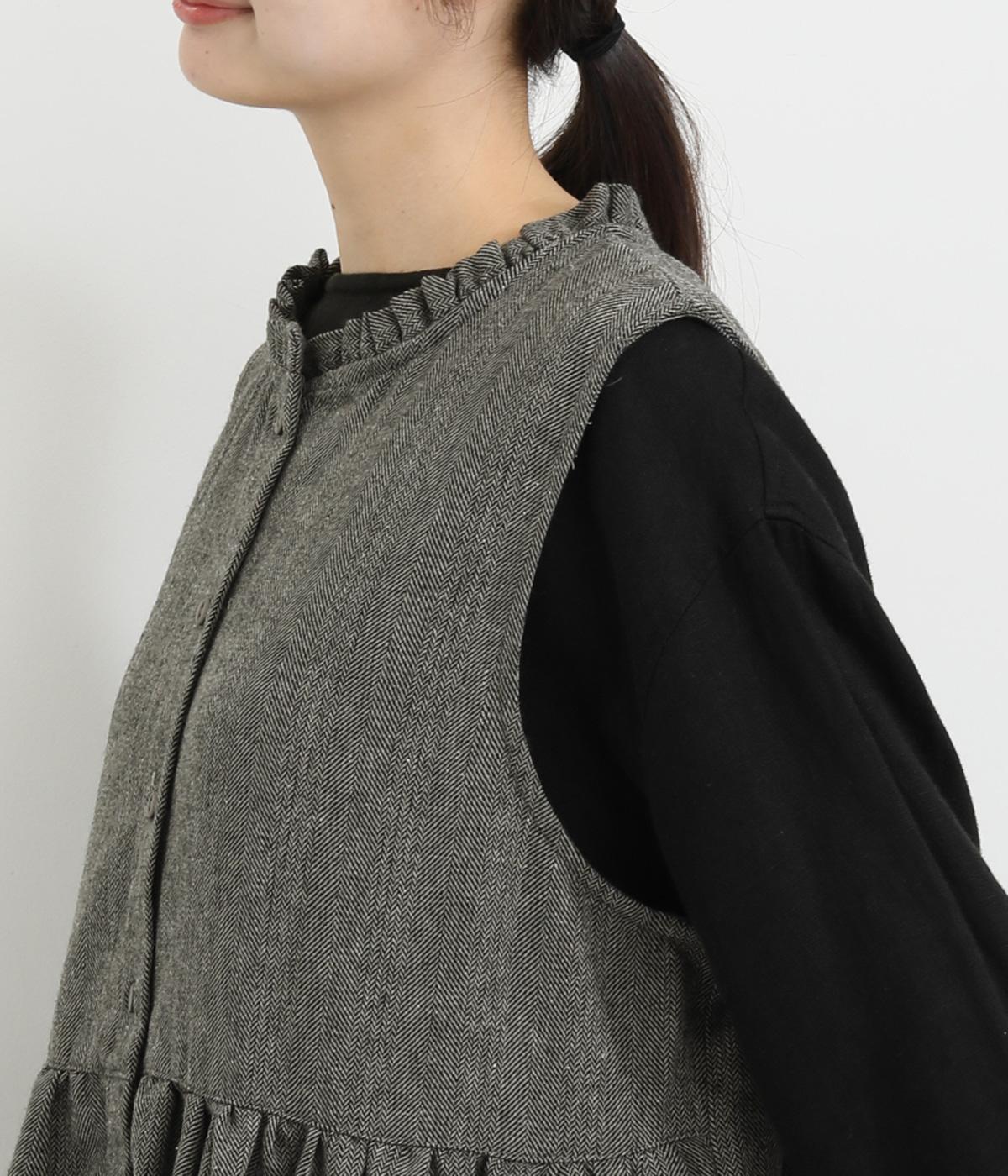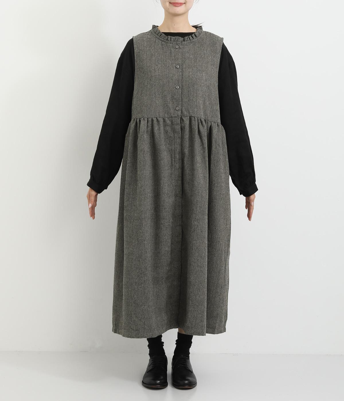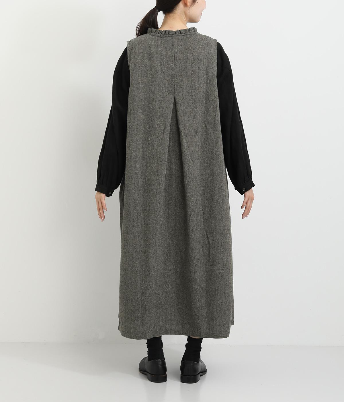 襟にあしらったフリルがかわいらしい印象のノースリーブワンピース。さりげないフリルで甘すぎない上品な雰囲気に仕上がりました。ウエストから下は比翼仕立てでギャザーをほどこし、きれいな落ち感を生みます。シンプルながら存在感のある一枚です。