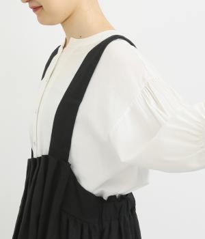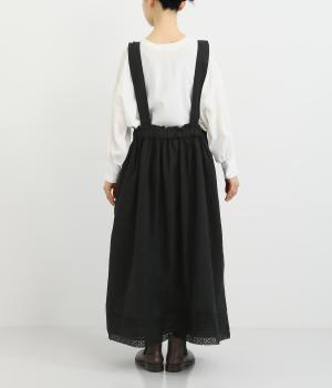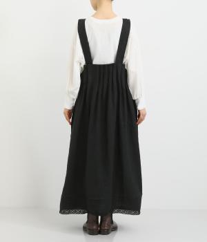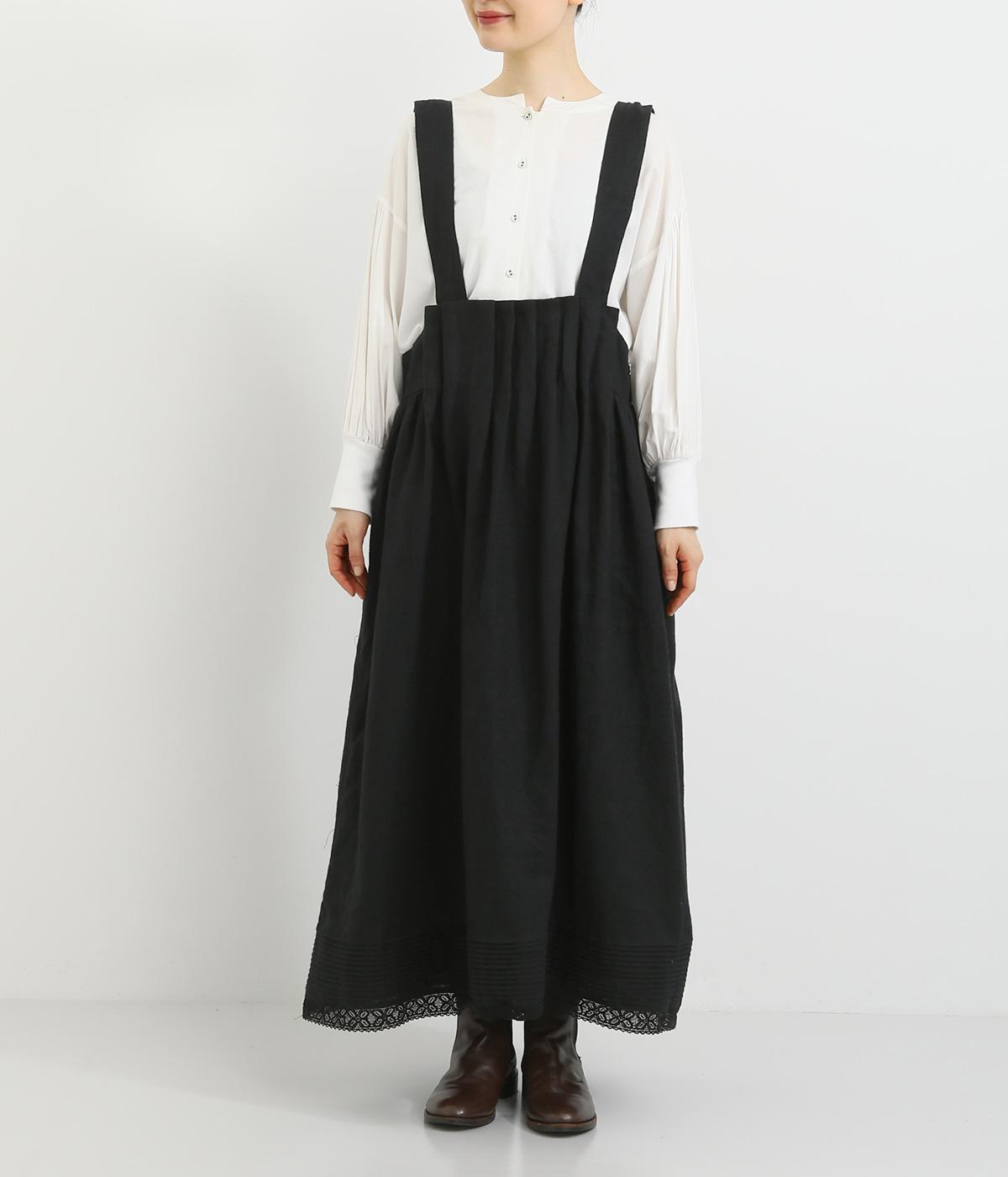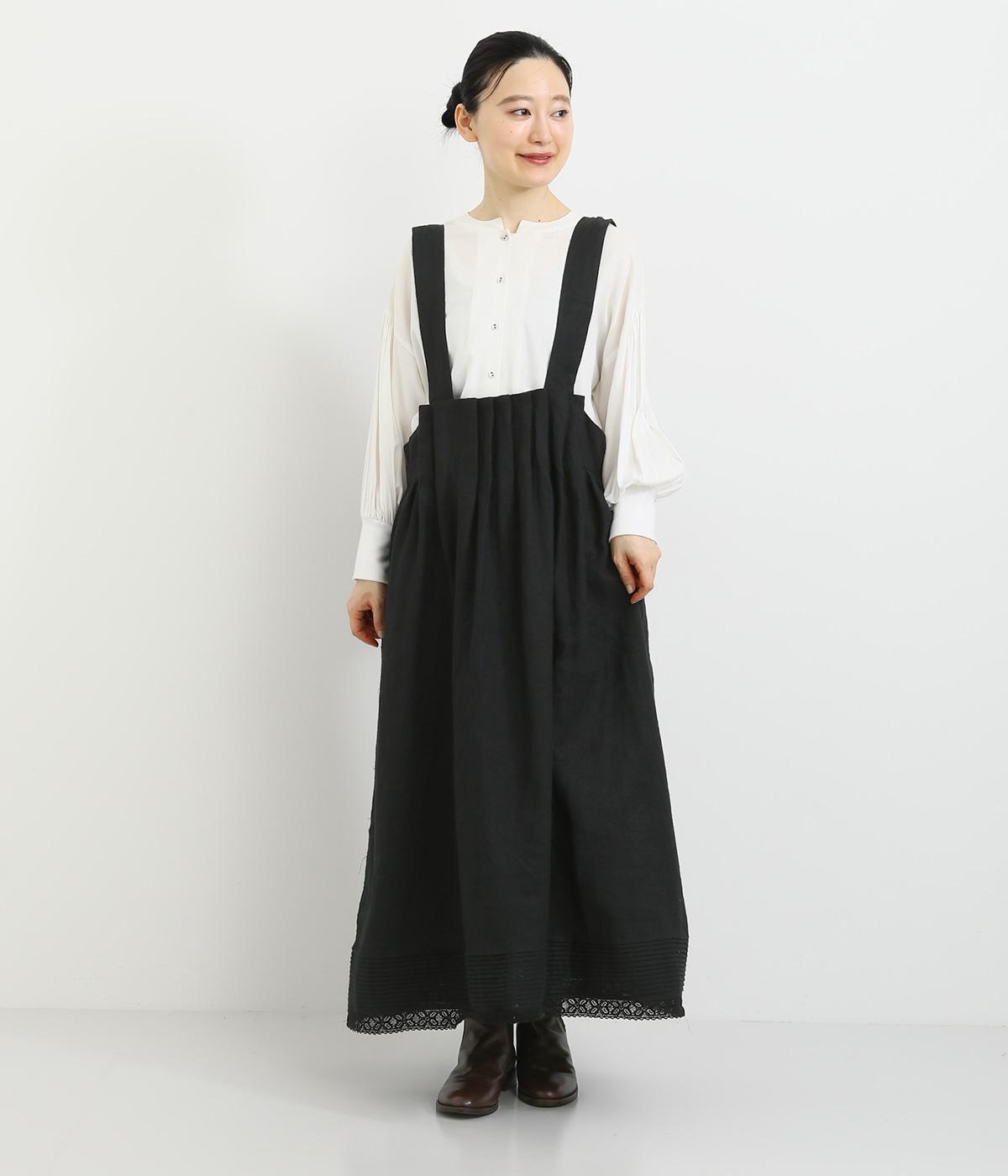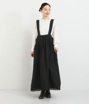 ウエストにたっぷりと贅沢にギャザーをほどこしたデザイン性の高いジャンパースカート。前後で着用できる2wayで仕立てました。裾にはピンタックとレースをあしらい、上品なムードを高めます。細部までこだわりの詰まった一枚です。
