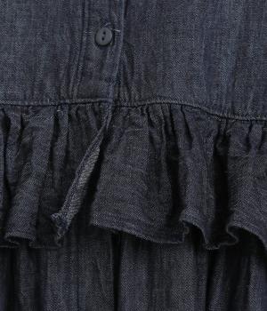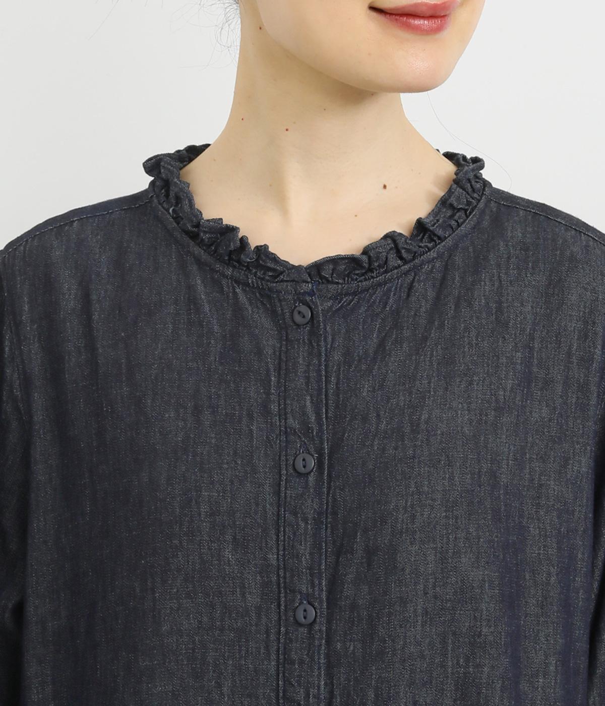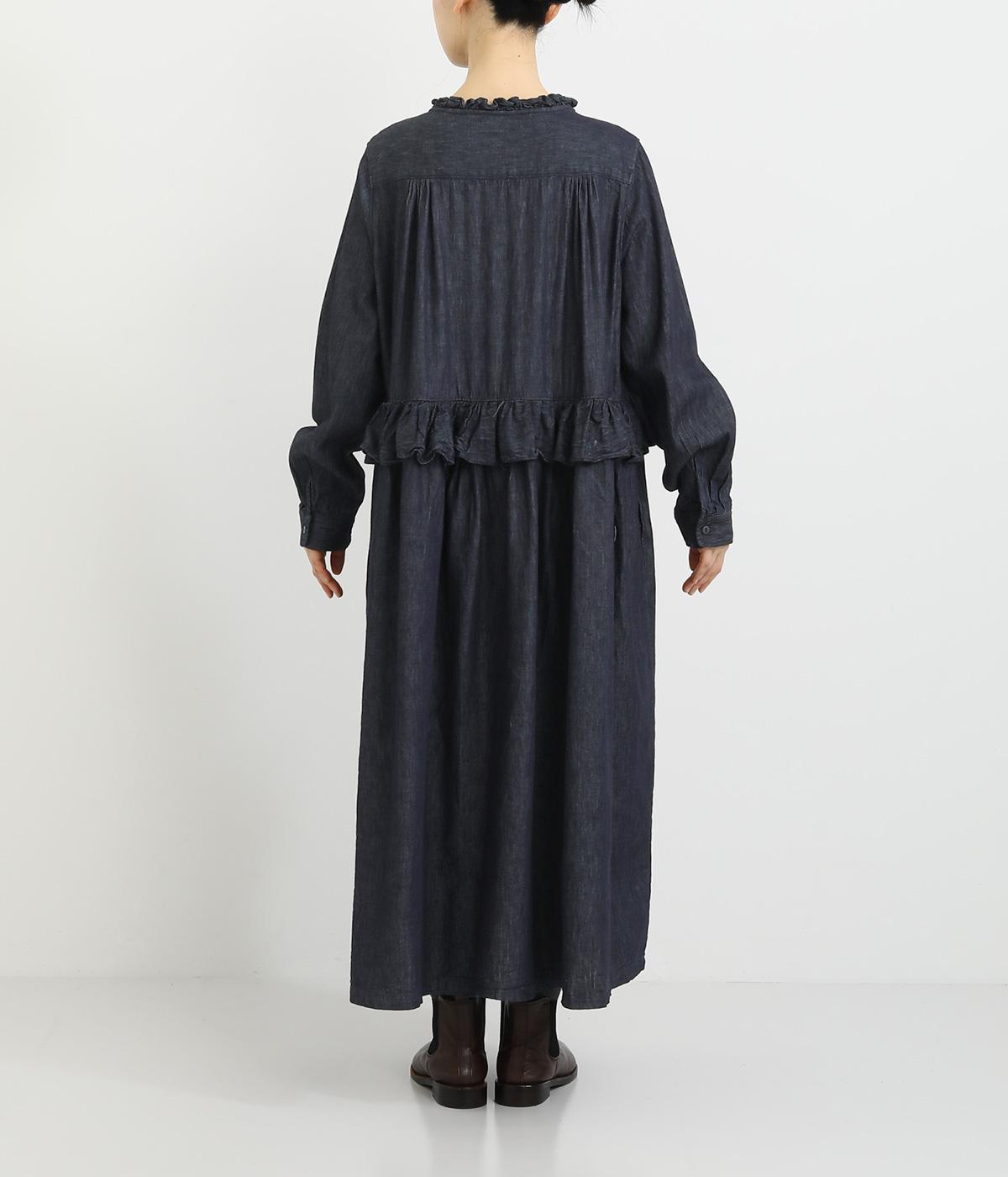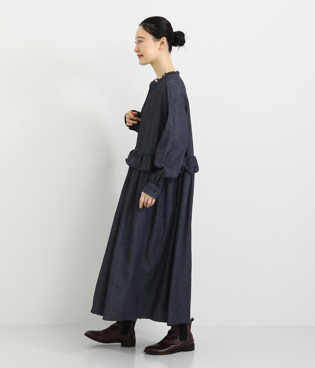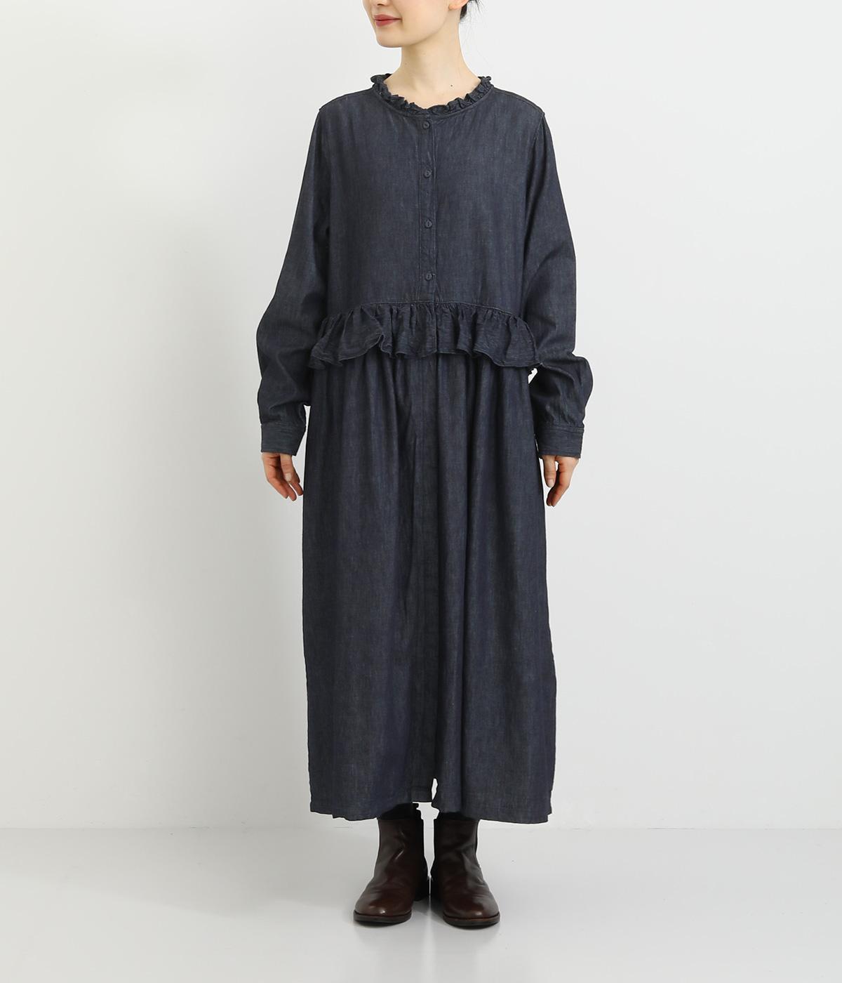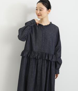 襟とウエストにあしらったフリルがやさしい甘さを添えるワンピース。ウエストのフリルが腰まわりをさりげなくカバーし、ウエスト下の比翼仕立てですっきりとしたラインに。前を開ければふわっと存在感のある羽織としても楽しめます。