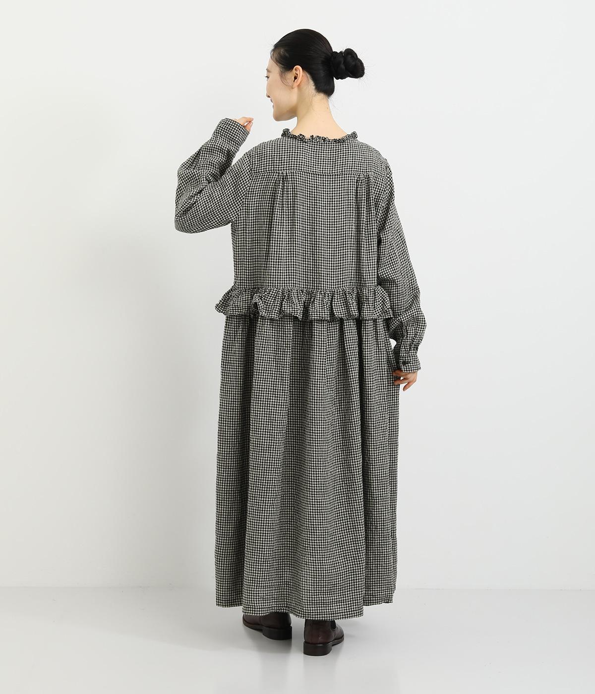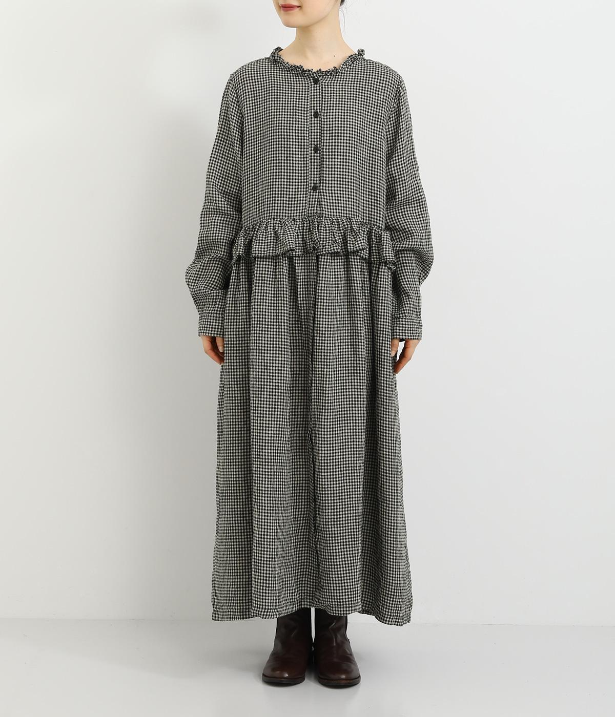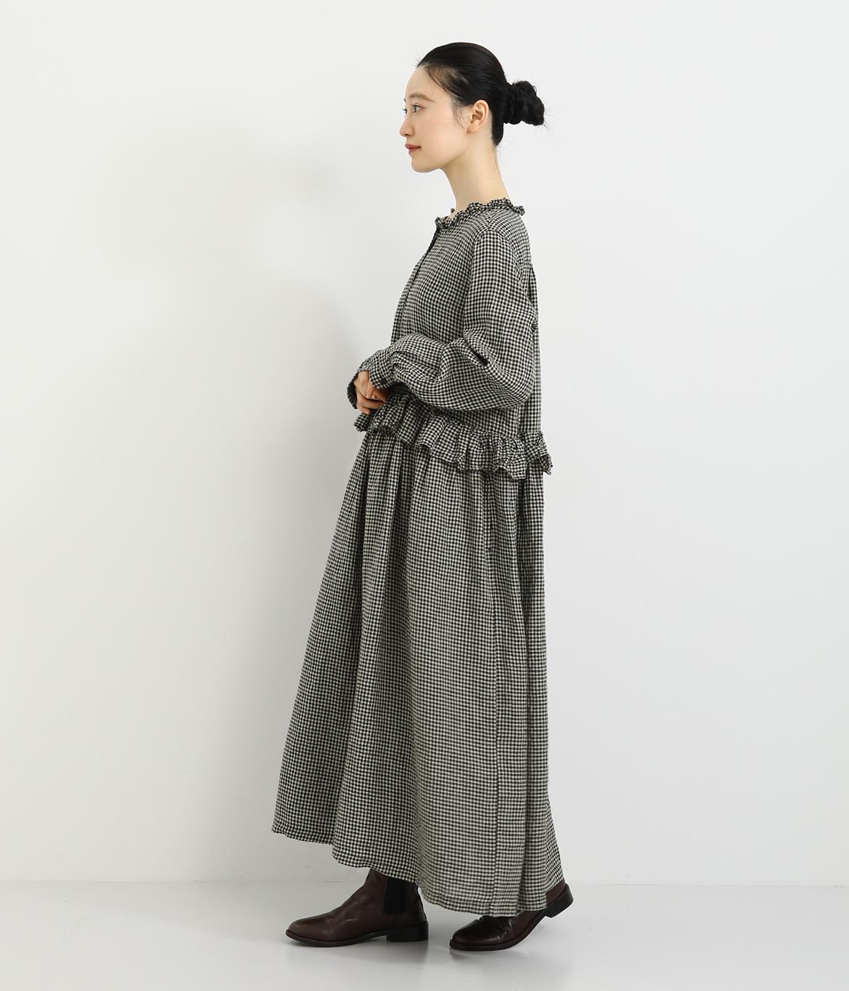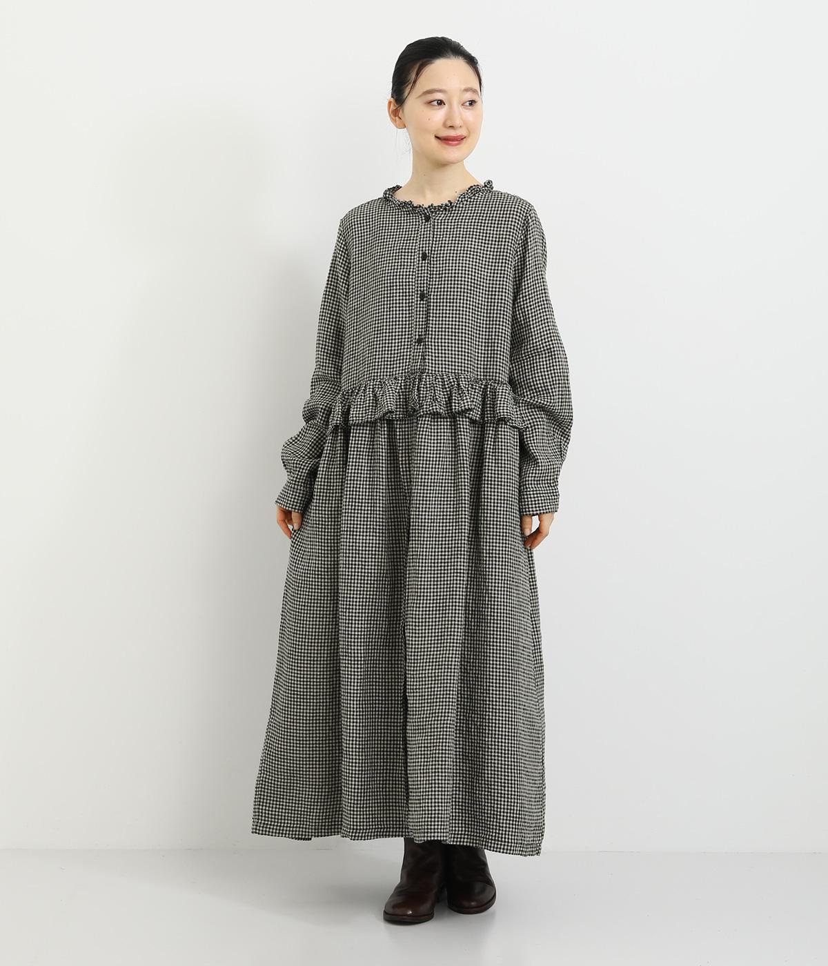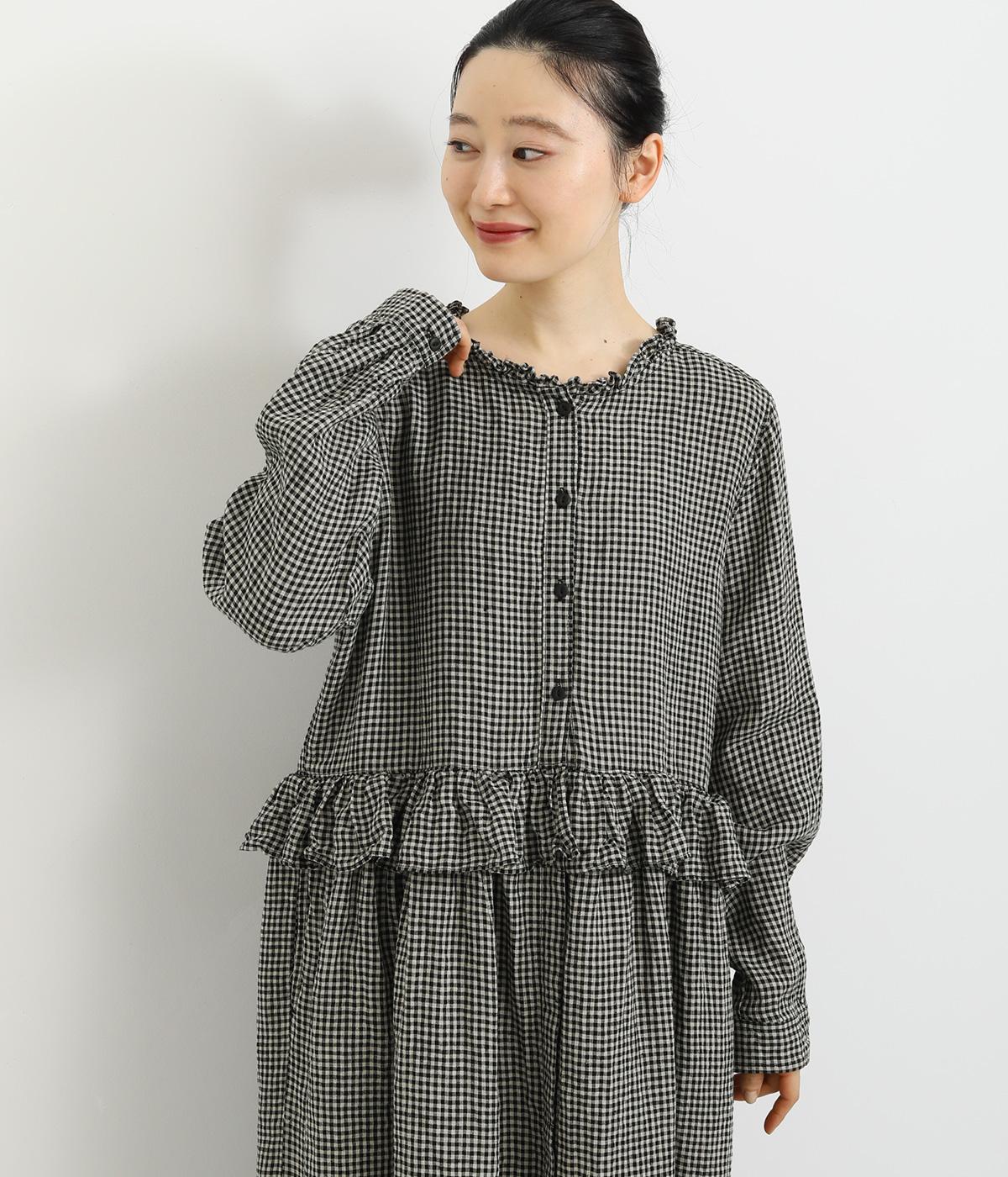 襟とウエストにあしらったフリルがやさしい甘さを添えるワンピース。ウエストのフリルが腰まわりをさりげなくカバーし、ウエスト下の比翼仕立てですっきりとしたラインに。前を開ければふわっと存在感のある羽織としても楽しめます。