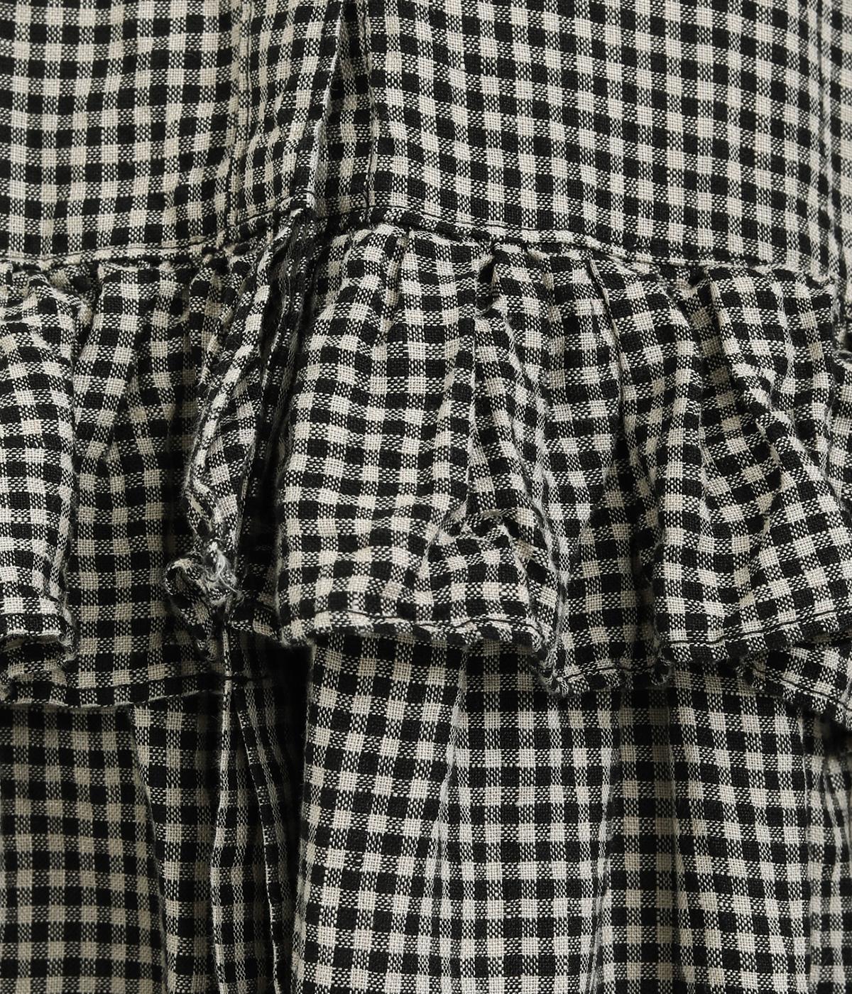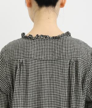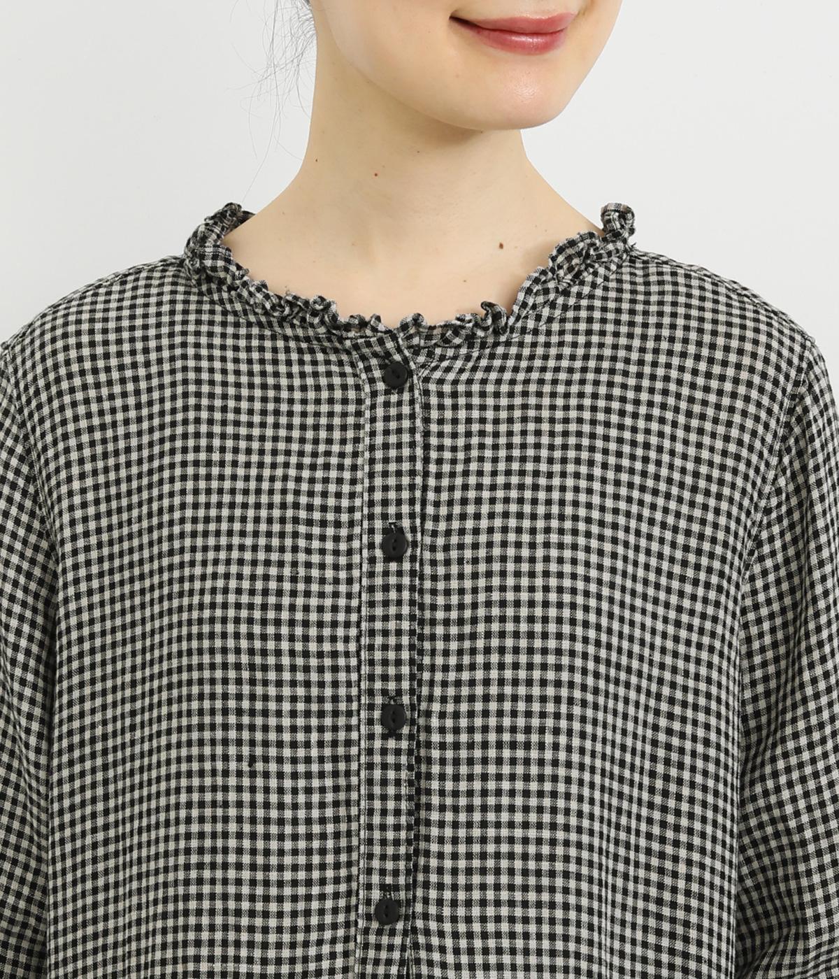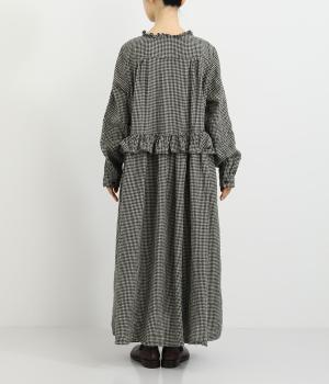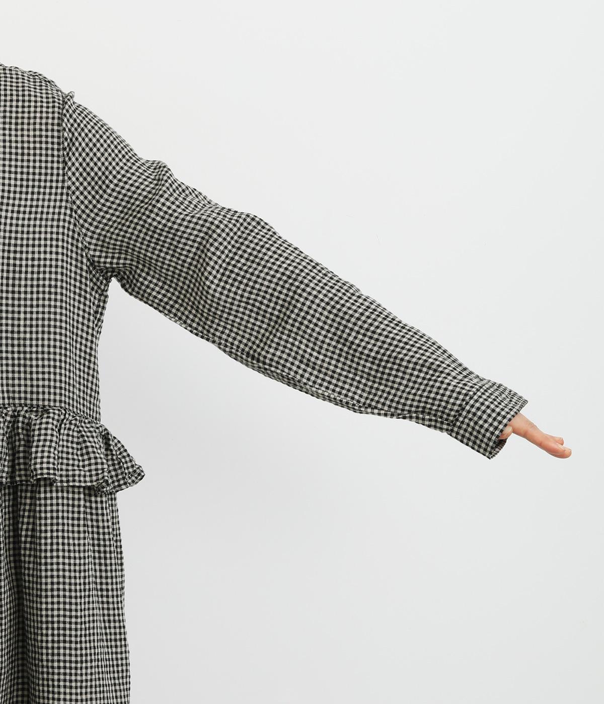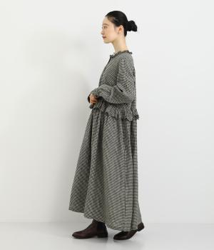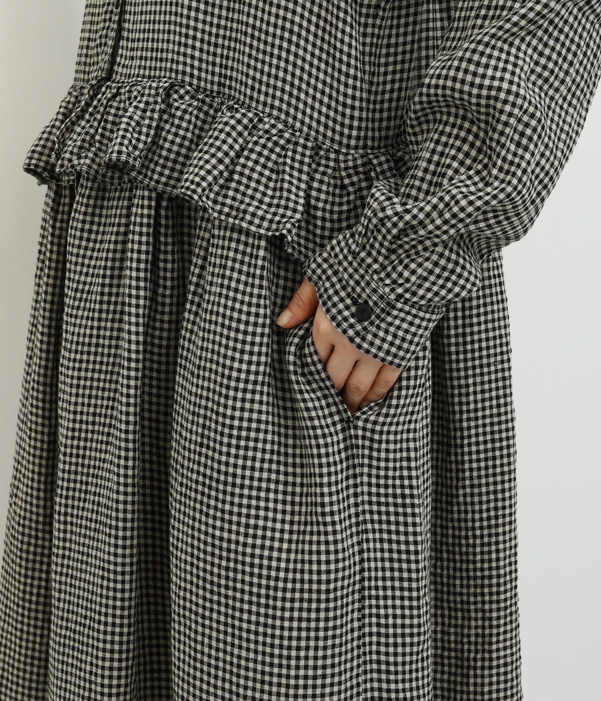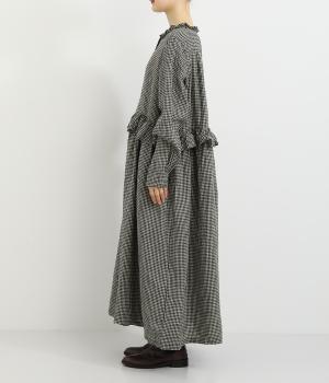 襟とウエストにあしらったフリルがやさしい甘さを添えるワンピース。ウエストのフリルが腰まわりをさりげなくカバーし、ウエスト下の比翼仕立てですっきりとしたラインに。前を開ければふわっと存在感のある羽織としても楽しめます。