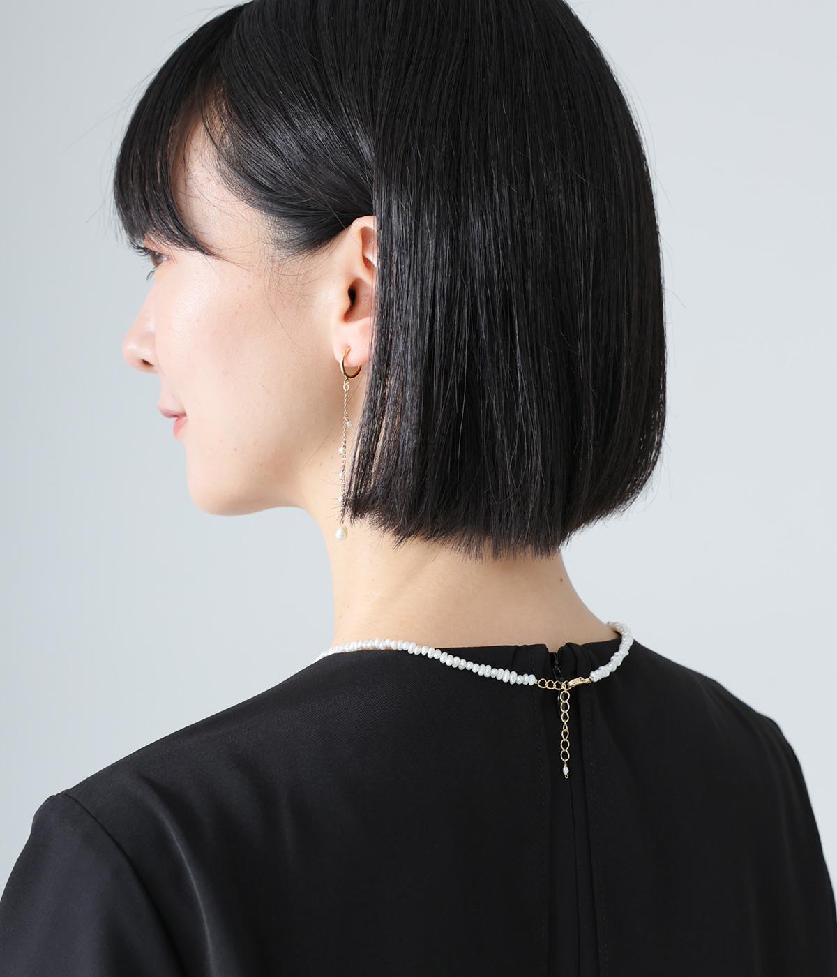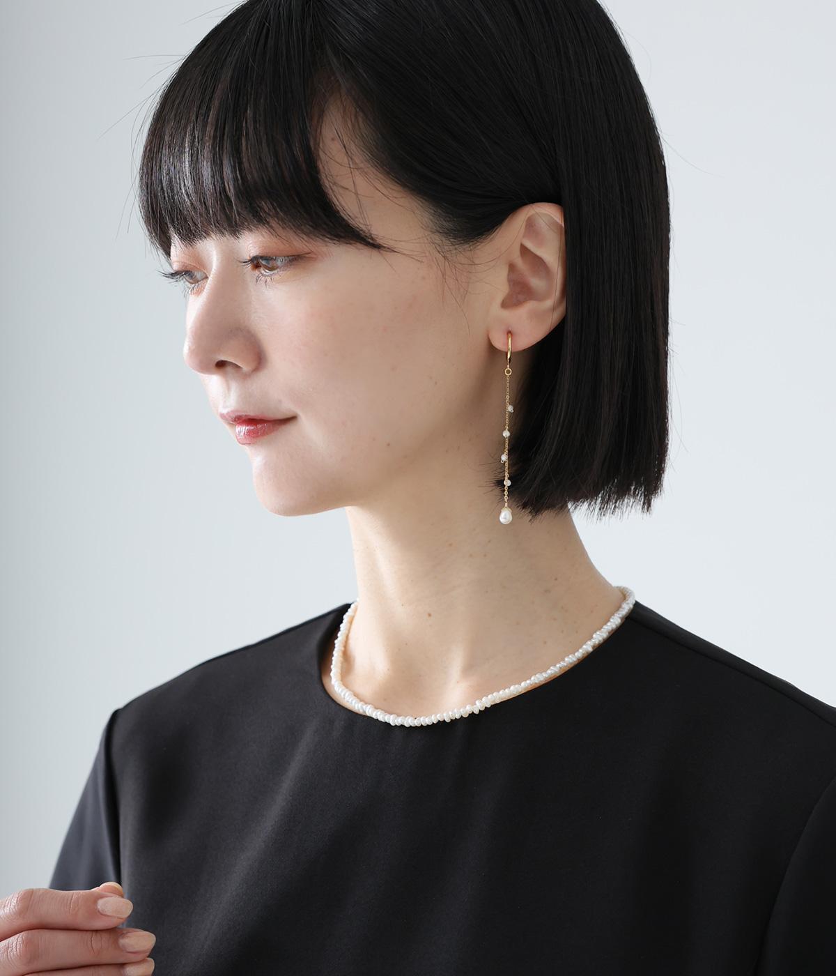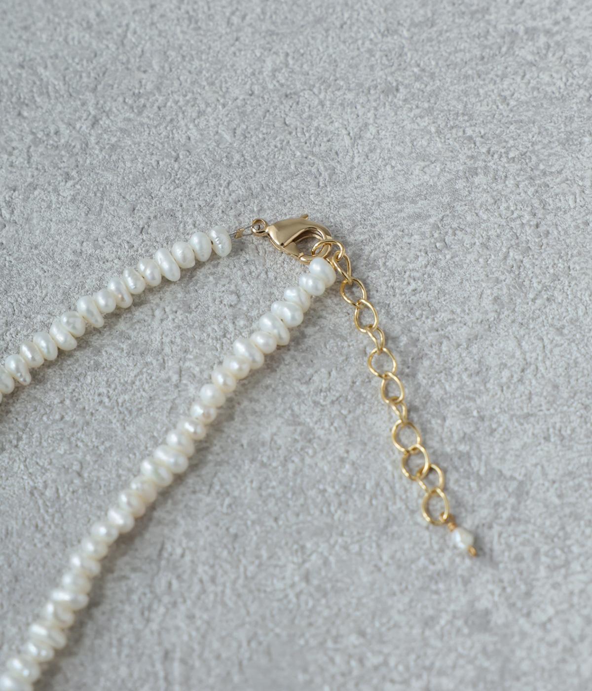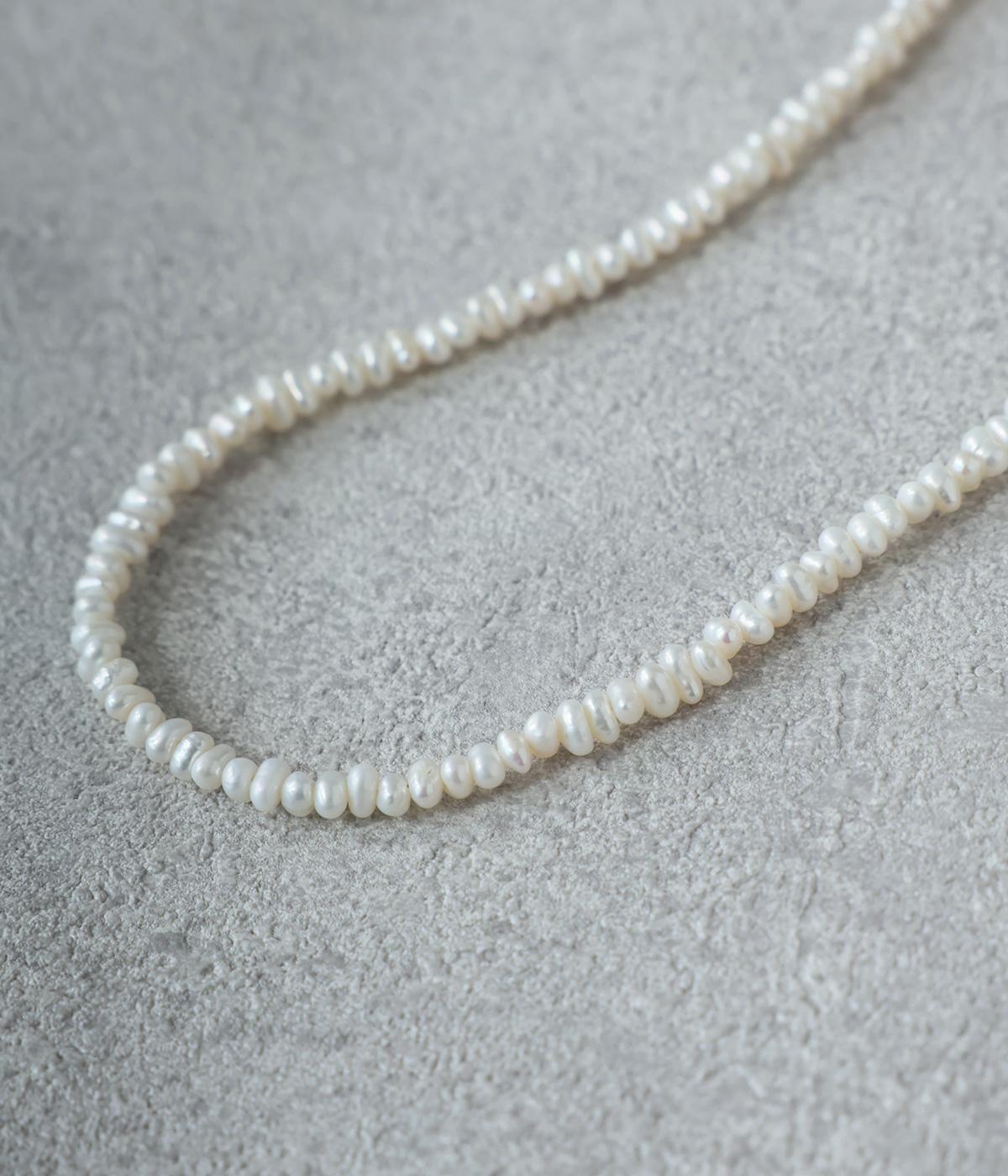 ひとつひとつ形の異なる小さなパールが、繊細で女性らしいムードを添えるネックレス。フォーマルシーンにはもちろん、デイリーにも取り入れやすいのが魅力です。アジャスターエンドのさりげない一粒パールがアクセントに。留め具は扱いやすいカニカンを使用しています。