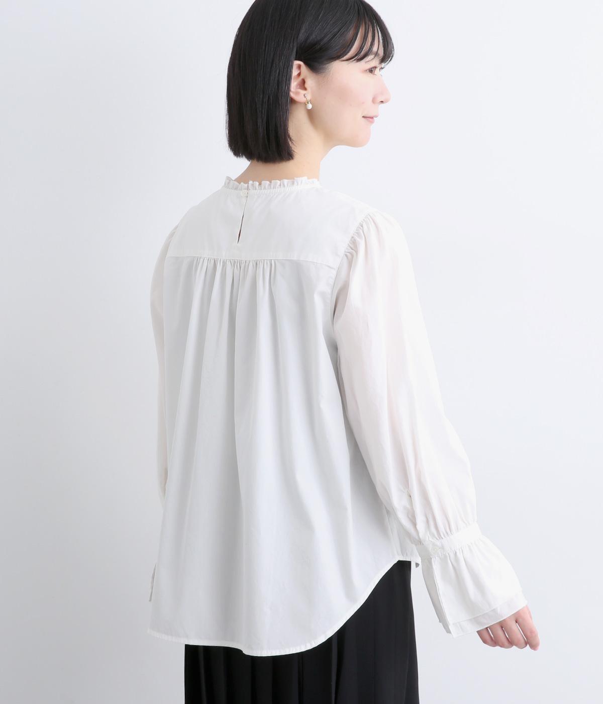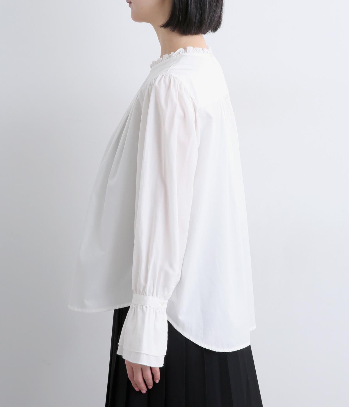 キャンディスリーブが上品なデザインポイントです。クラシカルで女性らしい雰囲気を演出します。一枚で着てもサマになりますが、ニットやジャケットのインナーにしてラッフルをのぞかせるスタイリングもおすすめです。