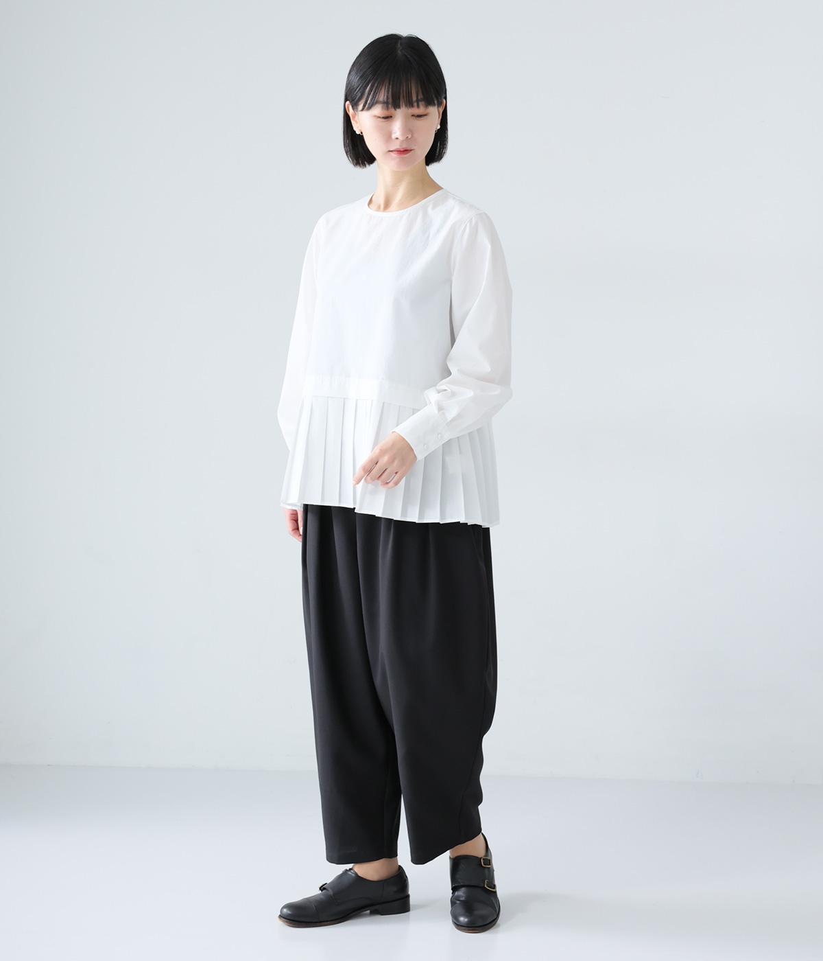 裾のプリーツが着こなしに立体感をうみ、気になるお腹まわりをカバーするプルオーバー。長めのカフスとボリューム袖が大人女性の魅力を引き立てます。大きく開くバックファスナーが着脱をアシスト。オンオフ問わず活躍し、おしゃれの幅が広がる一着です。