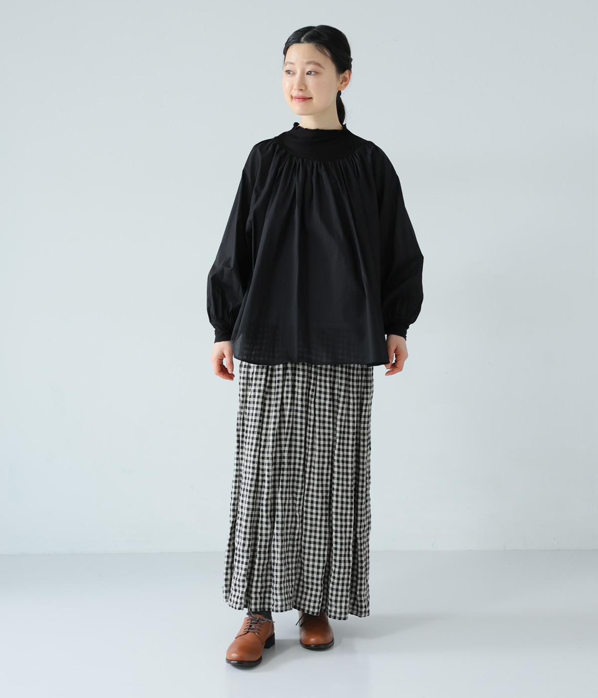 それぞれの生地の風合いをいかした異素材ミックスのブラウス。襟ぐりと袖口の切り替えにギャザーを入れて、ふんわりとした女性らしいシルエットに仕上げました。一枚でもインナーとしても着まわしのきく便利なアイテムです。