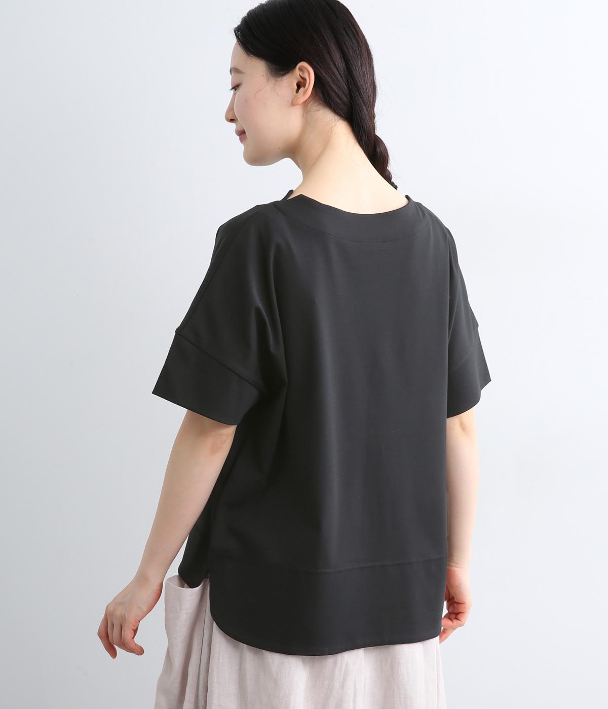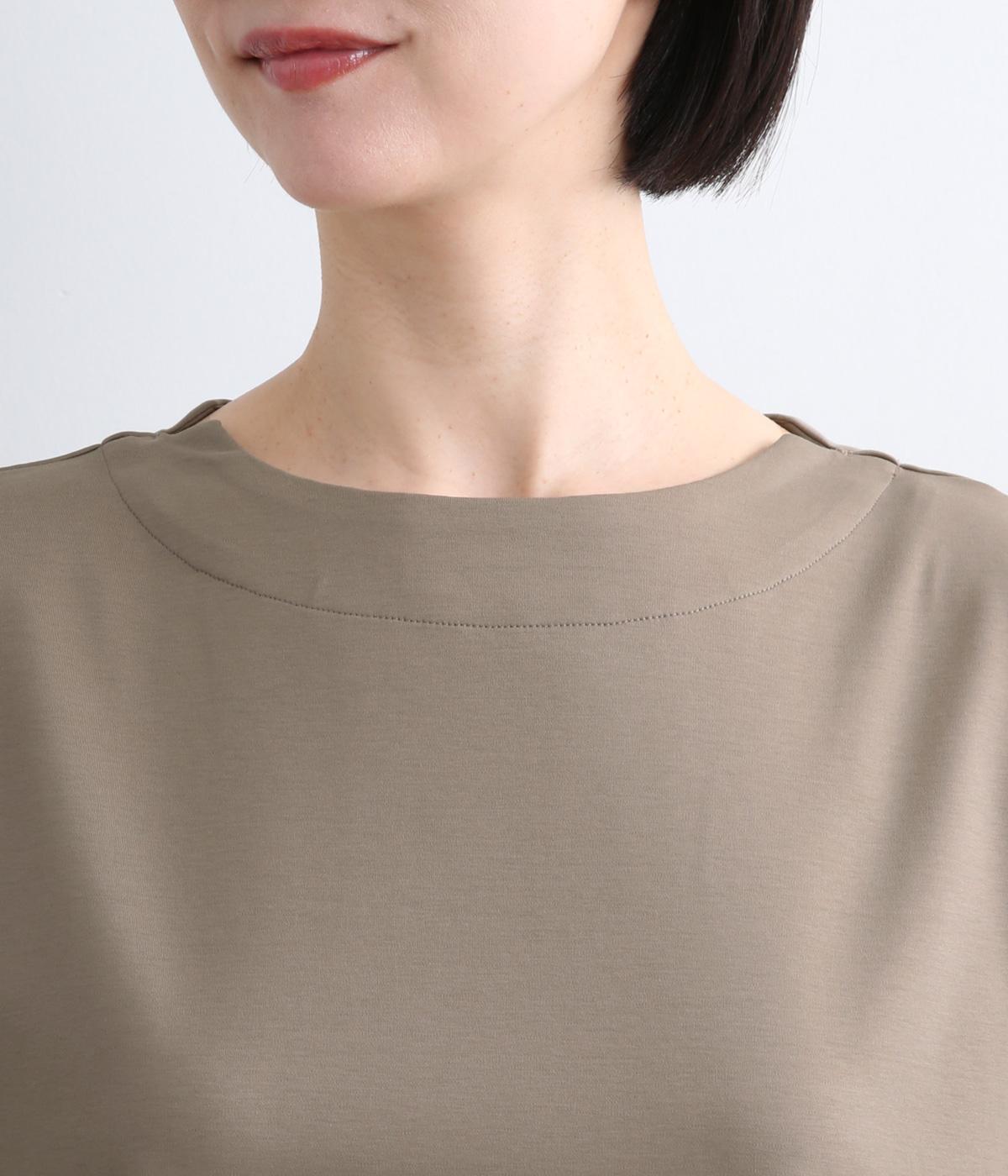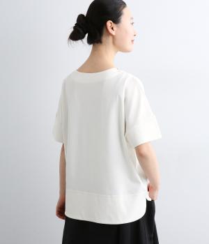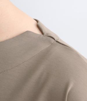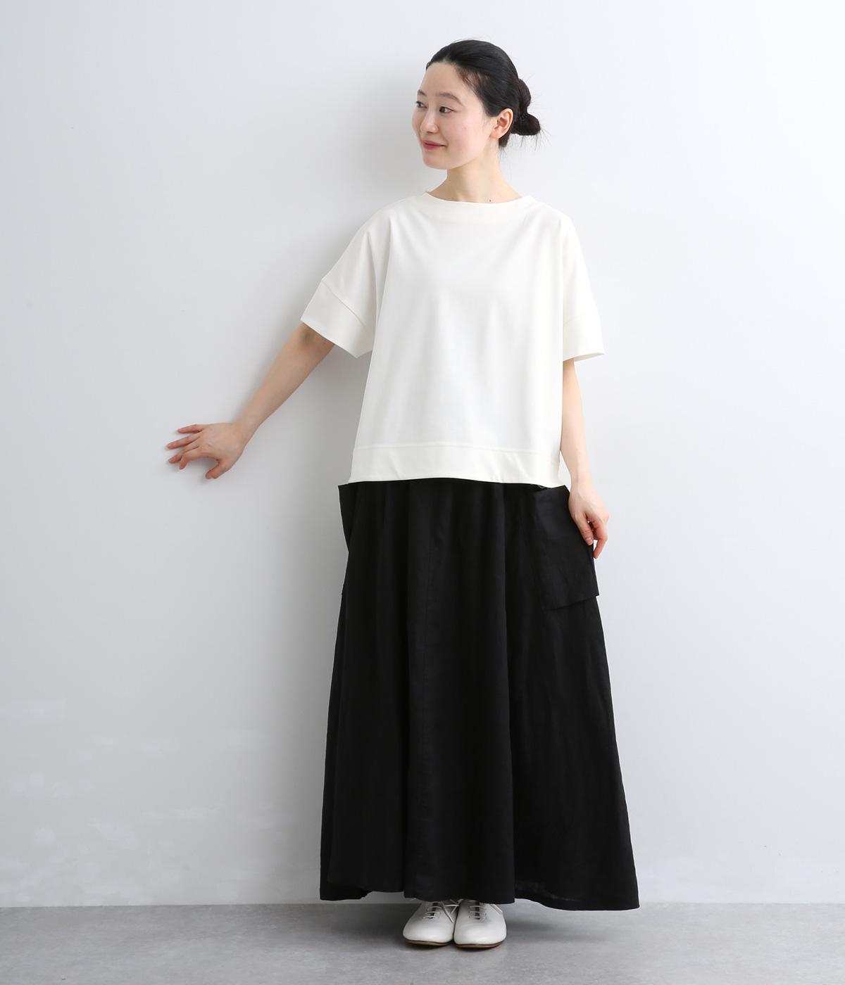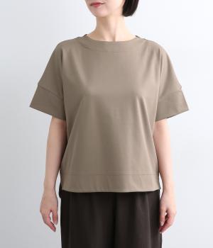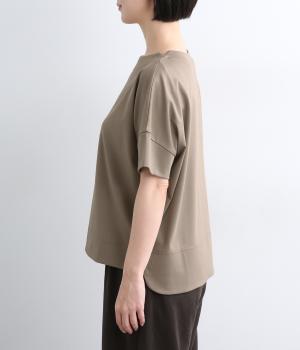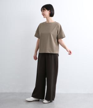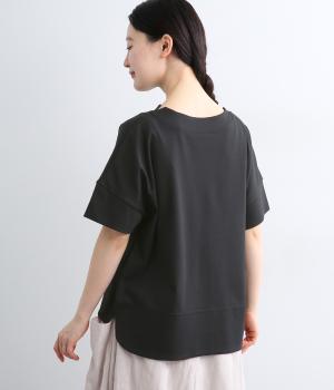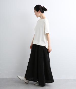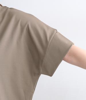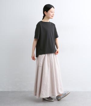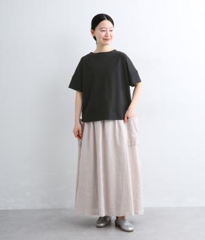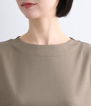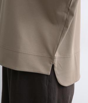 身頃から袖へつながる切り替えのないデザインで、肩まわりをやさしくつつみます。ゆったりとしたボックスシルエットが体のラインを拾いにくく、リラックスした着心地に。ボートネックにさりげなくスリットを入れ、窮屈感をおさえました。裾はうしろをラウンドさせ、シンプルながらも着るだけでこなれた印象に。