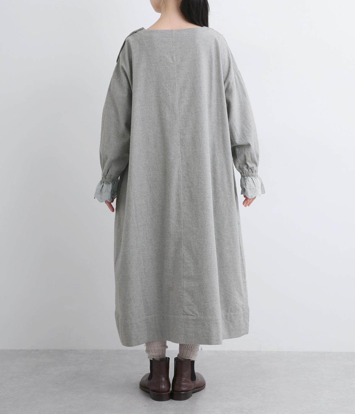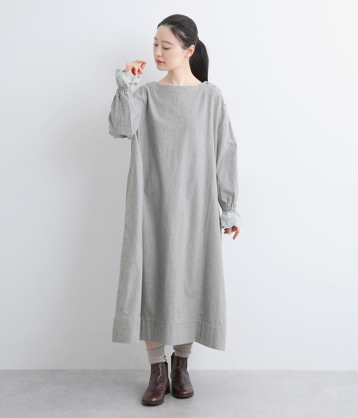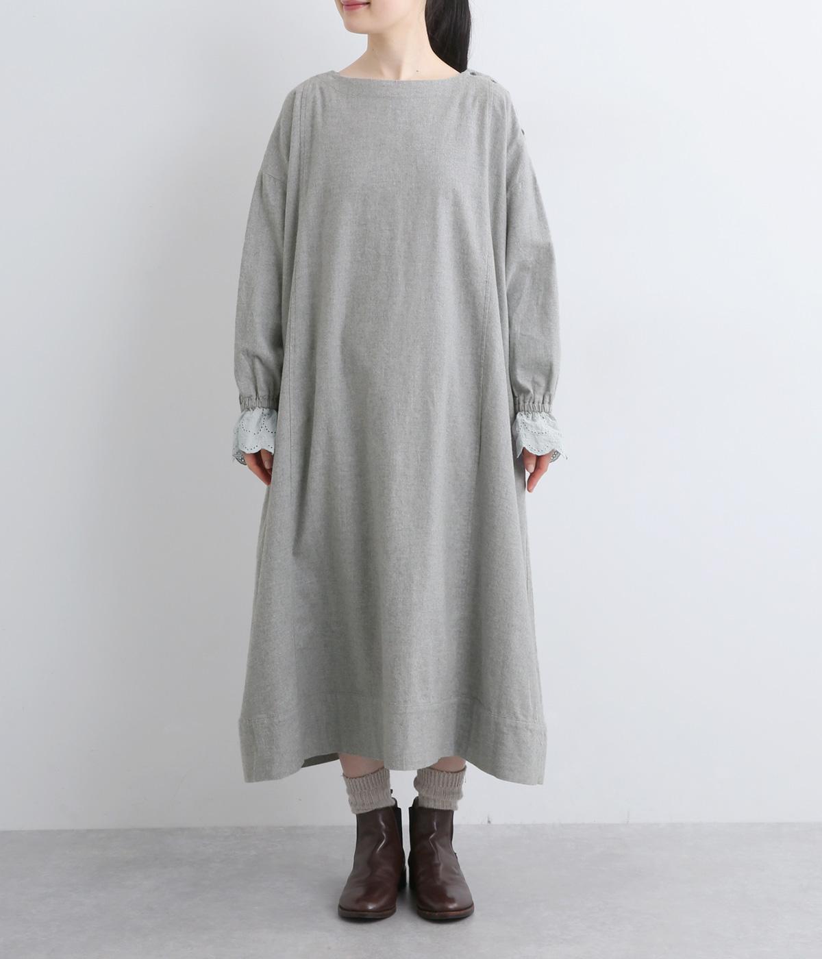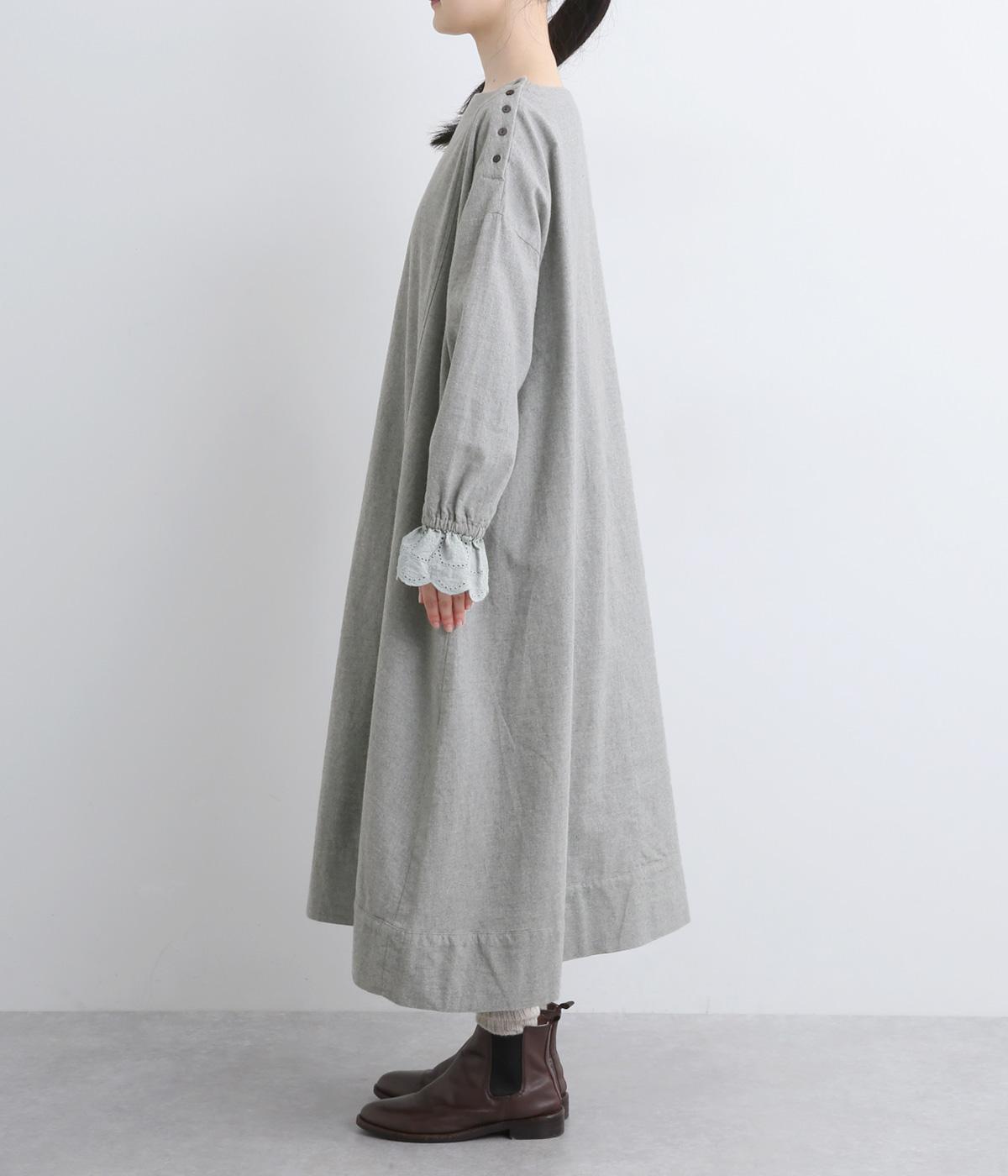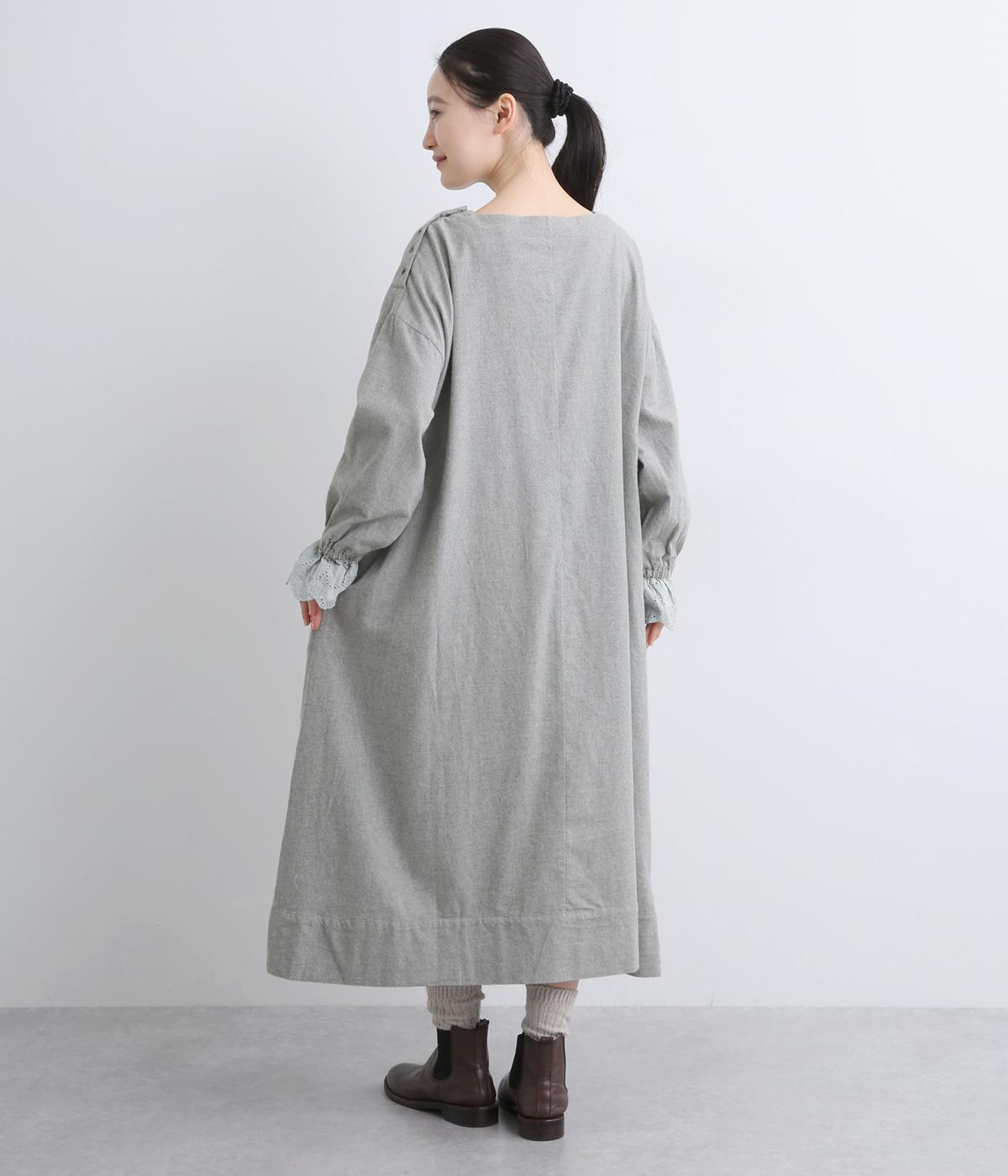 レースカフスが目をひくワンピース。ボックスシルエットでゆったりした着心地です。落ち感のあるたっぷりの生地が、動きに合わせてきれいなラインを描きます。肩に並べたボタンもさりげないアクセントになっています。