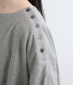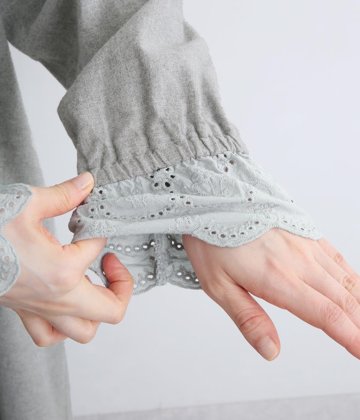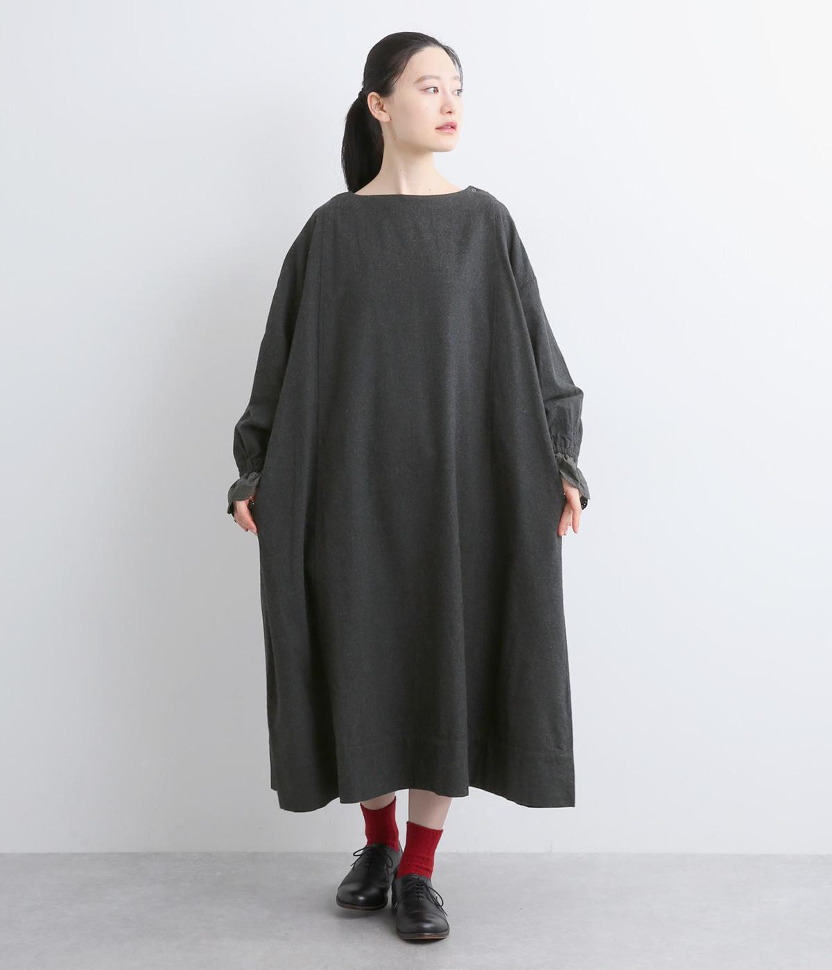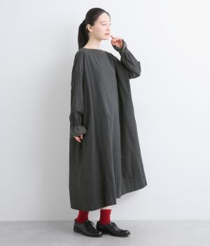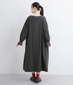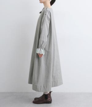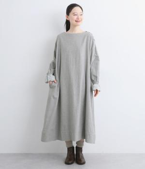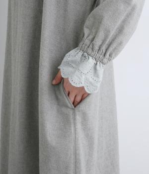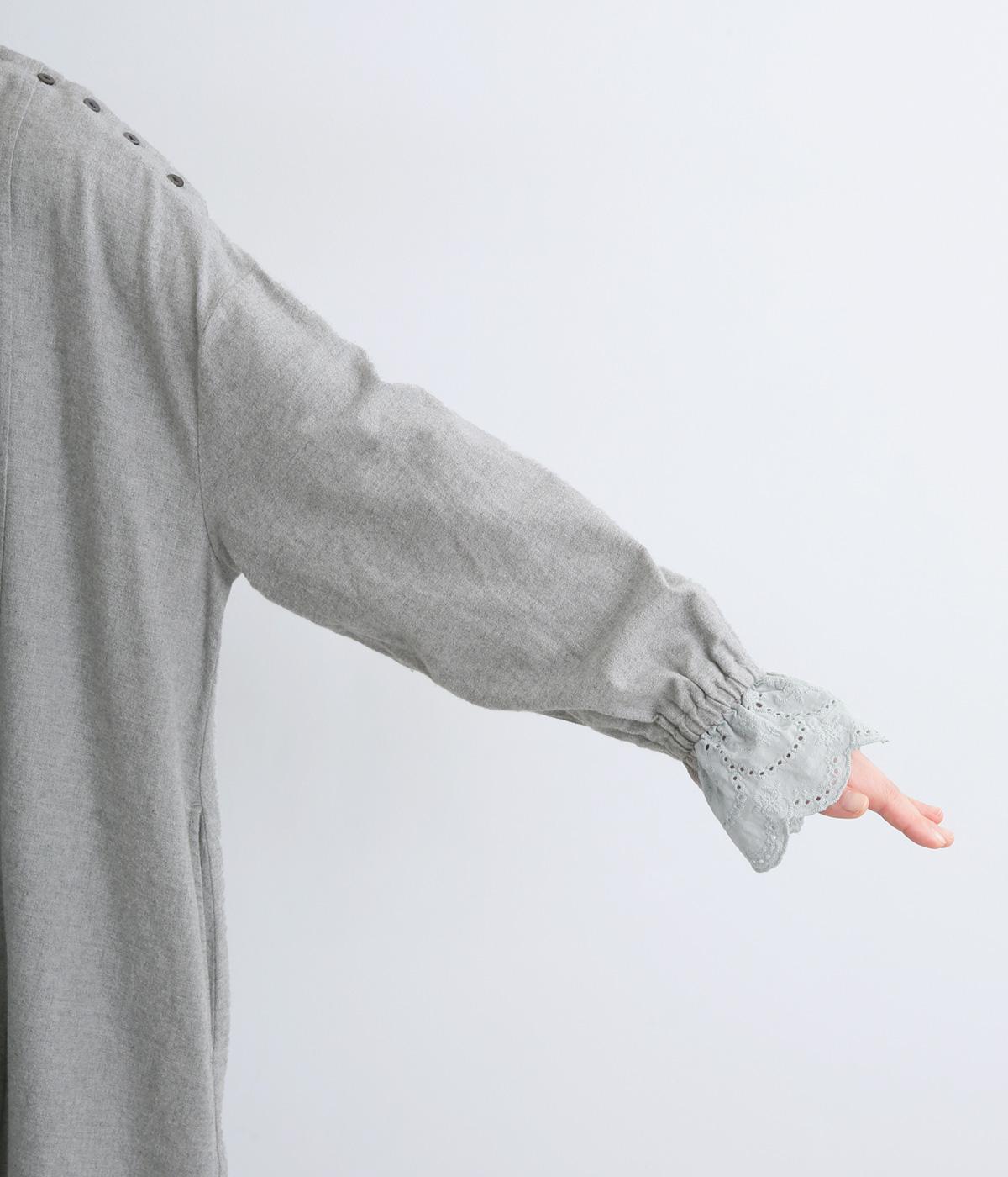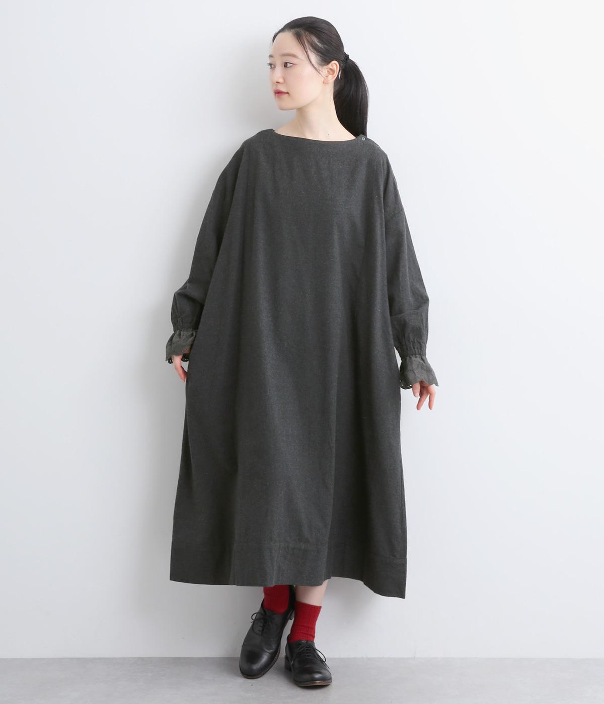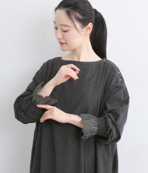 レースカフスが目をひくワンピース。ボックスシルエットでゆったりした着心地です。落ち感のあるたっぷりの生地が、動きに合わせてきれいなラインを描きます。肩に並べたボタンもさりげないアクセントになっています。