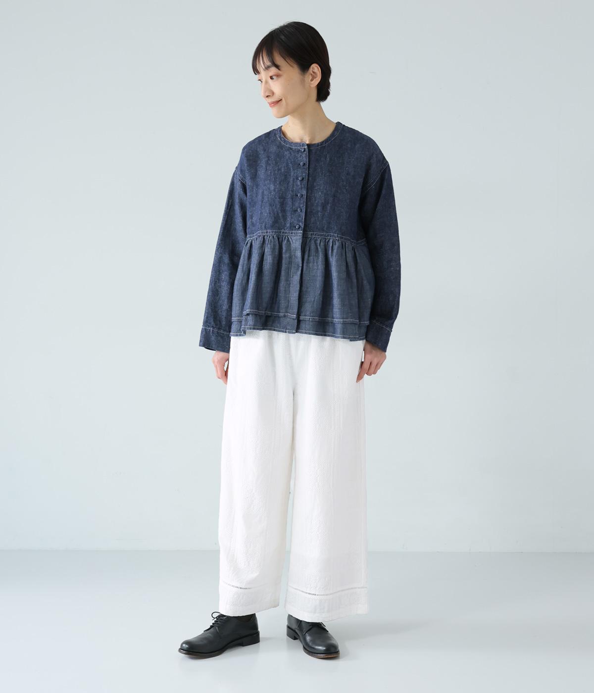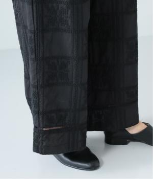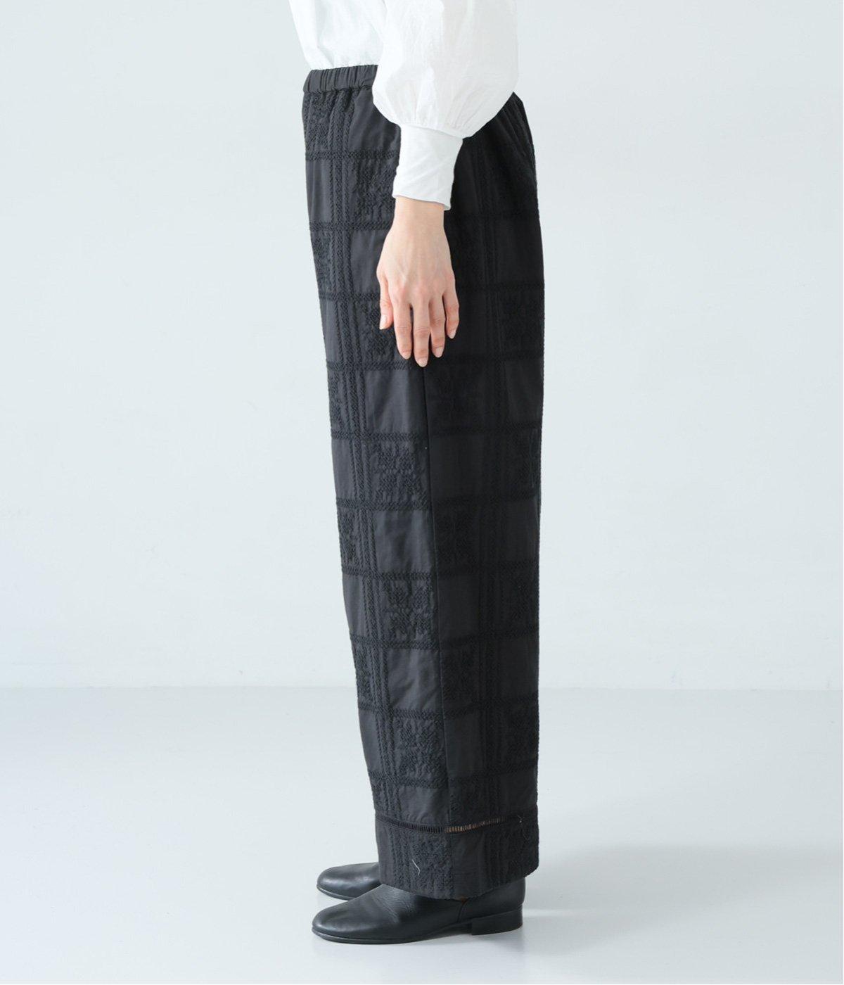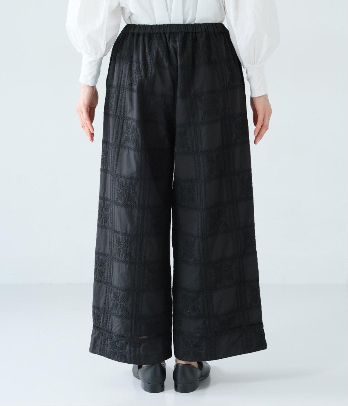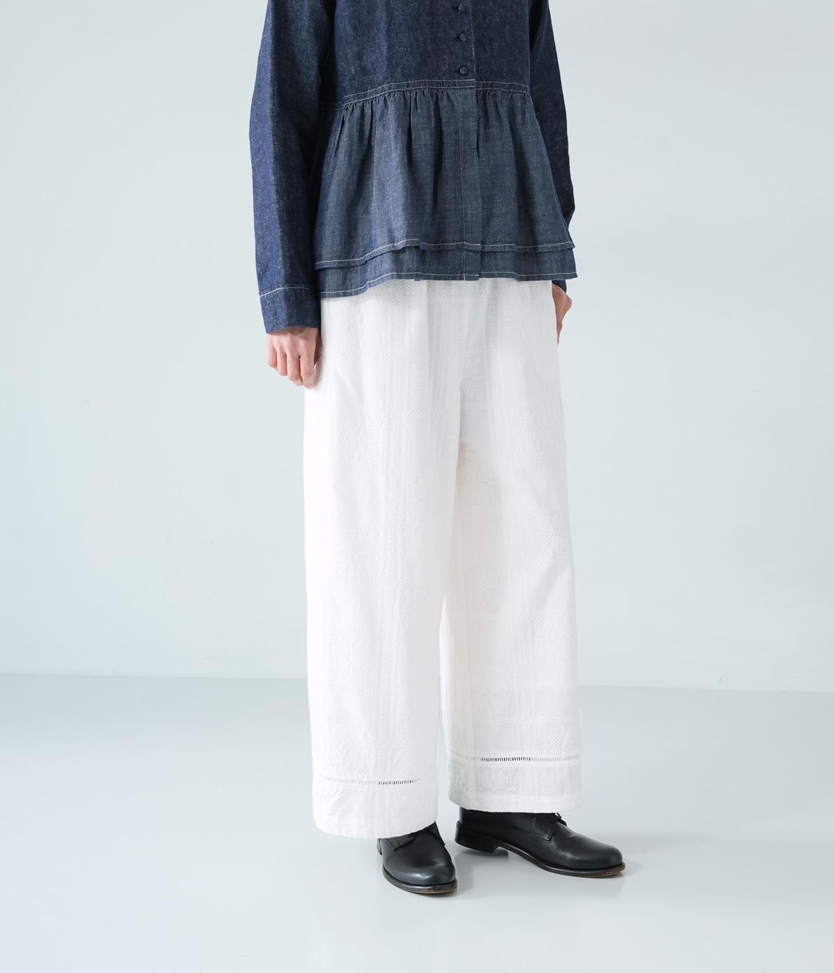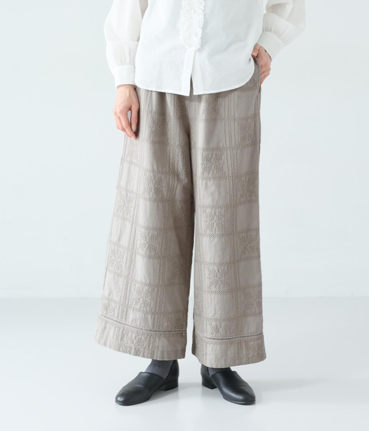 ベースと同色の糸でほどこした刺しゅうが主張しすぎず上品で、コーディネートにも取り入れやすい一本。裾のさりげないハシゴレース切り替えがアクセントにになっています。総ゴム仕様のウエストに内紐を通して、イージーなはき心地に仕上げました。