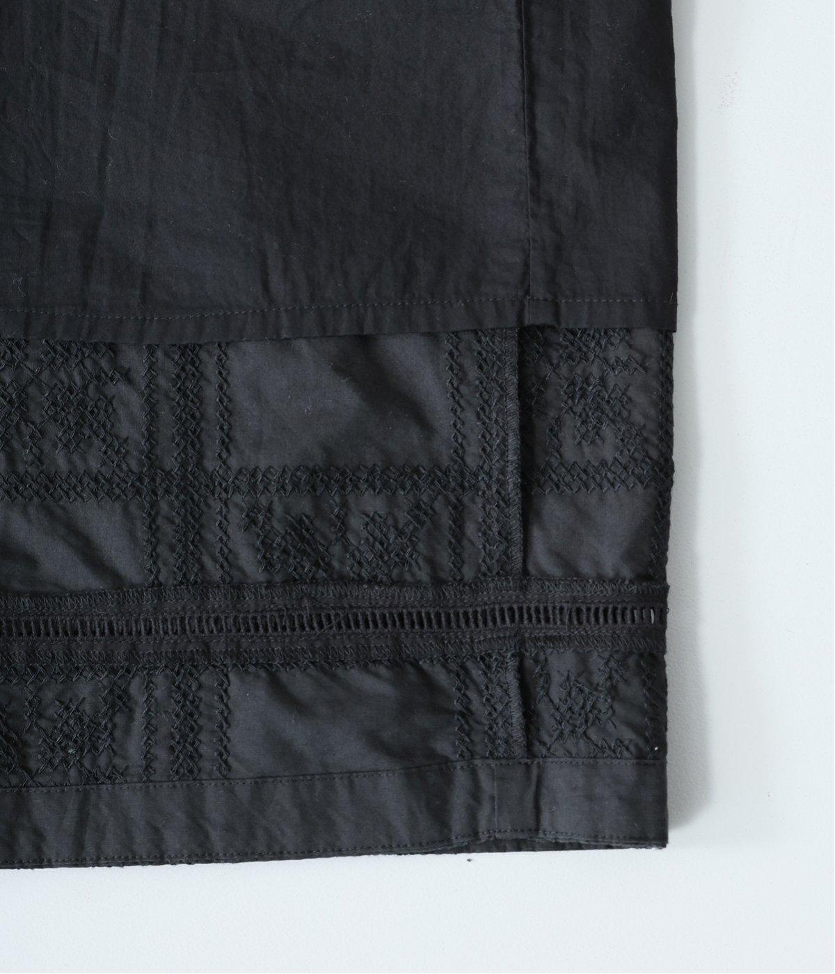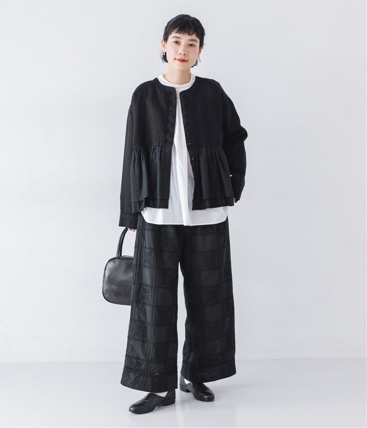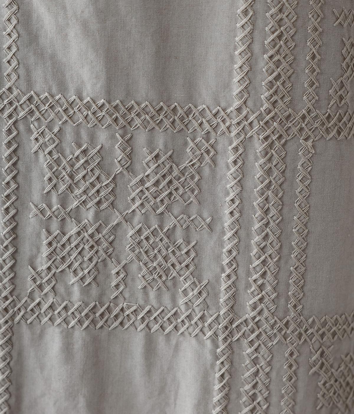 ほどよいハリ感のあるコットンテンセルリネンのツイル生地に、タイル柄モチーフの刺繍をほどこしたオリジナル生地を使用。透け感をおさえるやわらかな薄手のコットン裏地つきです。