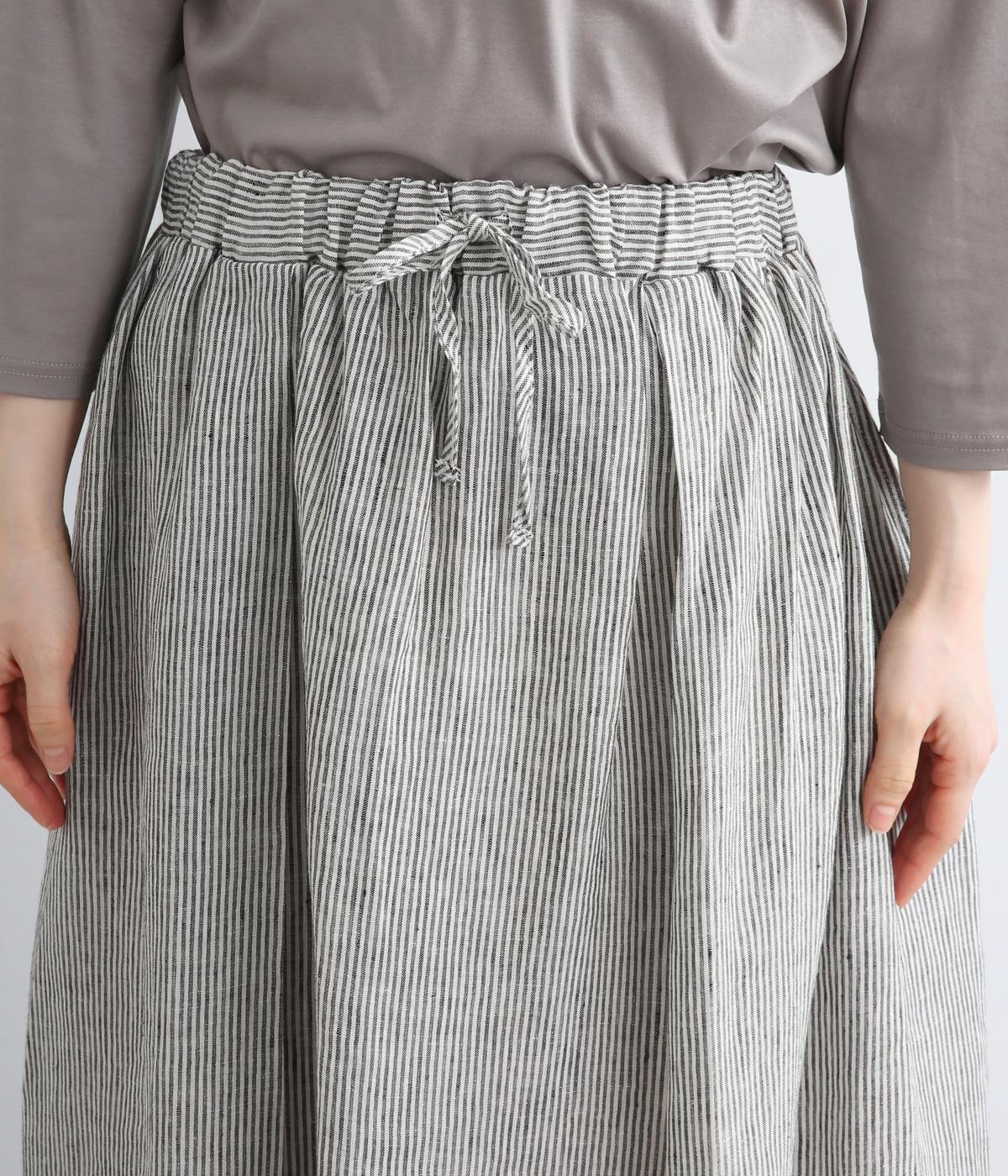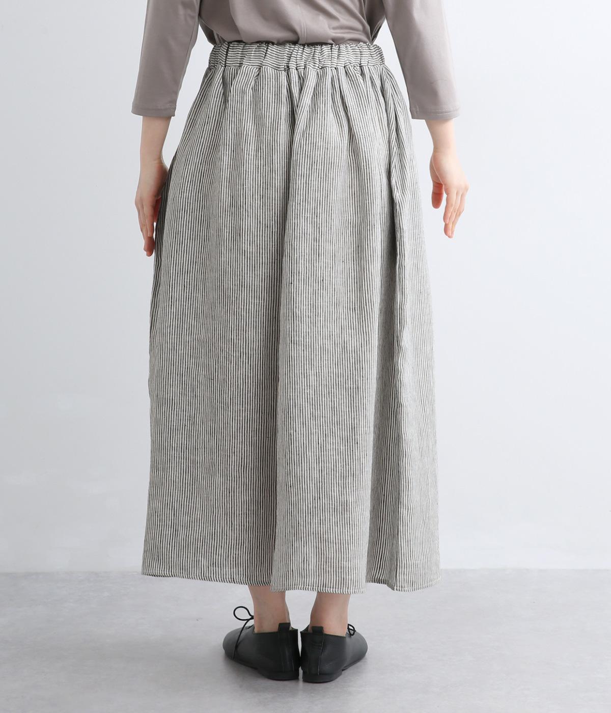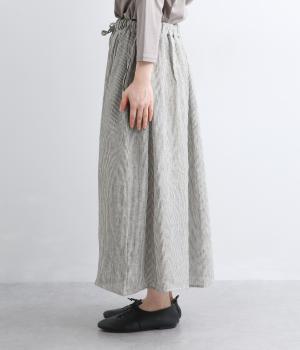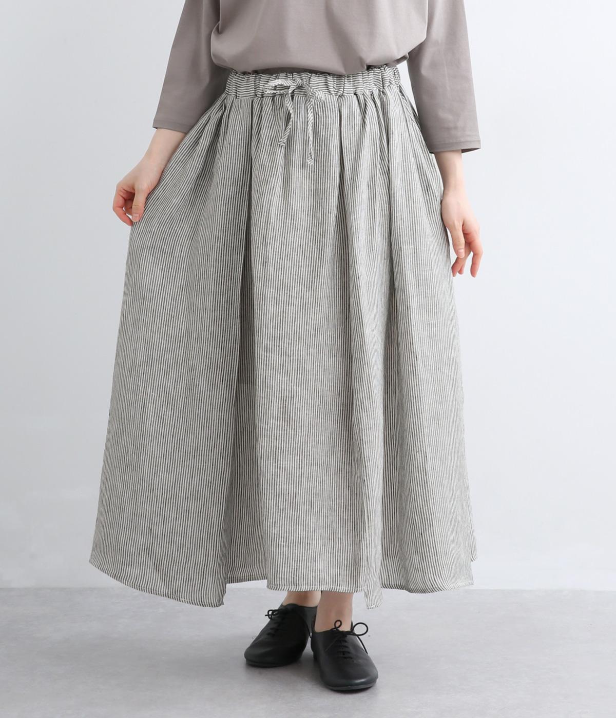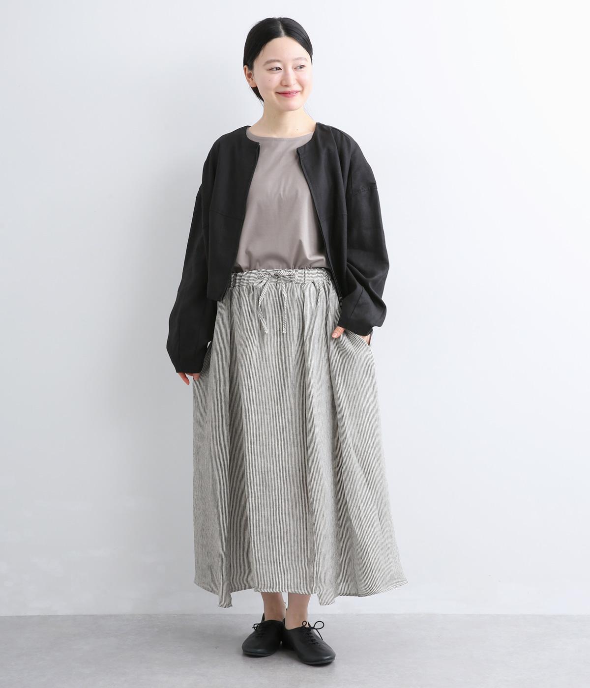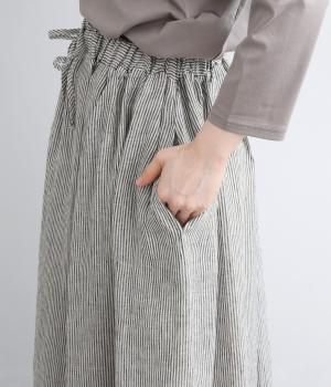 細やかなストライプ柄が縦のラインを引き立て、すっきりとした印象に。ウエストにたっぷりと寄せたギャザーが、ふんわりとした立体感のあるシルエットをつくります。フロントの裾丈にさりげなく差をつけることで動きが生まれ、軽やかな抜け感をプラス。幅広いコーディネートに合わせやすい、万能な一着です。