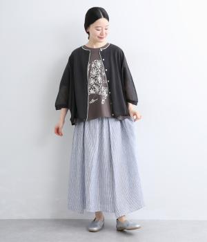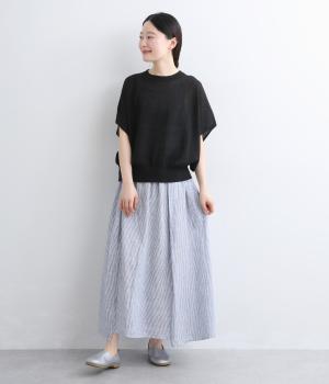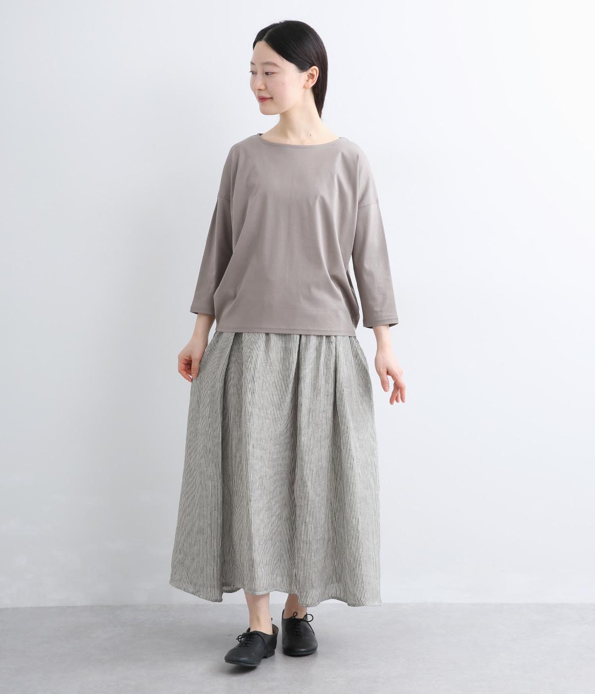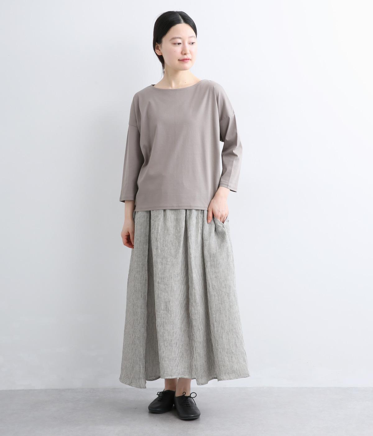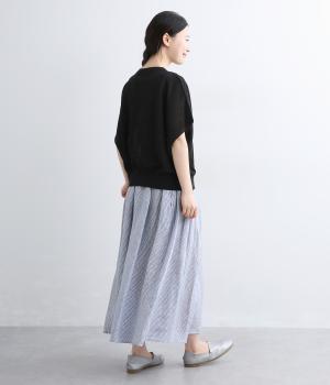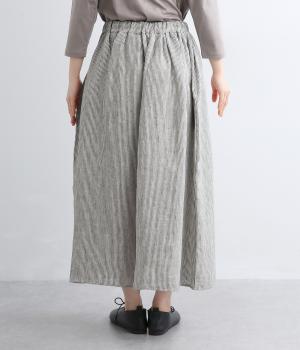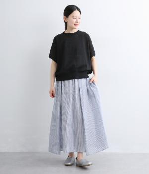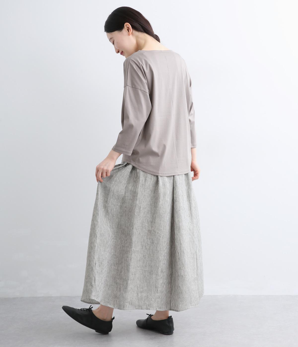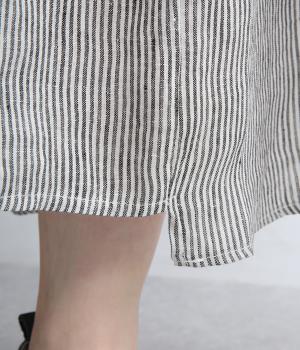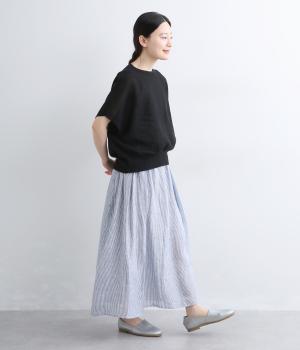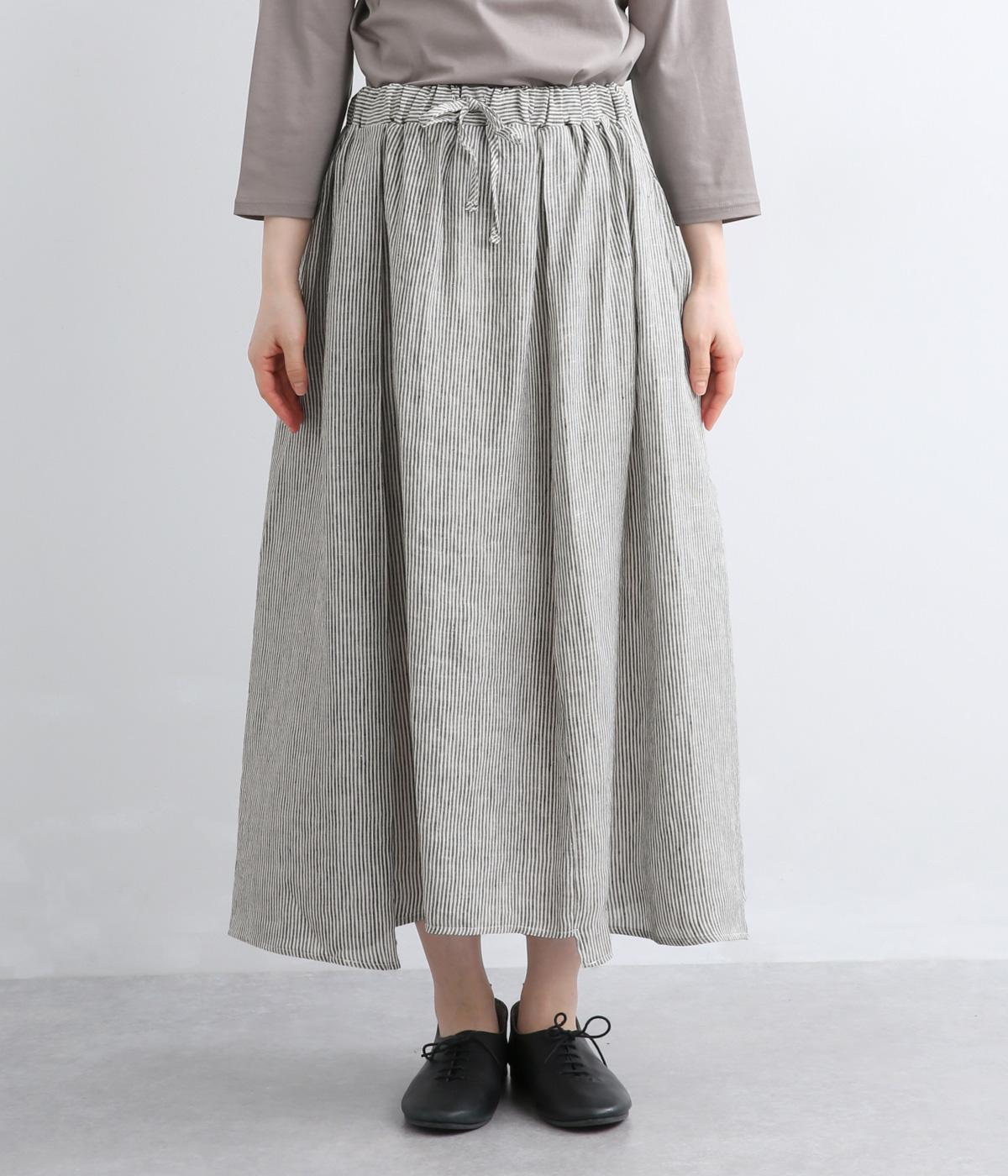細やかなストライプ柄が縦のラインを引き立て、すっきりとした印象に。ウエストにたっぷりと寄せたギャザーが、ふんわりとした立体感のあるシルエットをつくります。フロントの裾丈にさりげなく差をつけることで動きが生まれ、軽やかな抜け感をプラス。幅広いコーディネートに合わせやすい、万能な一着です。