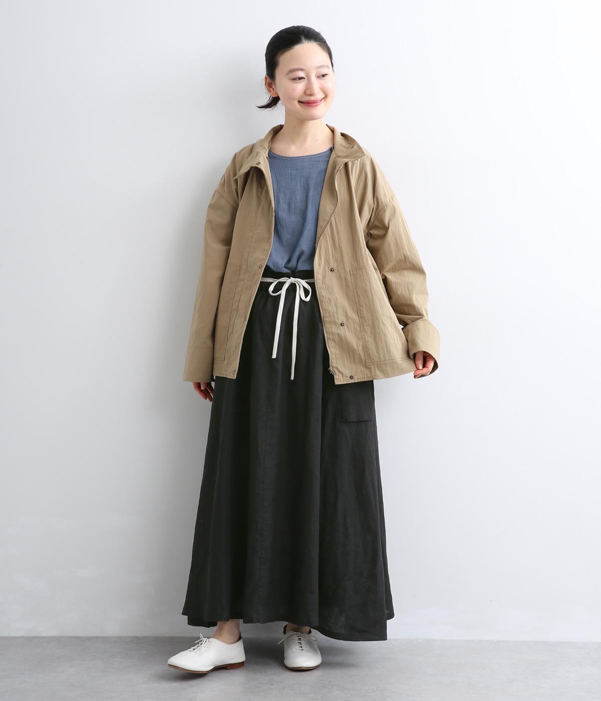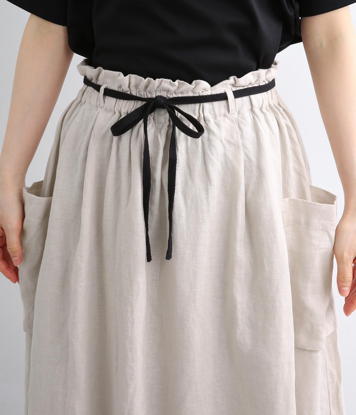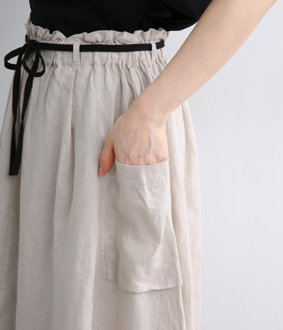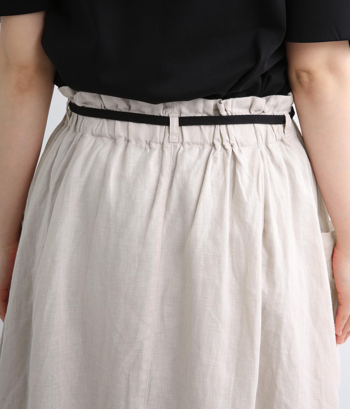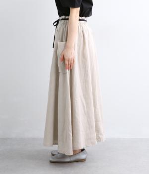 ハリのある生地にたっぷりとギャザーを寄せ、ふわりと広がる立体的なシルエットに仕上げました。サイドには存在感のあるパッチポケットを配し、ほどよいアクセントを添えています。ウエストの配色紐でアレンジも自在。裏地つきなので、安心してはけるのもうれしいポイントです。