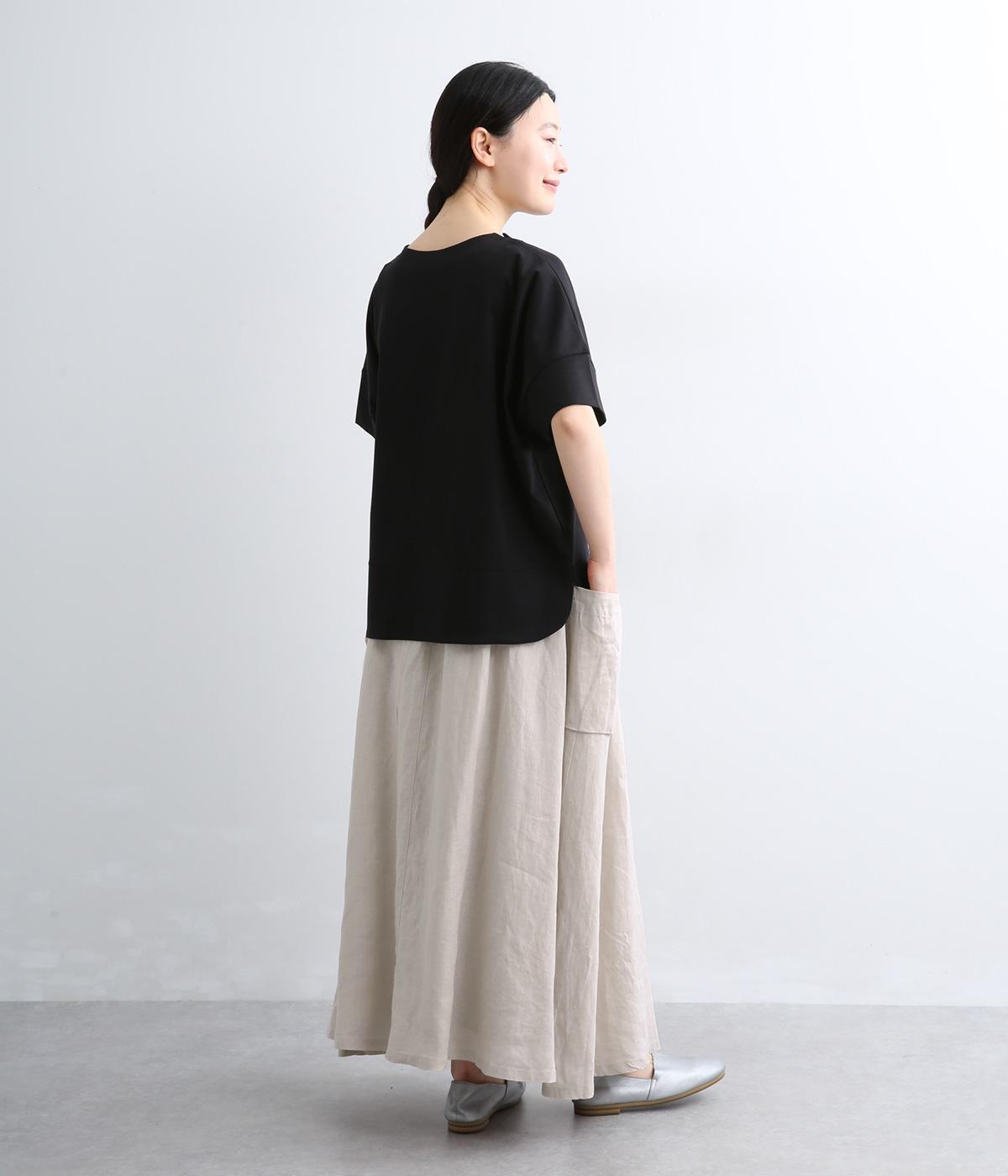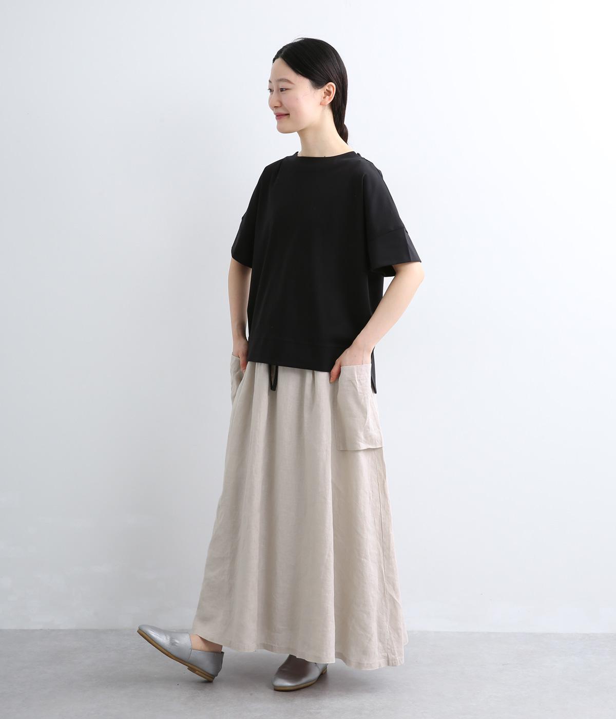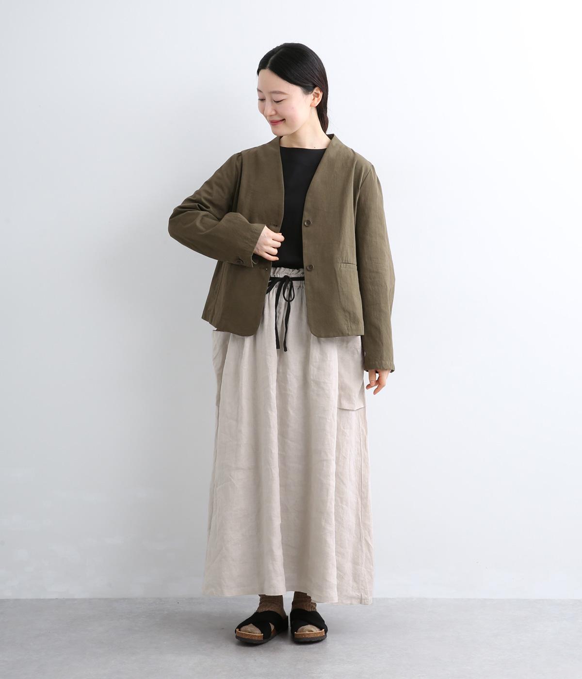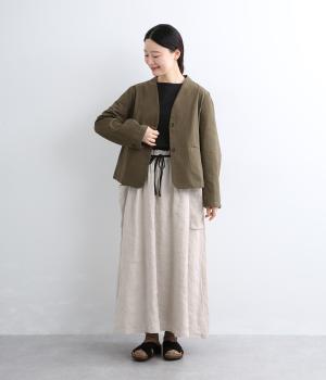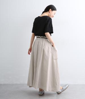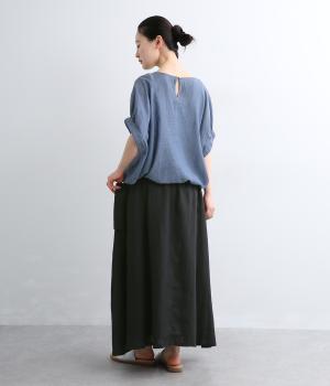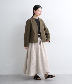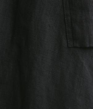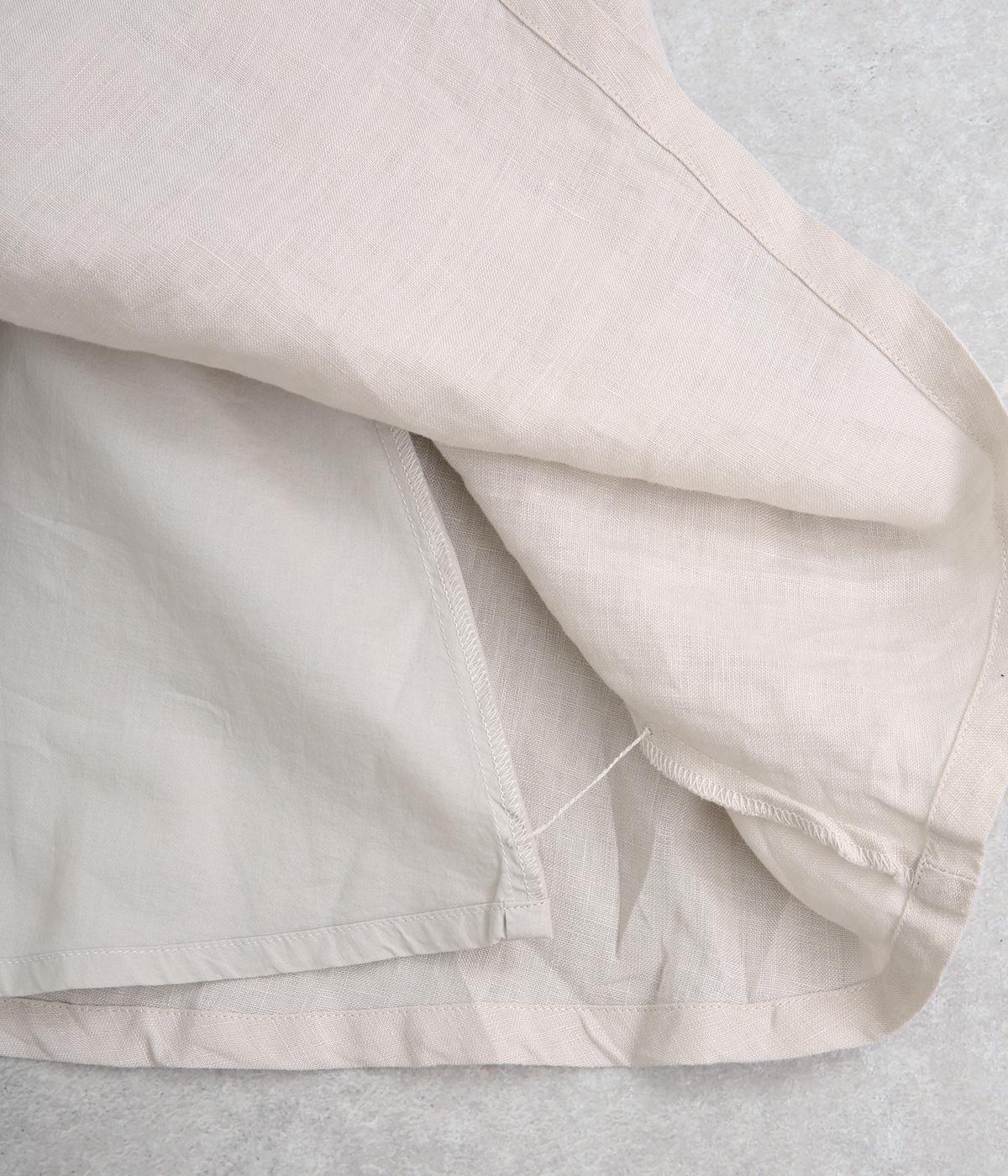 さらりとした肌ざわりが心地よい、フレンチリネンの平織り生地を使用しました。ほどよいハリがありながらも、着用するほどにやわらかくなじみ、自然な風合いが深まります。通気性と吸湿性にもすぐれ、汗ばむ季節も快適に過ごせる素材です。