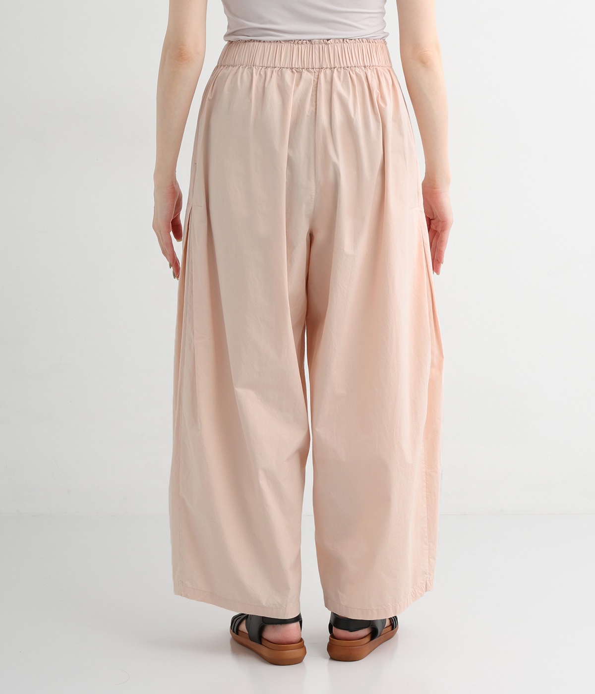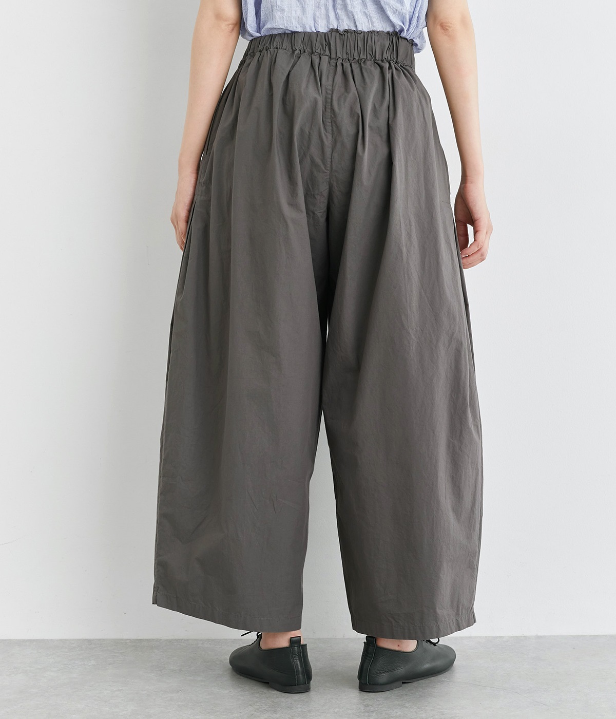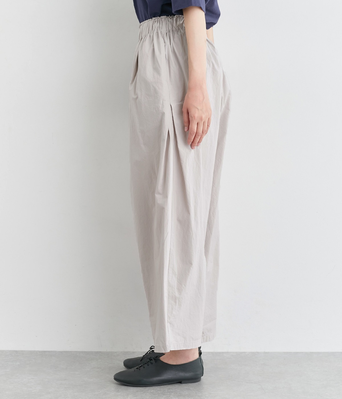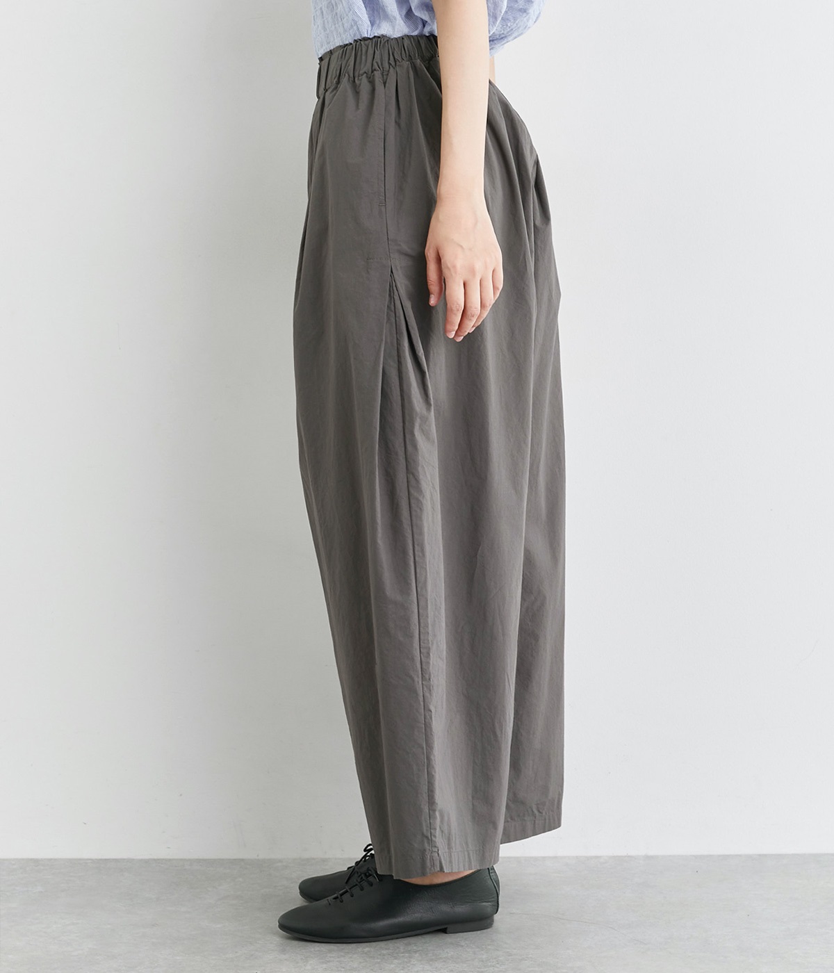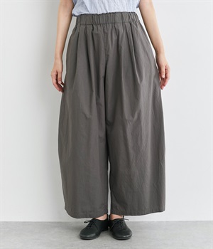 前タックやサイドタックをバランスよく入れ、イージーパンツながらきちんと感のある立体的なシルエットのブランド定番パンツ。ウエストはストレスフリーな総ゴムで、ベルト幅太めでトップスインもお洒落見えする仕立てに。