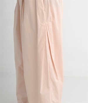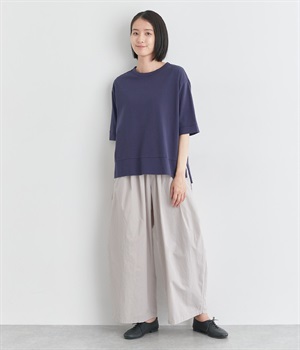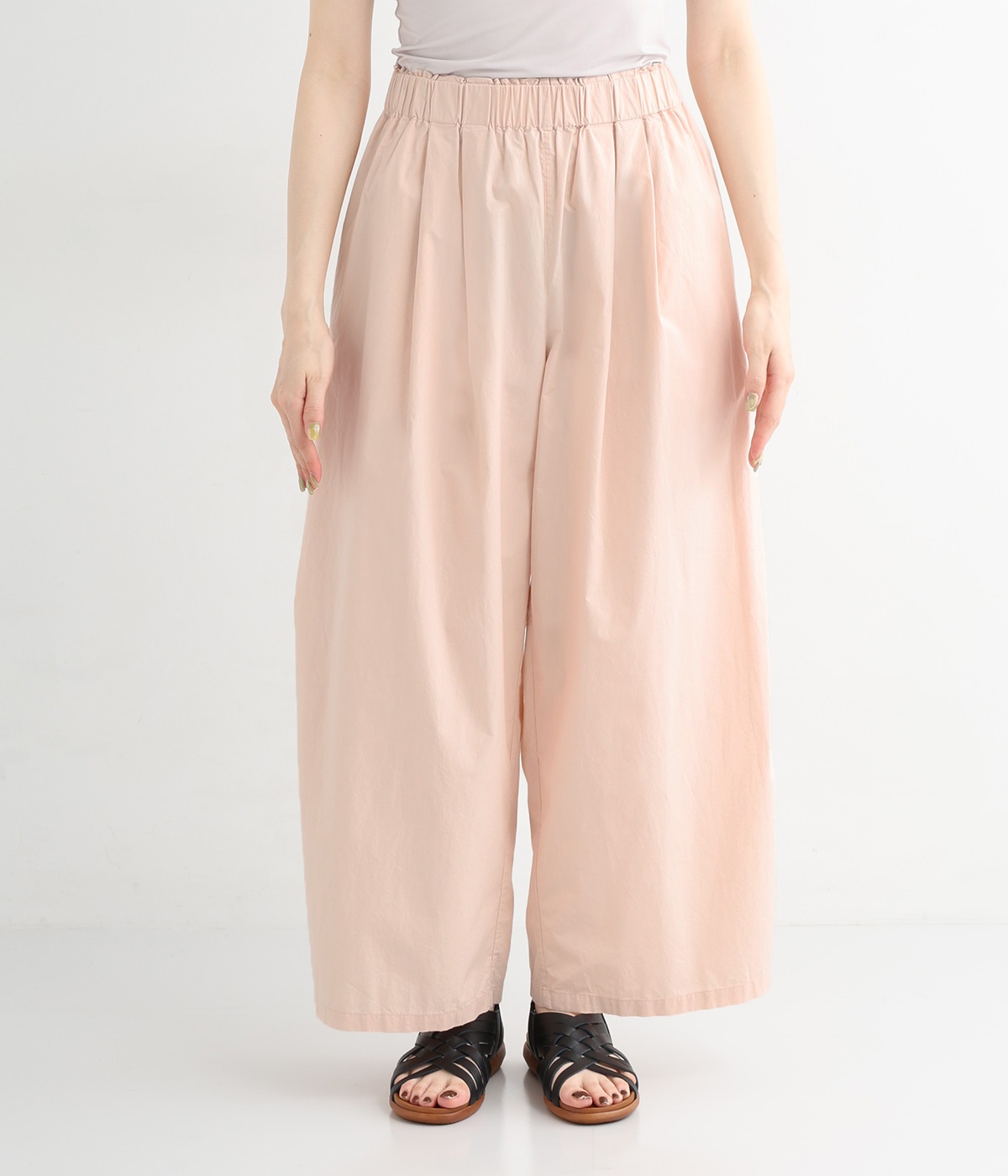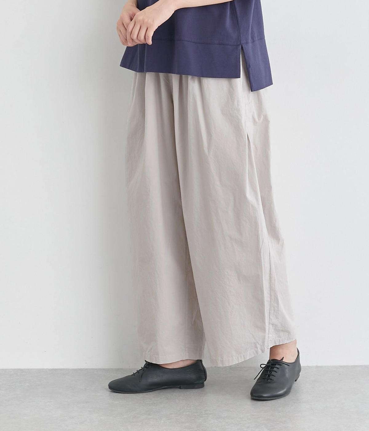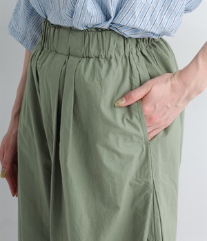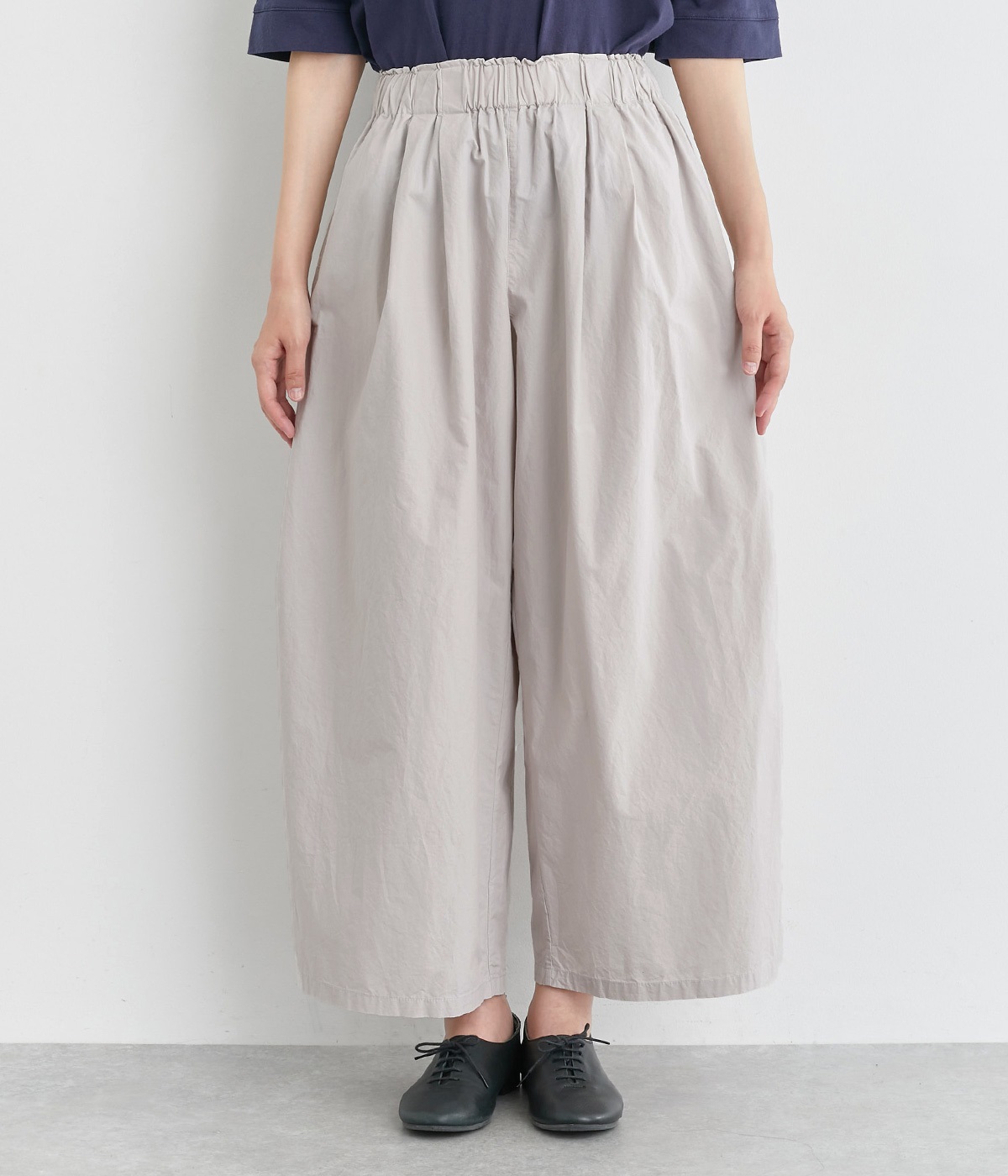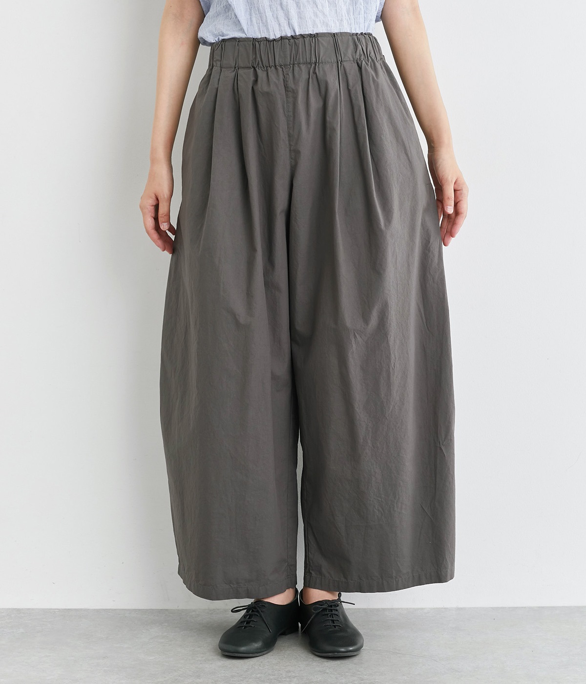 前タックやサイドタックをバランスよく入れ、イージーパンツながらきちんと感のある立体的なシルエットのブランド定番パンツ。ウエストはストレスフリーな総ゴムで、ベルト幅太めでトップスインもお洒落見えする仕立てに。