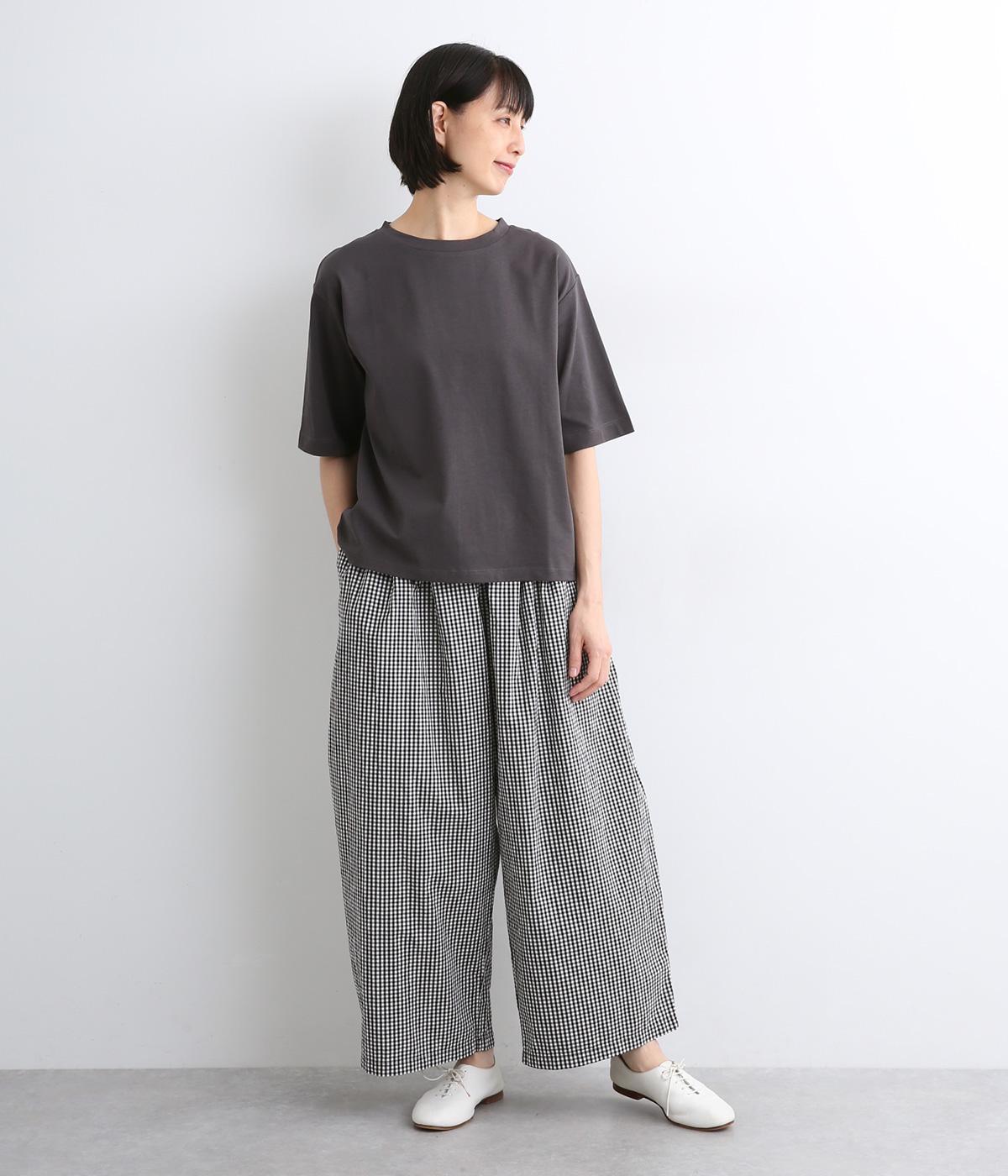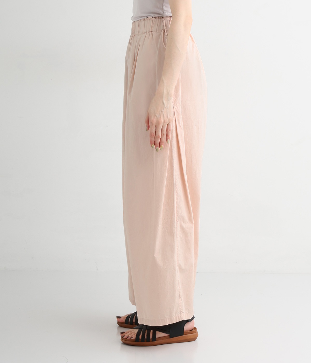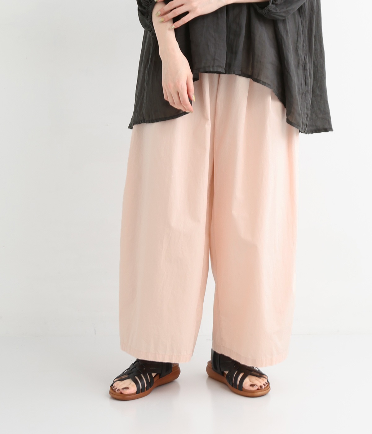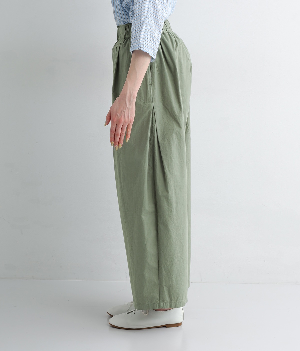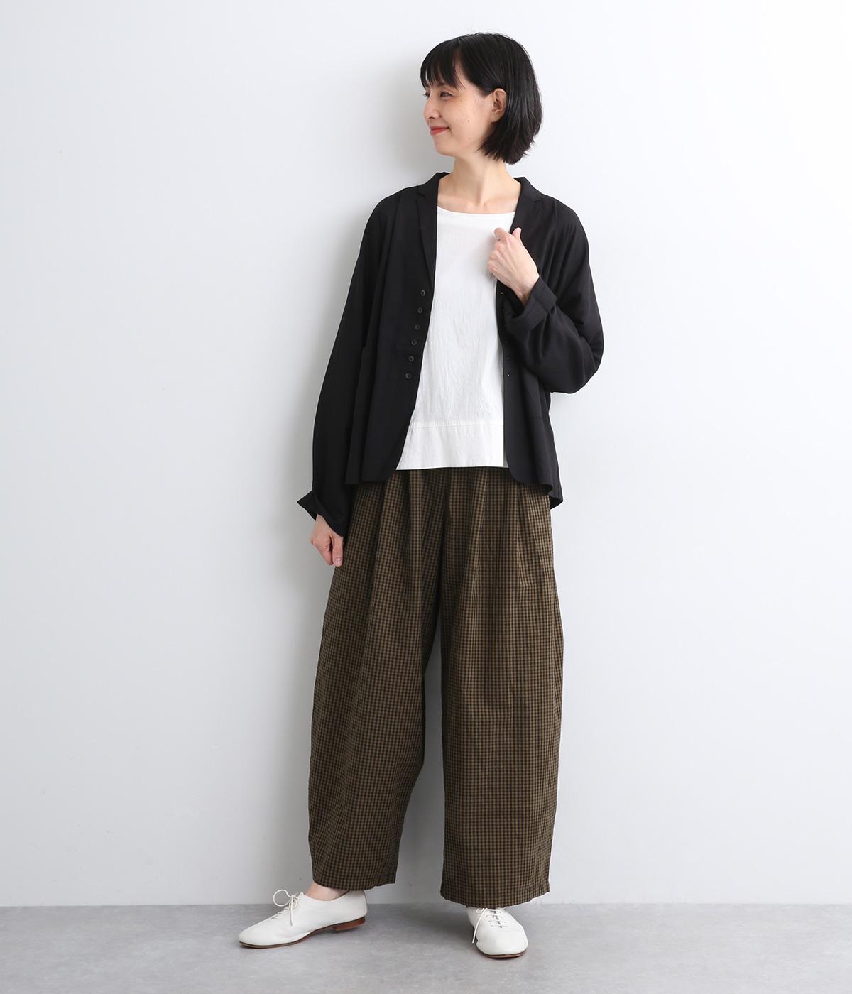 前タックやサイドタックをバランスよく入れ、イージーパンツながらきちんと感のある立体的なシルエットのブランド定番パンツ。ウエストはストレスフリーな総ゴムで、ベルト幅太めでトップスインもお洒落見えする仕立てに。