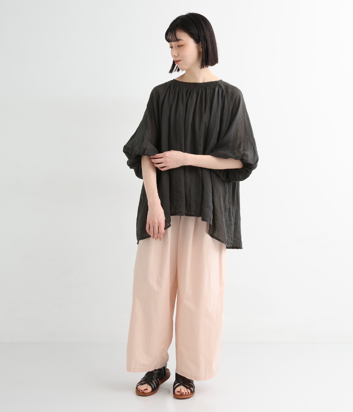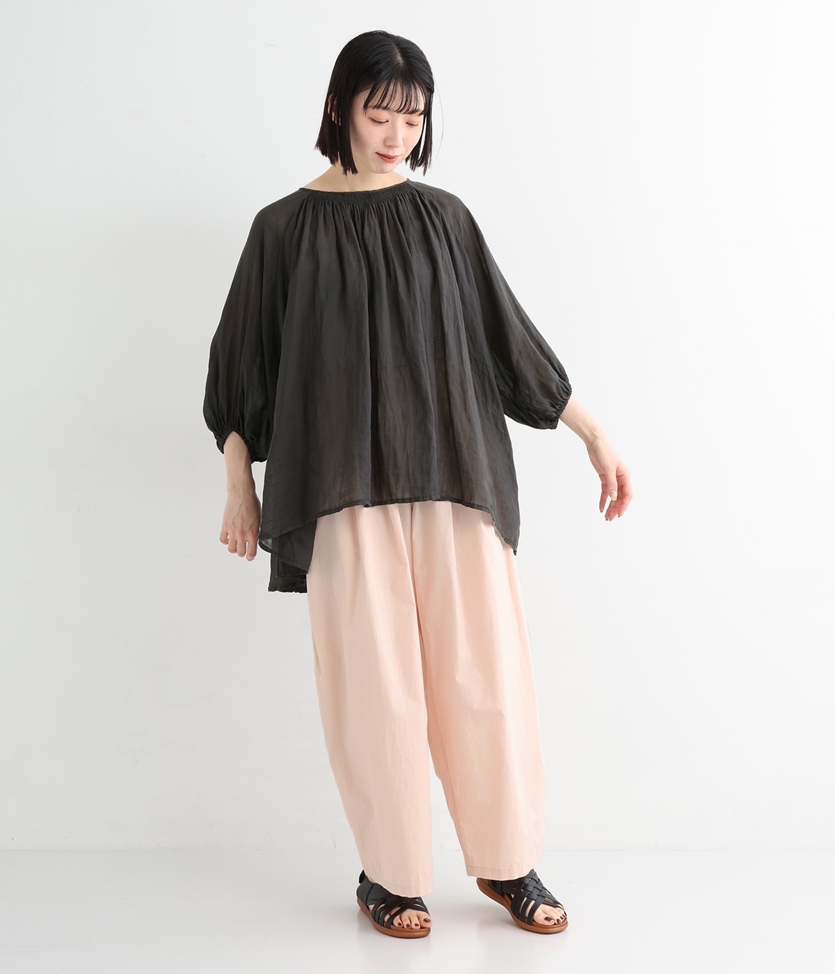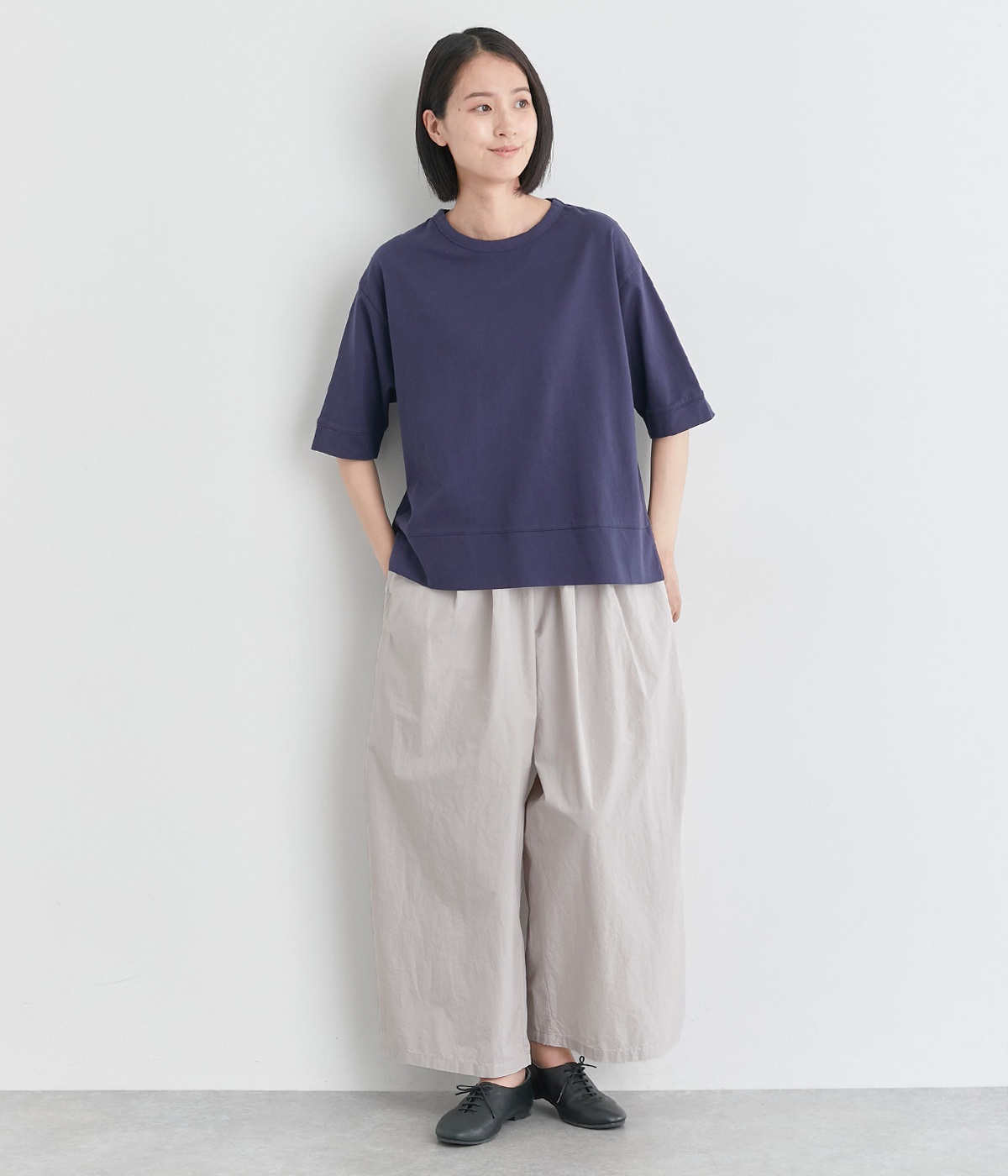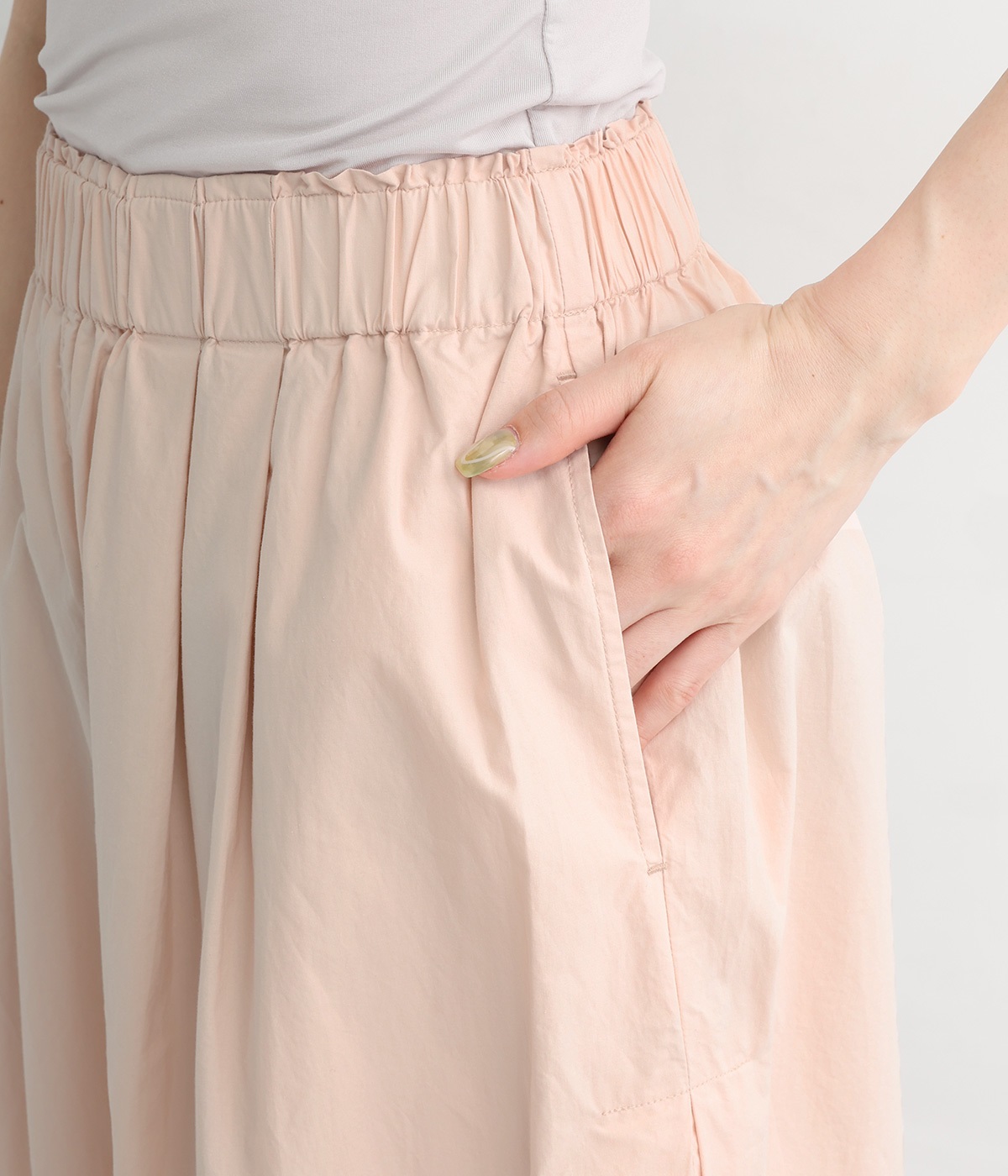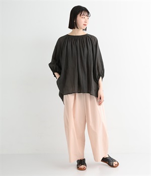 前タックやサイドタックをバランスよく入れ、イージーパンツながらきちんと感のある立体的なシルエットのブランド定番パンツ。ウエストはストレスフリーな総ゴムで、ベルト幅太めでトップスインもお洒落見えする仕立てに。