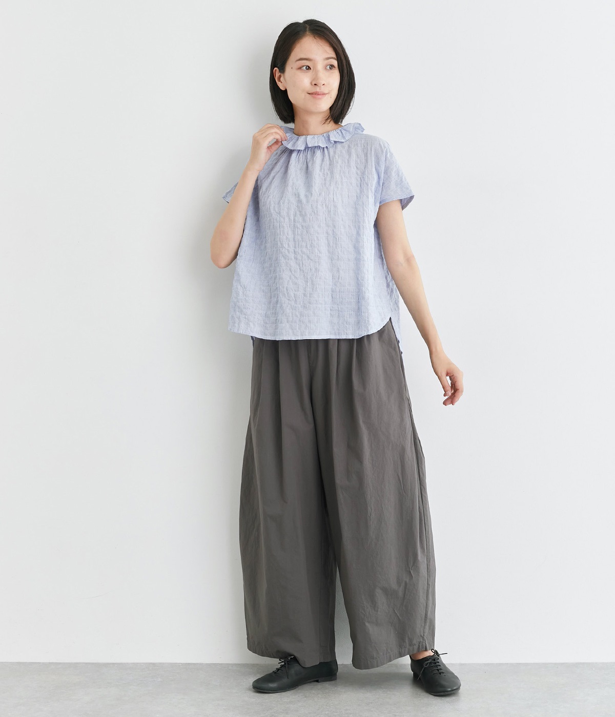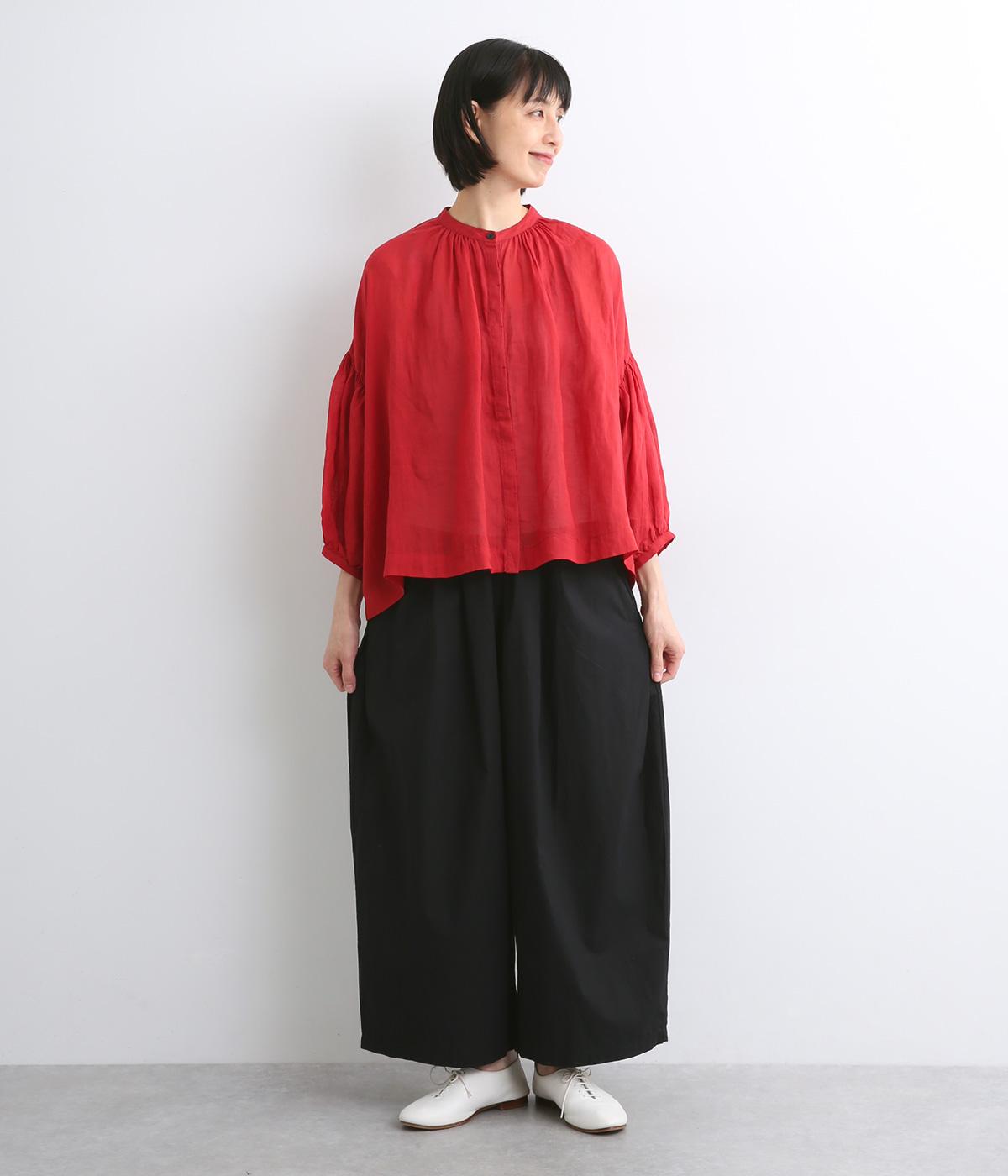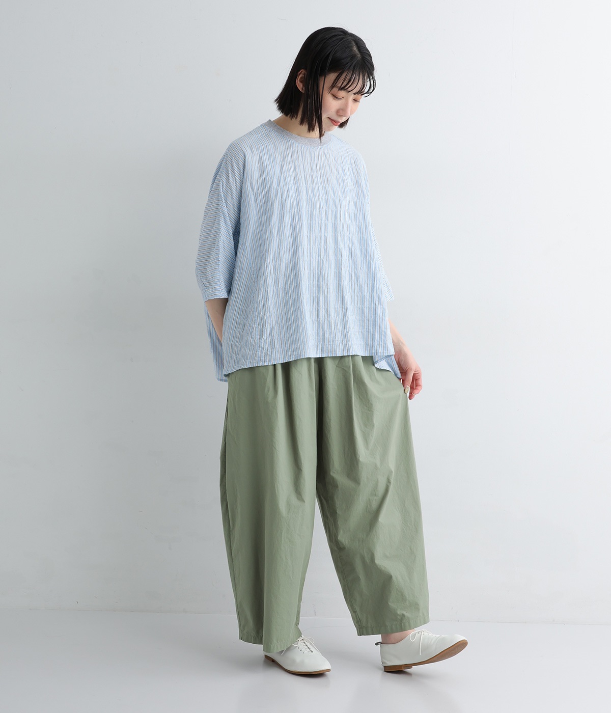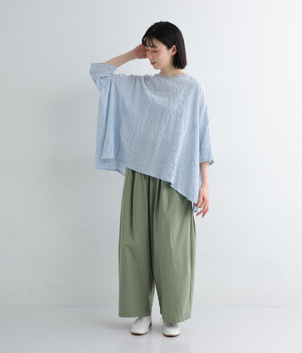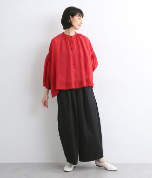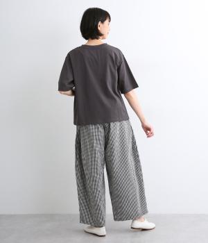高密度に織り上げたコットン生地に洗いをかけ表面感を出したコットンクロスを使用しています。薄手ながらほのかなハリやふくらみがあり、肌へのまとわりも少なく快適です。