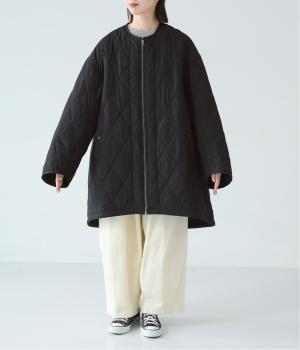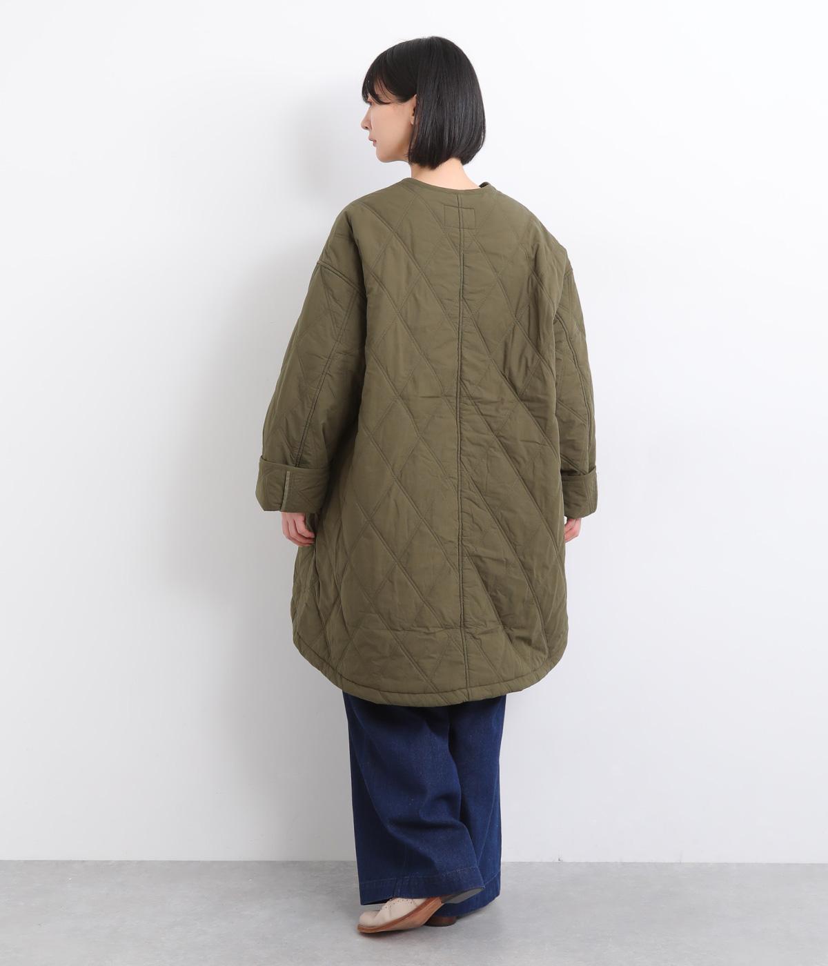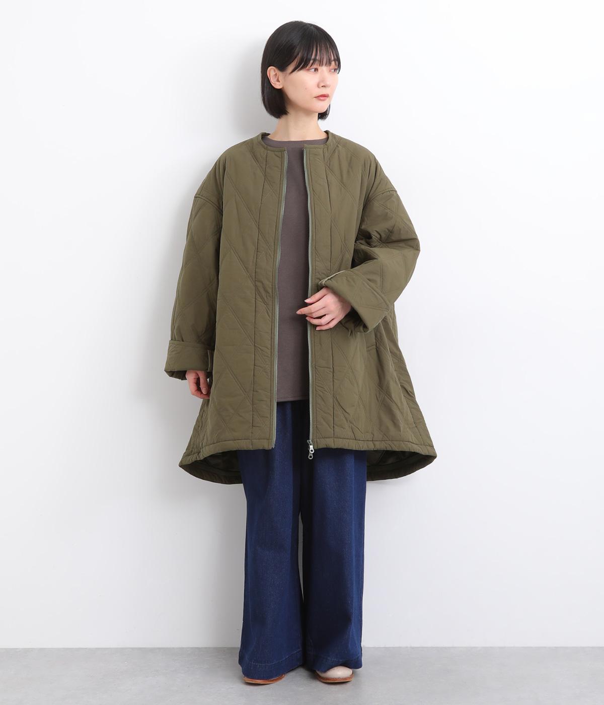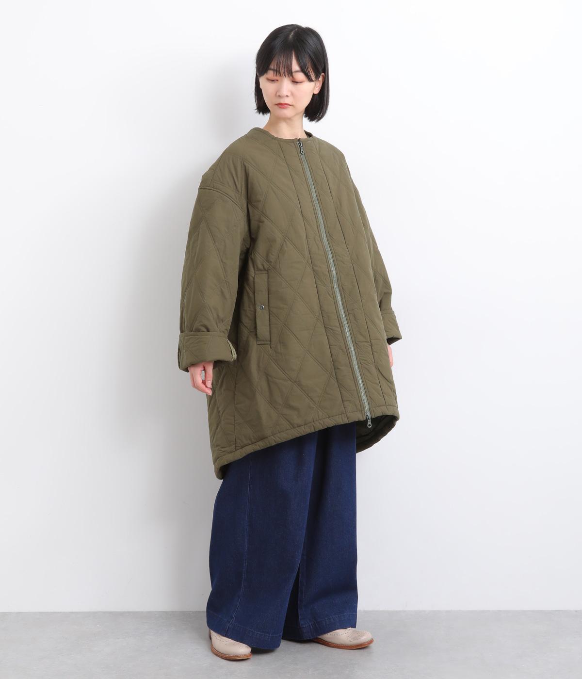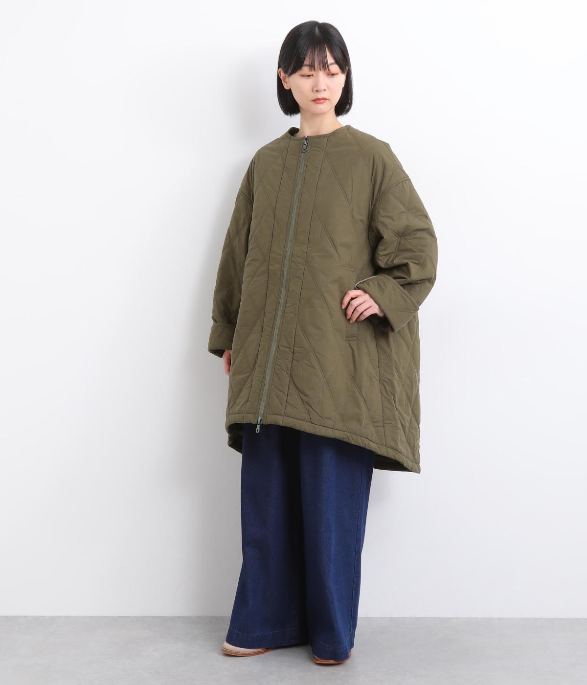 ふっくら感がありながらも厚みはなく、すっきり着られるジップコート。シンプルな襟元は重さを感じず、軽快でラフな印象が◎。キルトコートならではのステッチがほどよいアクセントになっています。ひざあたりまですっぽり隠れる丈感が、体のラインを上手にカバー。