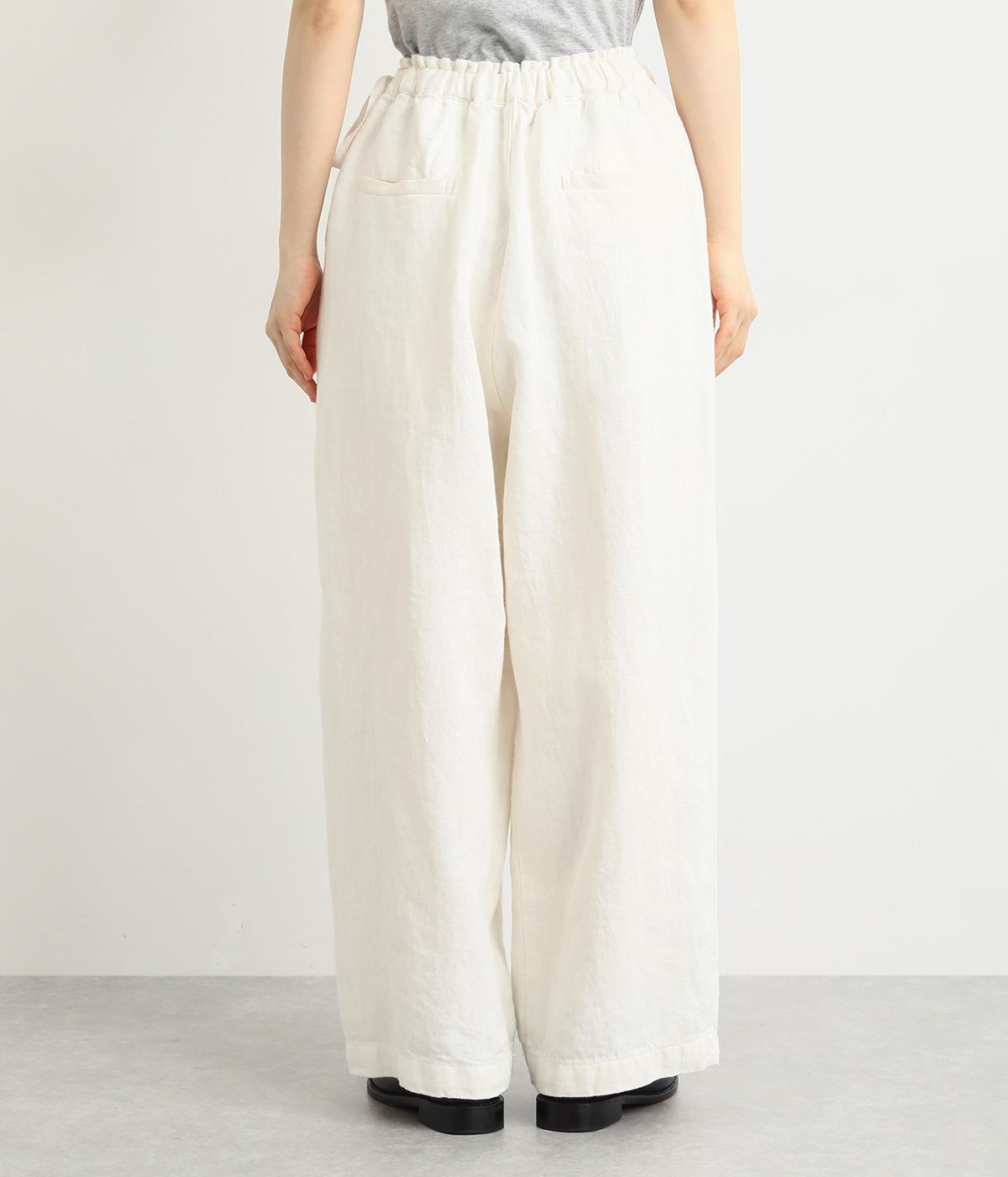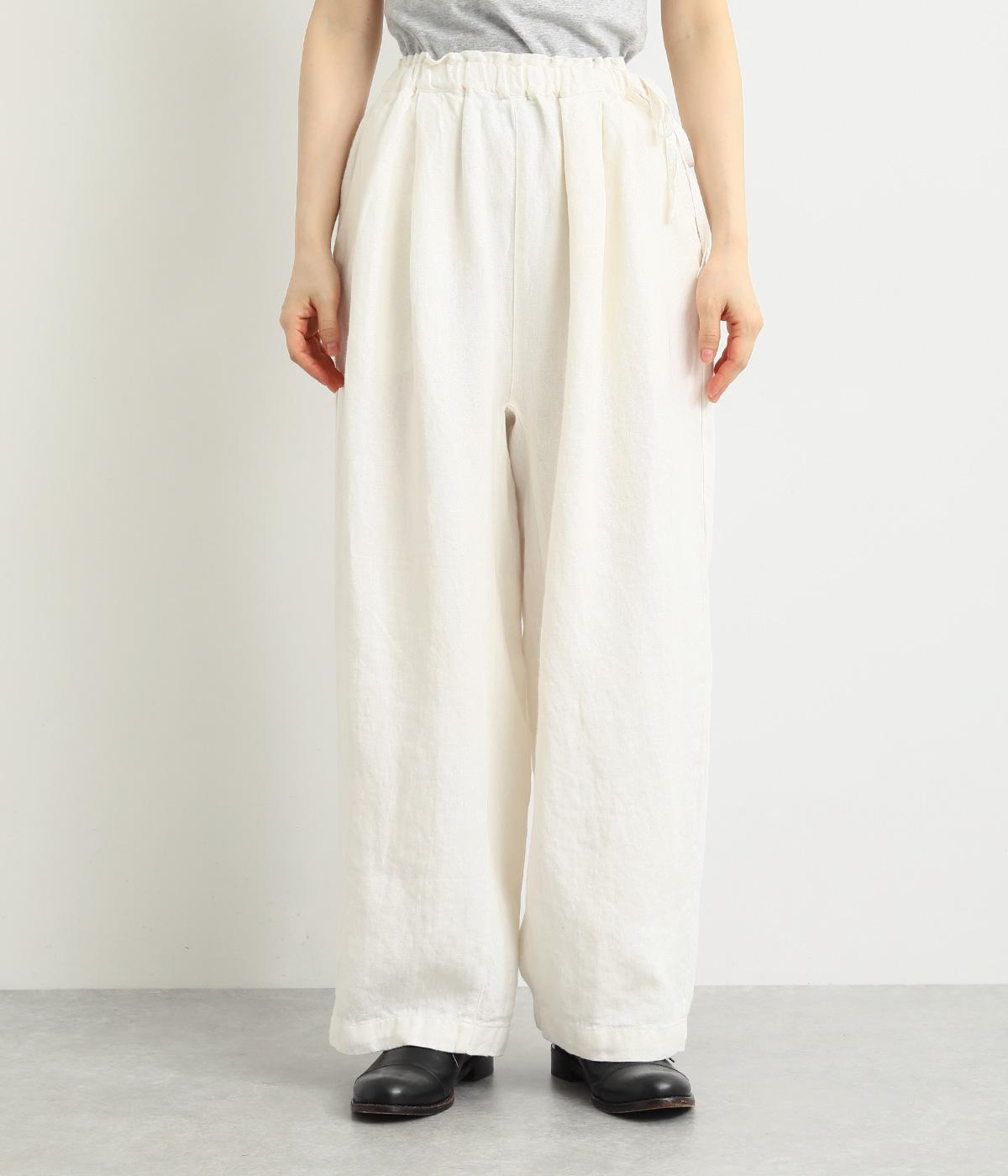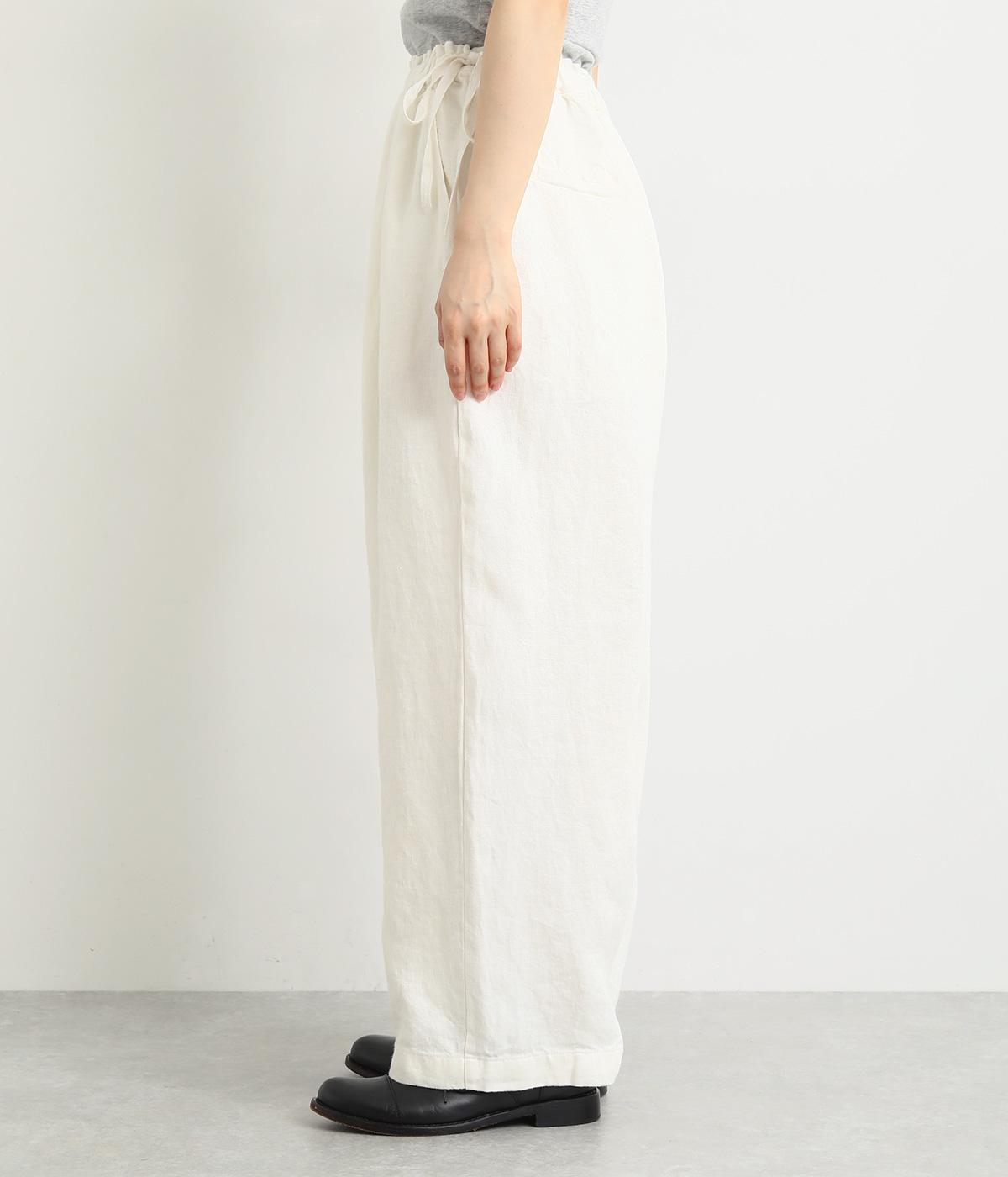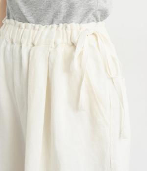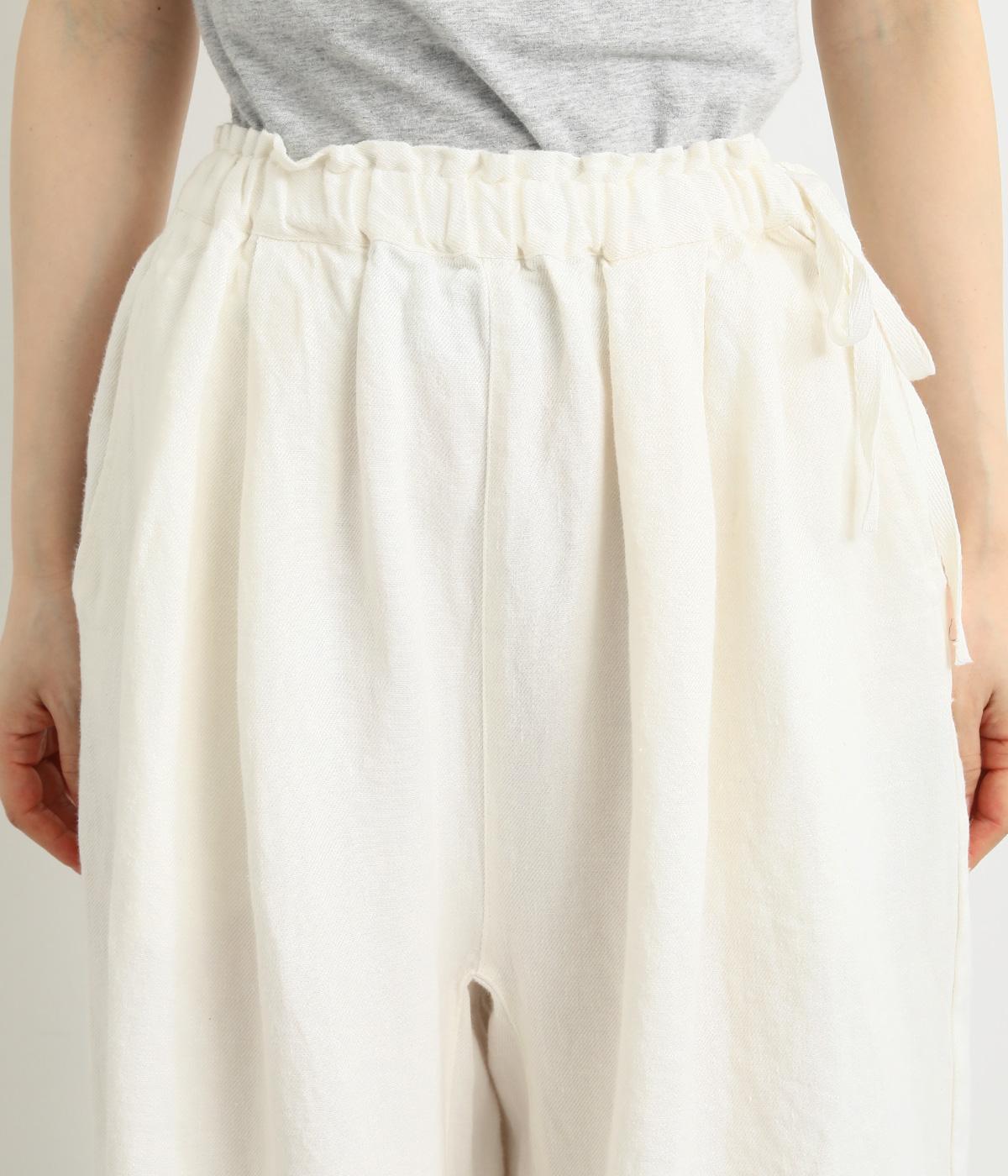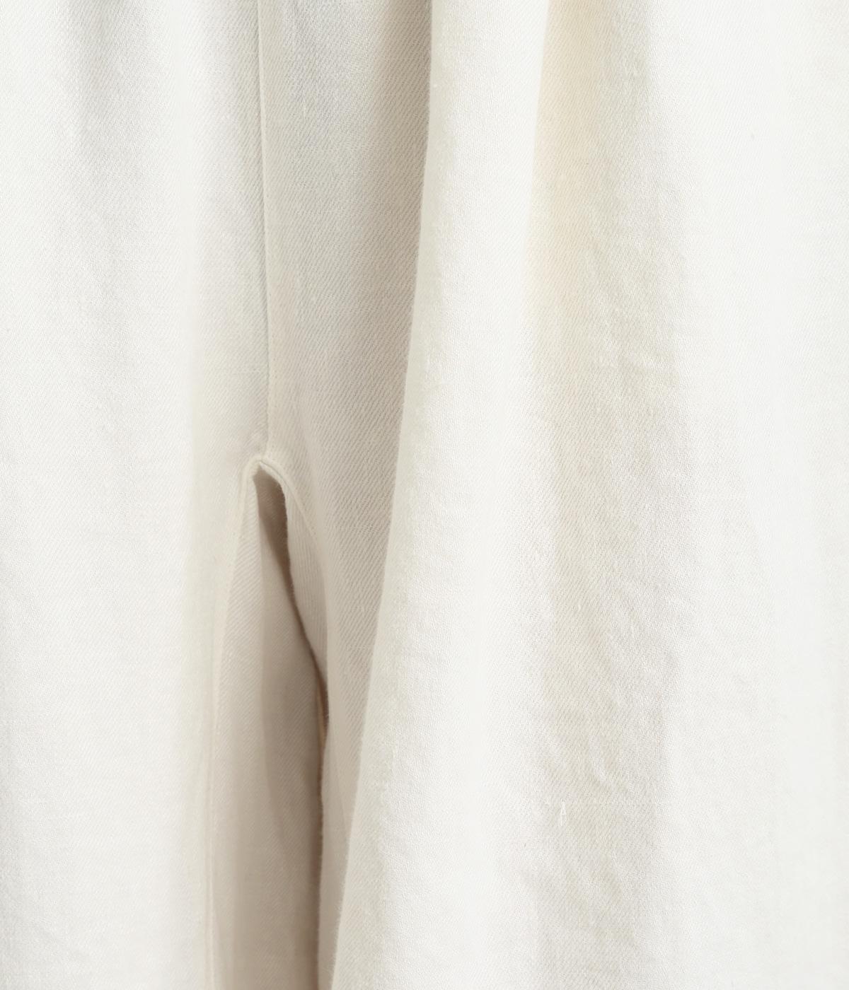 股にマチを付けたカラテパンツに見られる仕様を採用しました。動きやすくリラックス感がありながら、履いたシルエットがとてもきれいに仕上がりました。サイドは紐仕様にしてアクセントと調整機能をつけました。