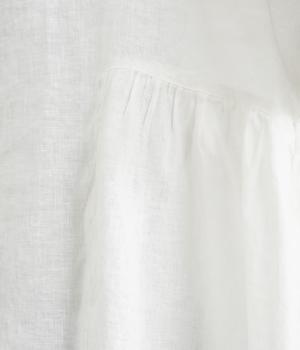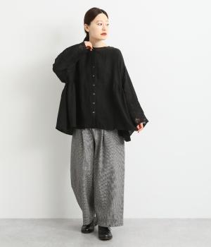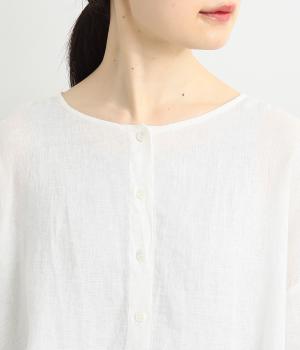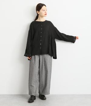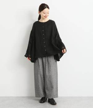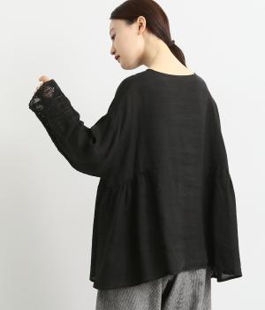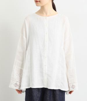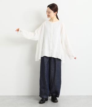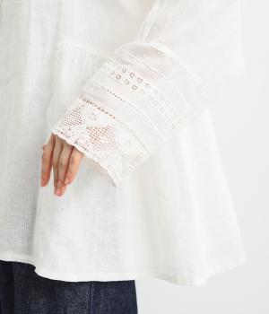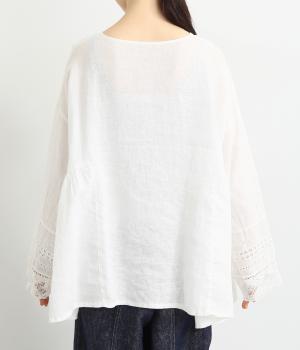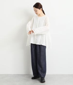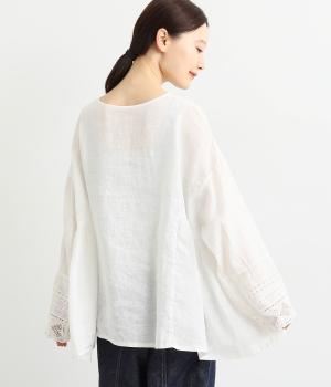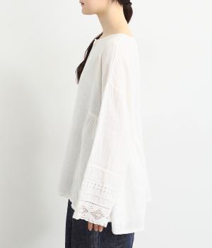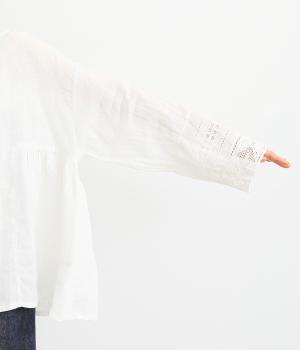 脇にギャザーを入れたシンプルなAラインシルエット。ノーカラーで首まわりはすっきりさせつつ、袖にはスカラ刺繍とレースを組み合わせました。全体的にゆったりとしたシルエットが涼やかで、着まわしできるブラウスです。