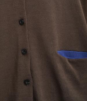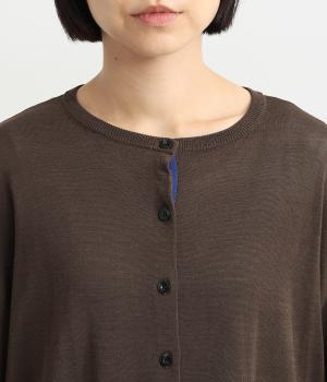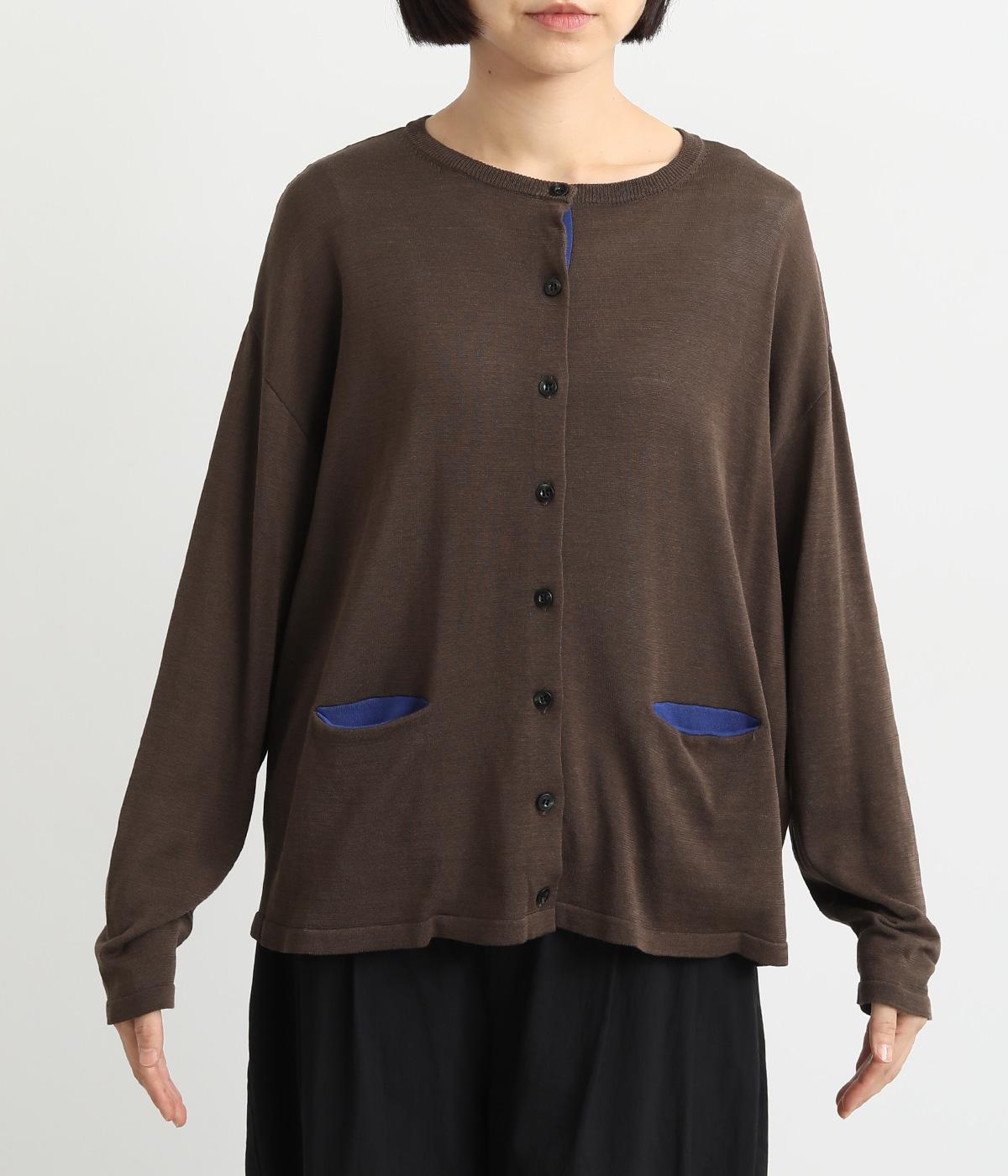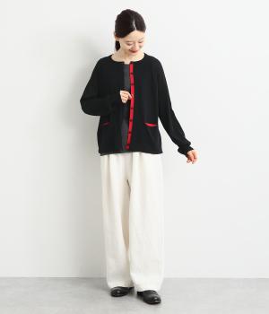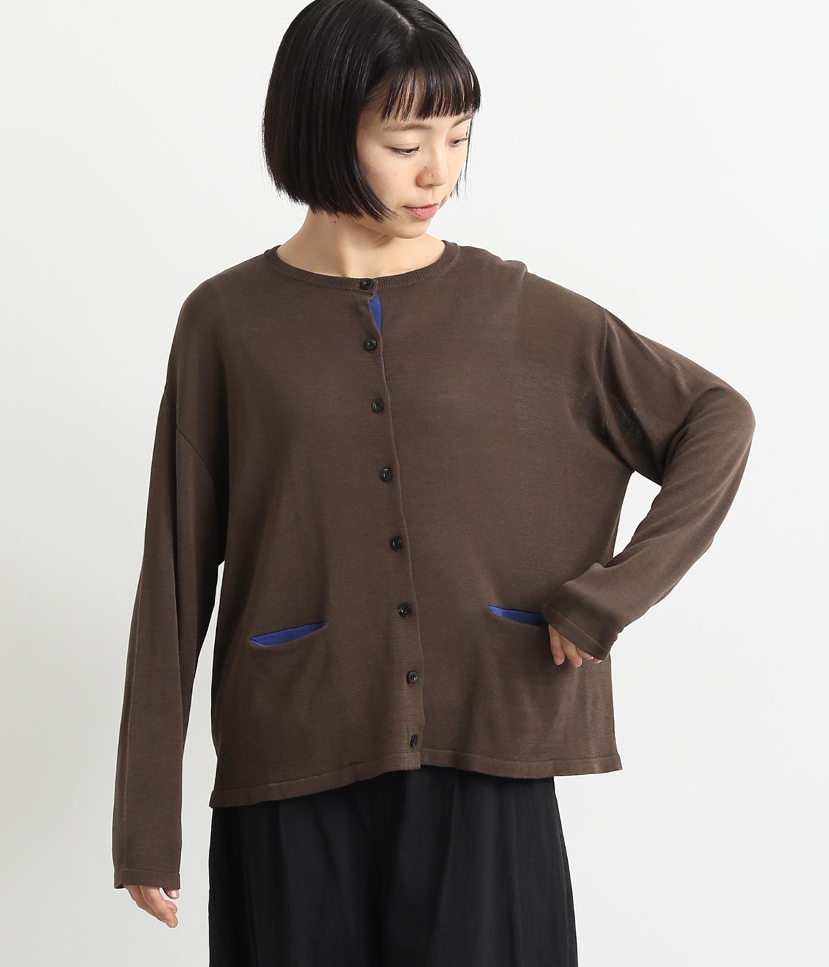 なめらかな肌ざわりのハイゲージニットに仕立てました。下前立てとポケットを配色にして、ポイントカラーでアクセントに。シンプルなコーディネートにそっと華やかさを与えてくれます。