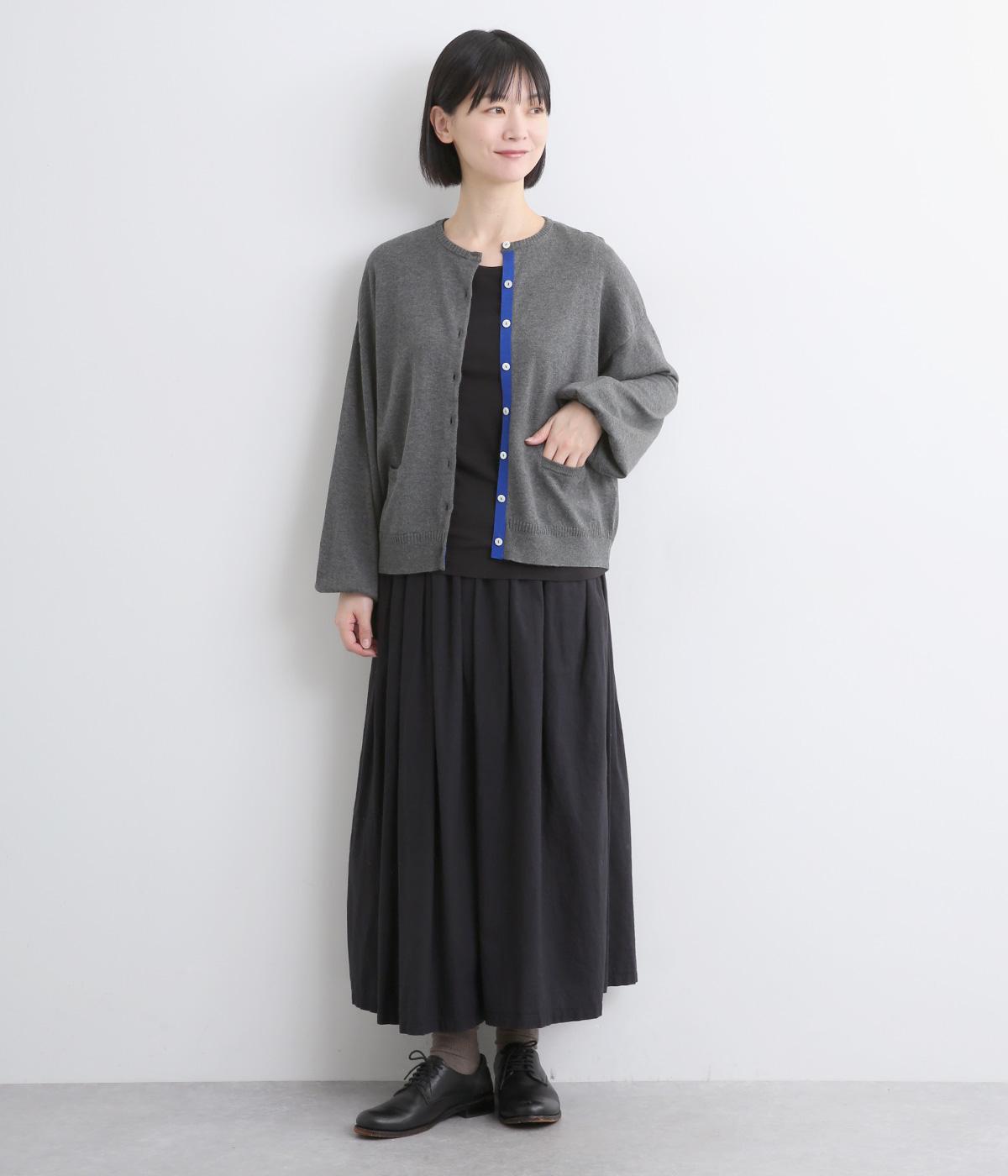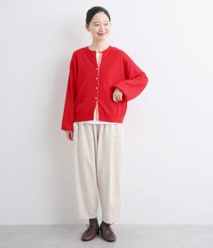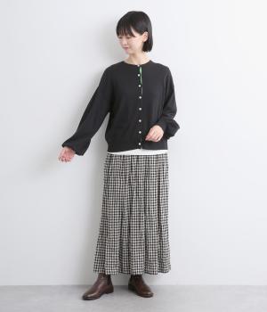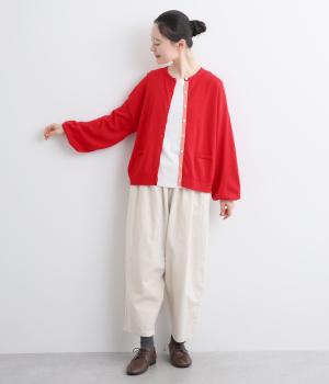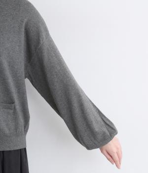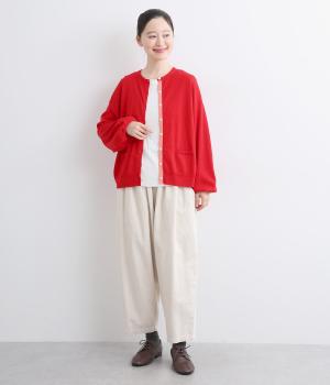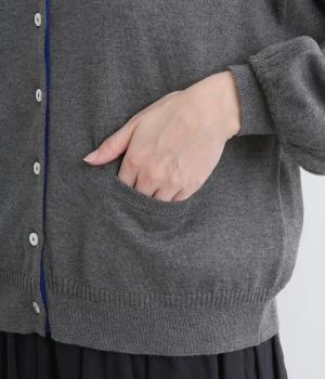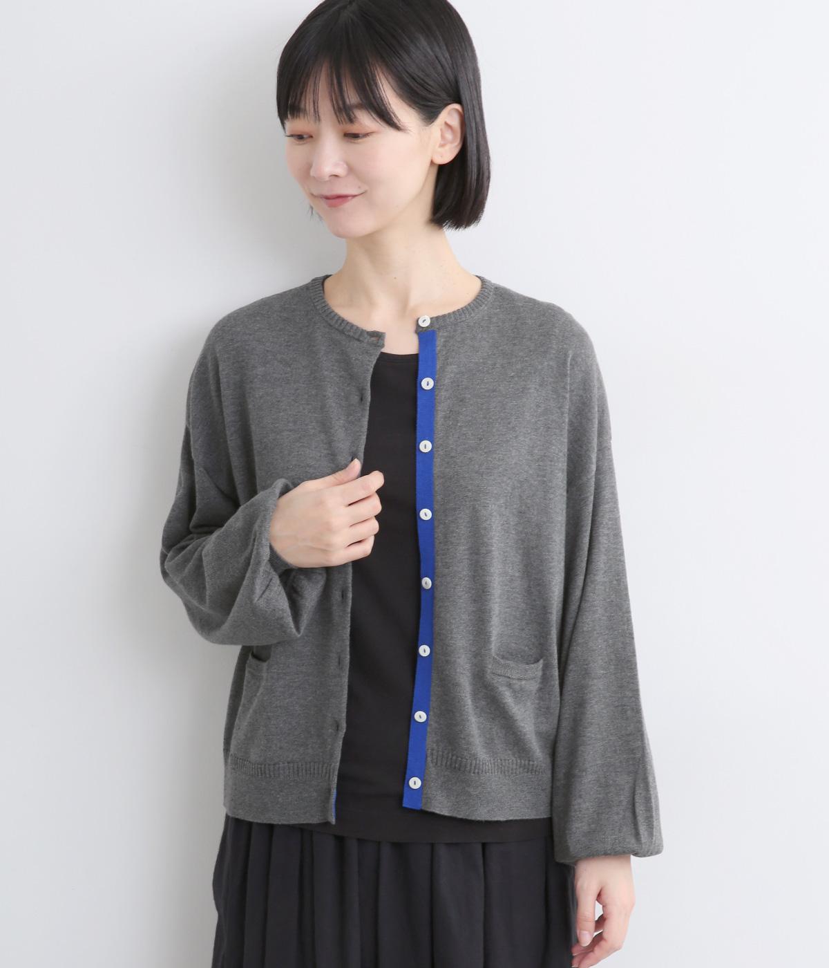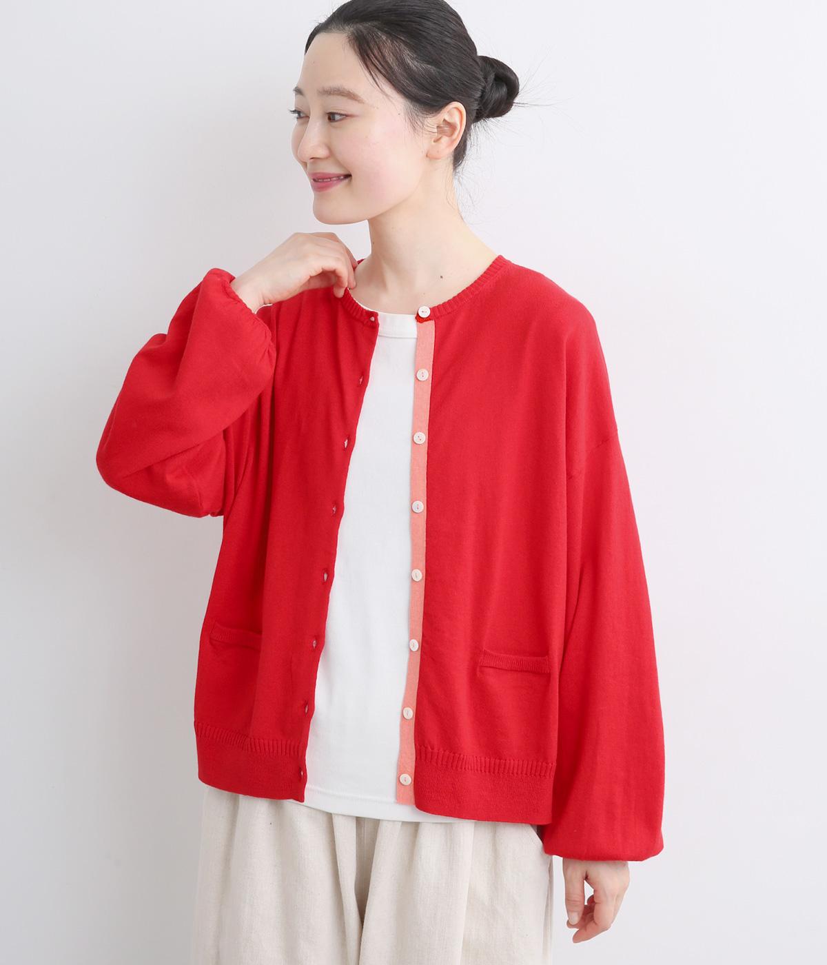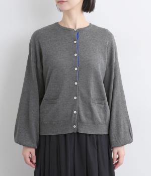 内側を配色にした前立てがさりげないアクセントのカーディガン。ぽわんと膨らみのある袖のシルエットもかわいらしい印象を与えます。ほどよい丈感でいろいろなボトムスと合わせやすく、着まわしできるアイテムです。