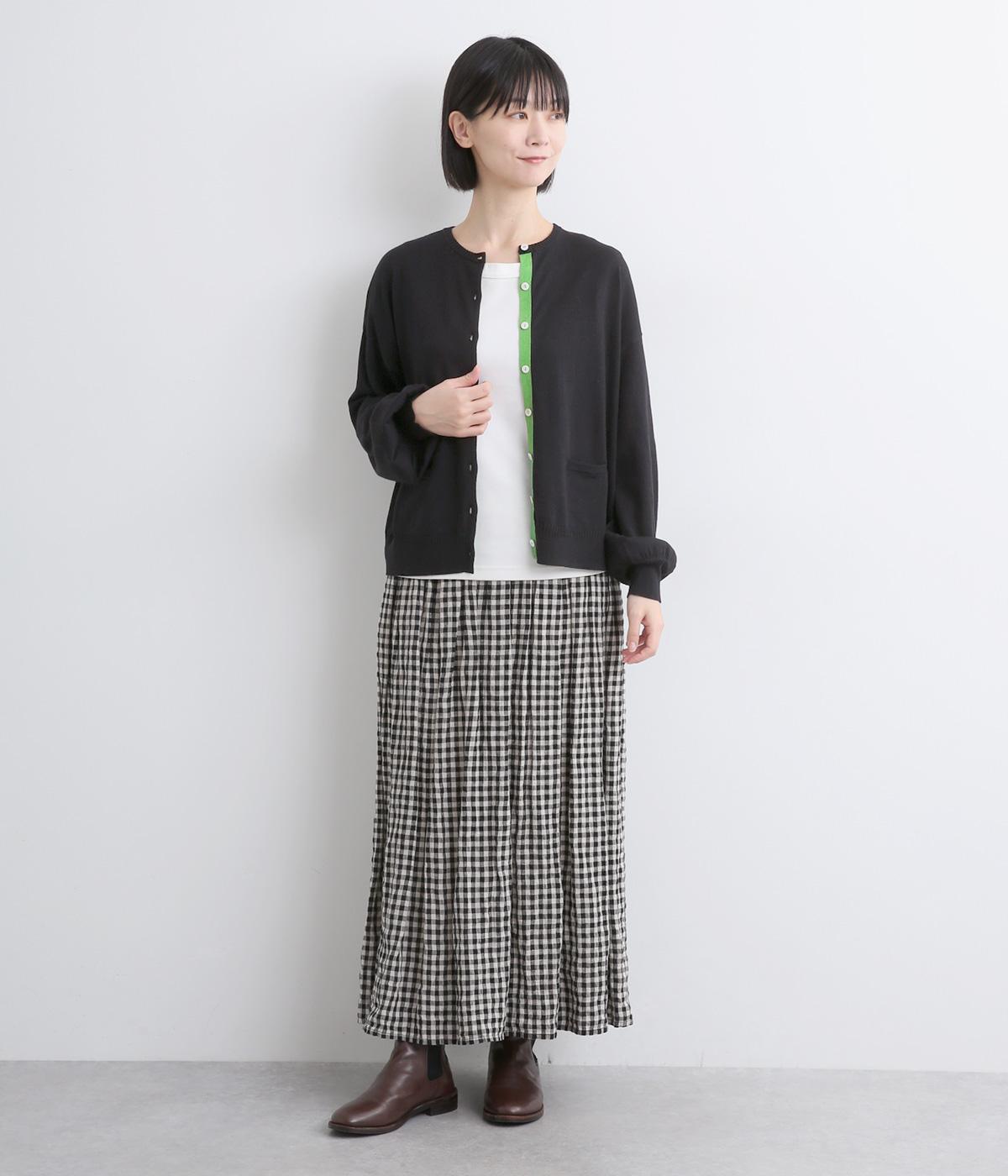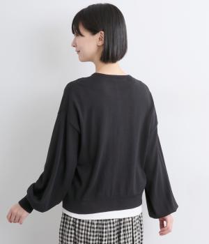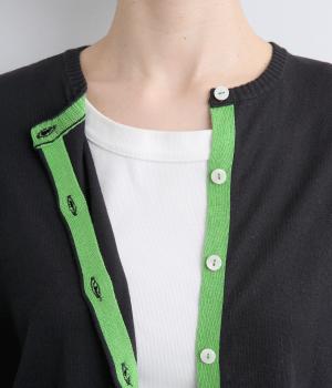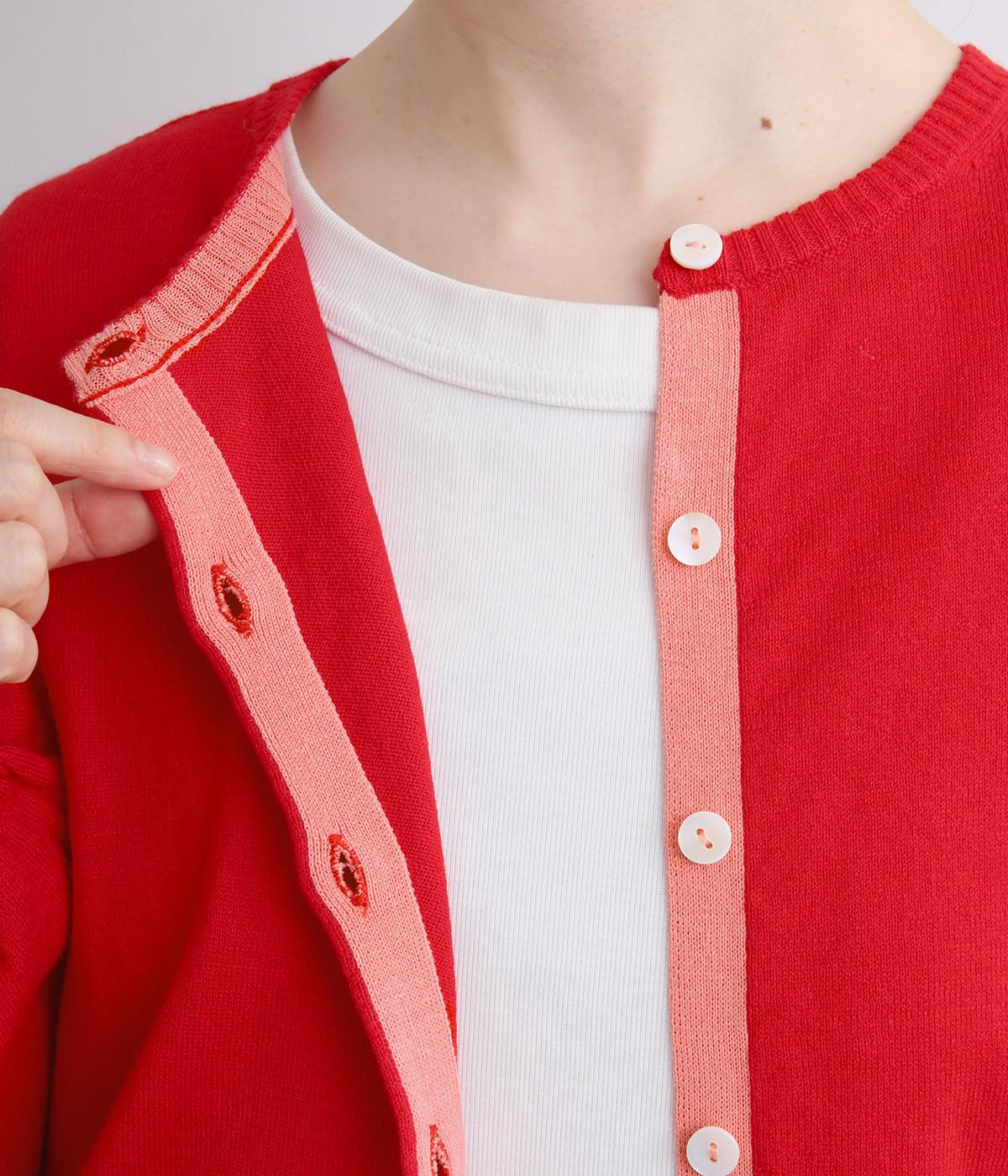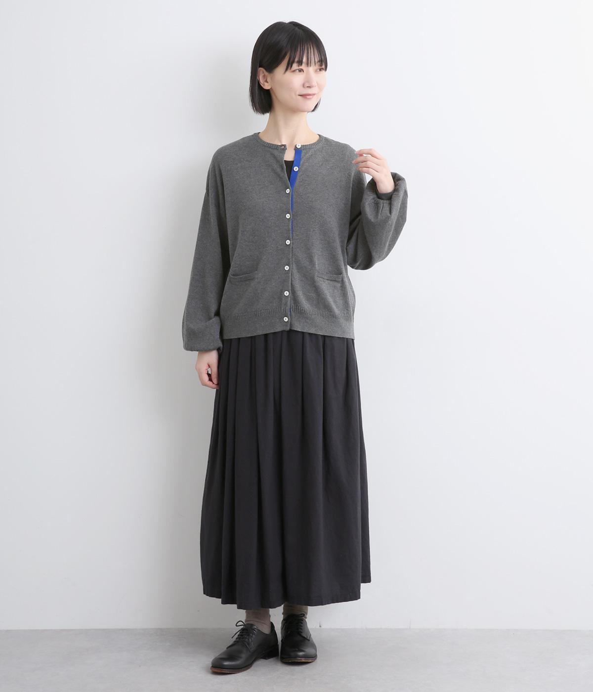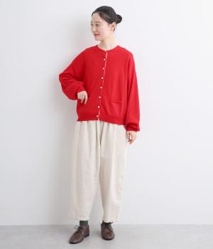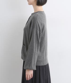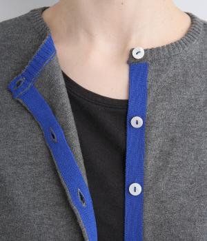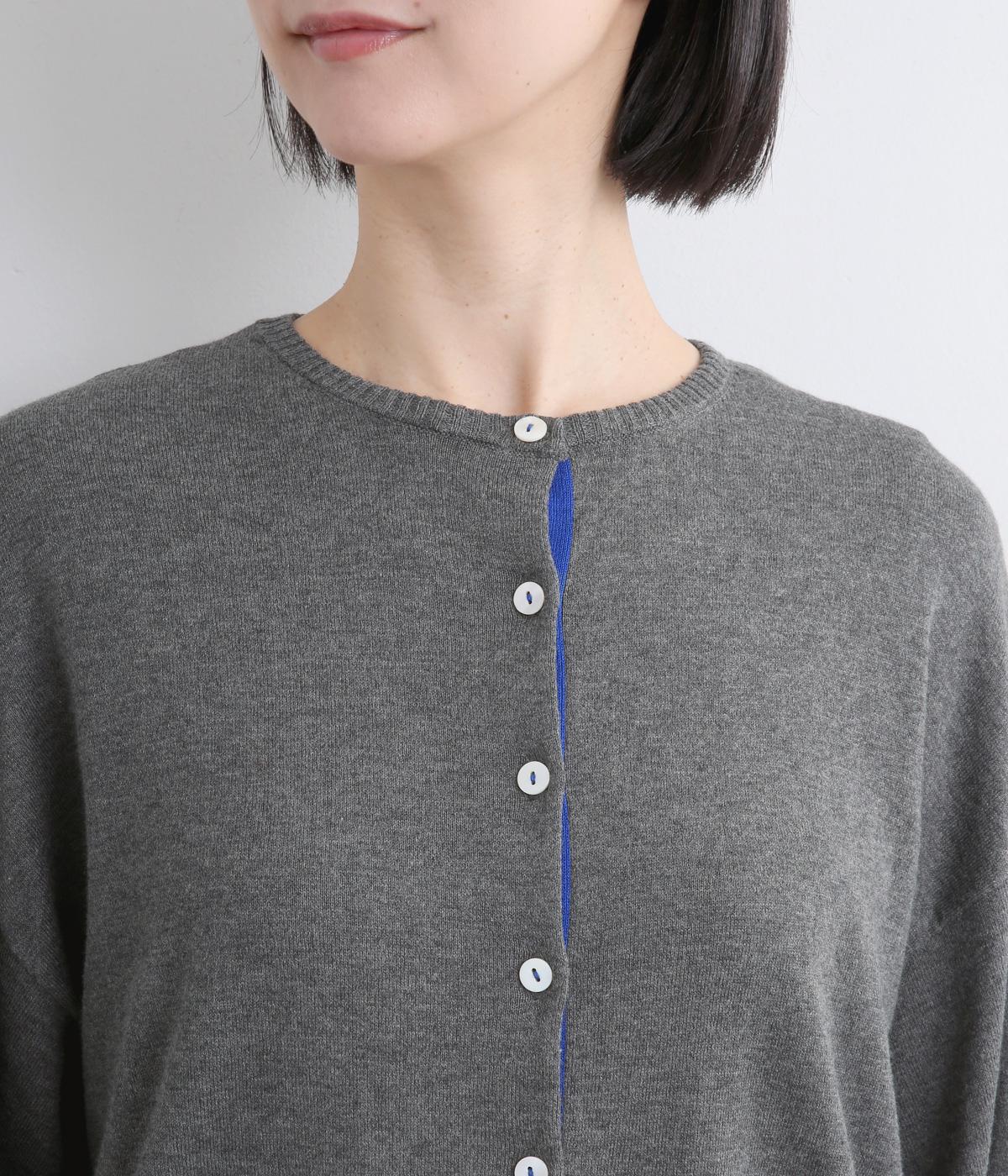 内側を配色にした前立てがさりげないアクセントのカーディガン。ぽわんと膨らみのある袖のシルエットもかわいらしい印象を与えます。ほどよい丈感でいろいろなボトムスと合わせやすく、着まわしできるアイテムです。