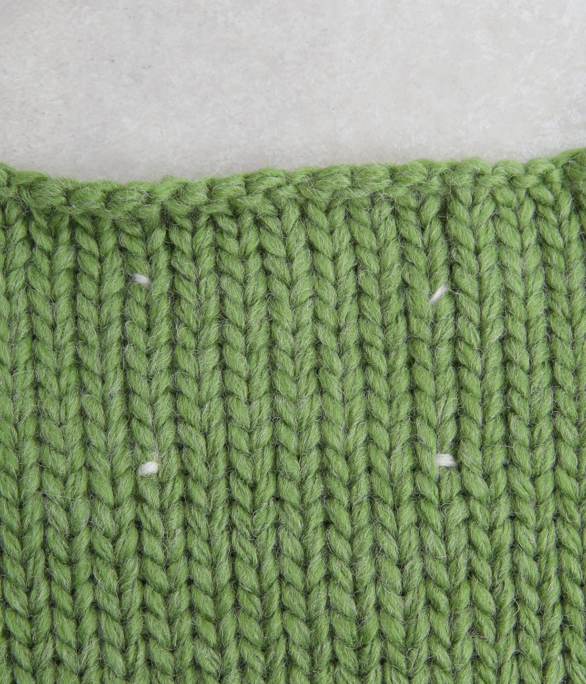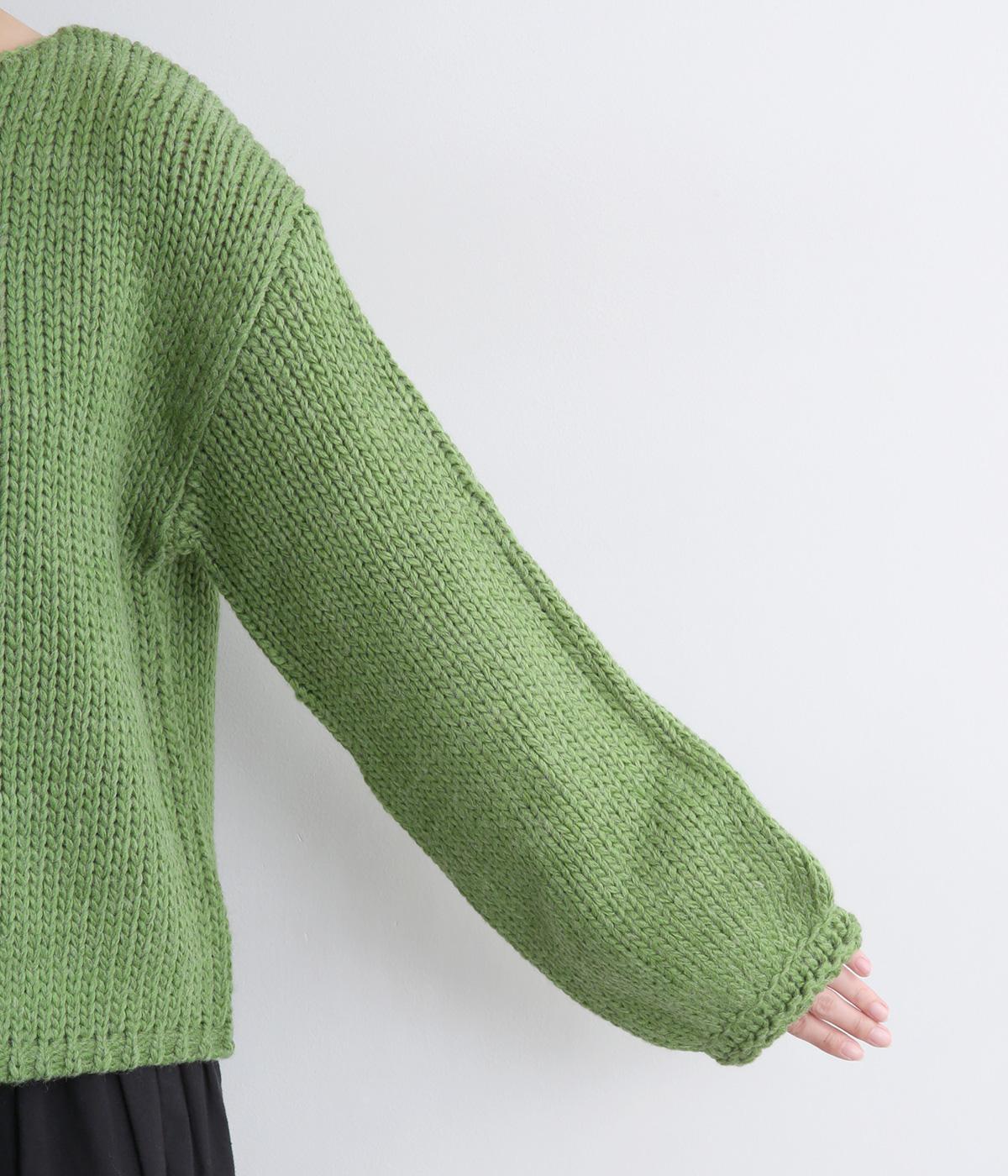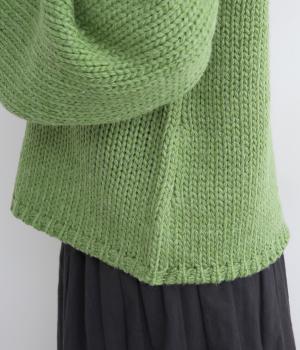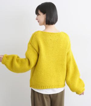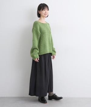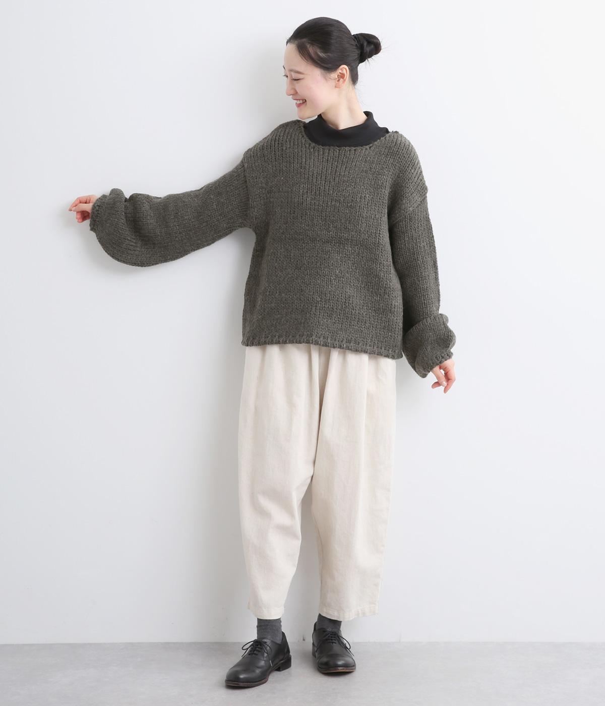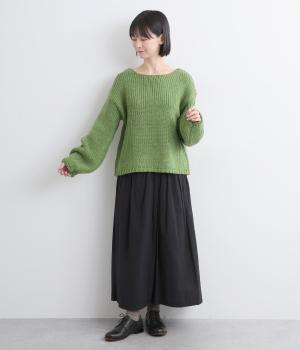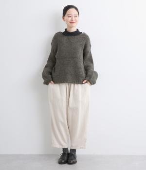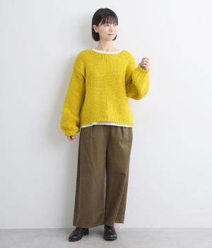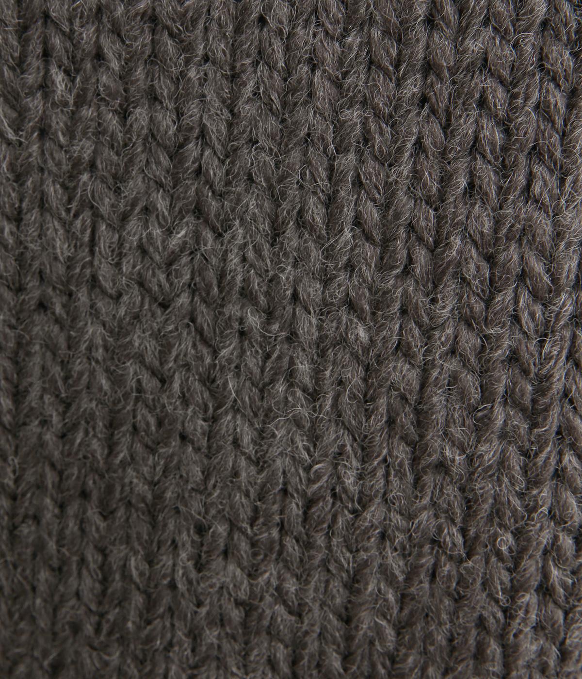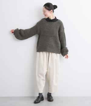柔らかく保温性があり、ふんわりとした質感のアクリルウールバルキー素材。ほどよい伸縮性でストレスの少ない着心地です。ざっくりとした素朴な風合いが魅力です。