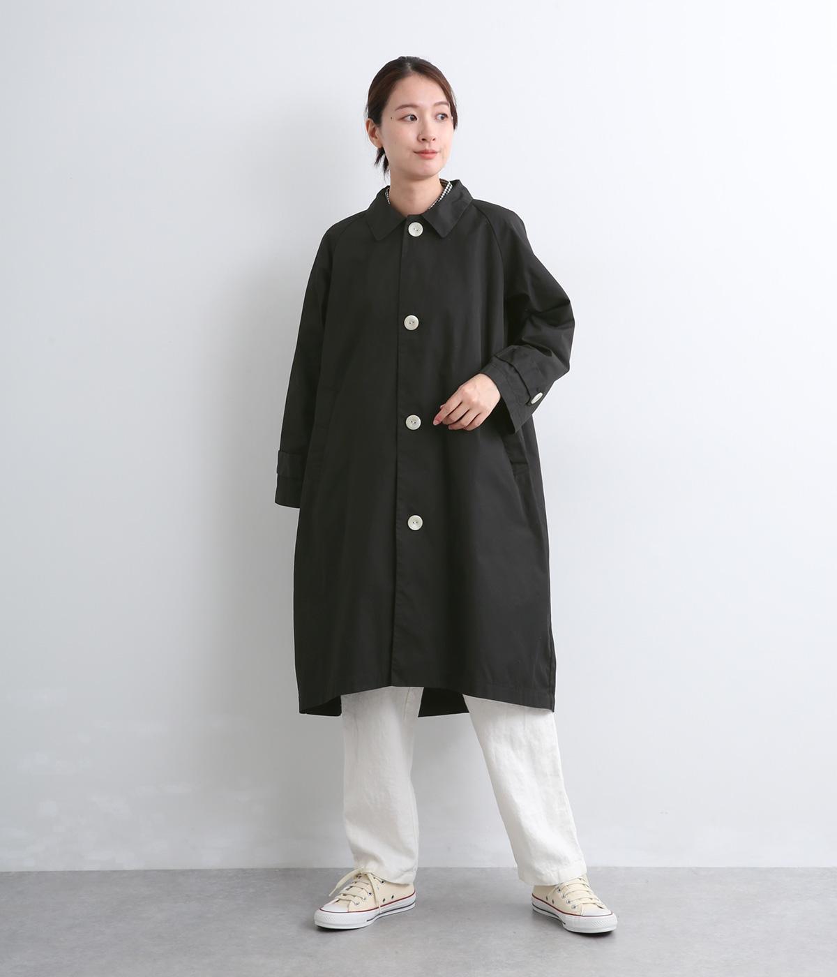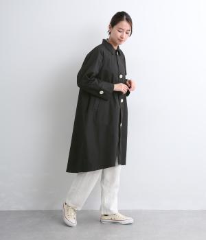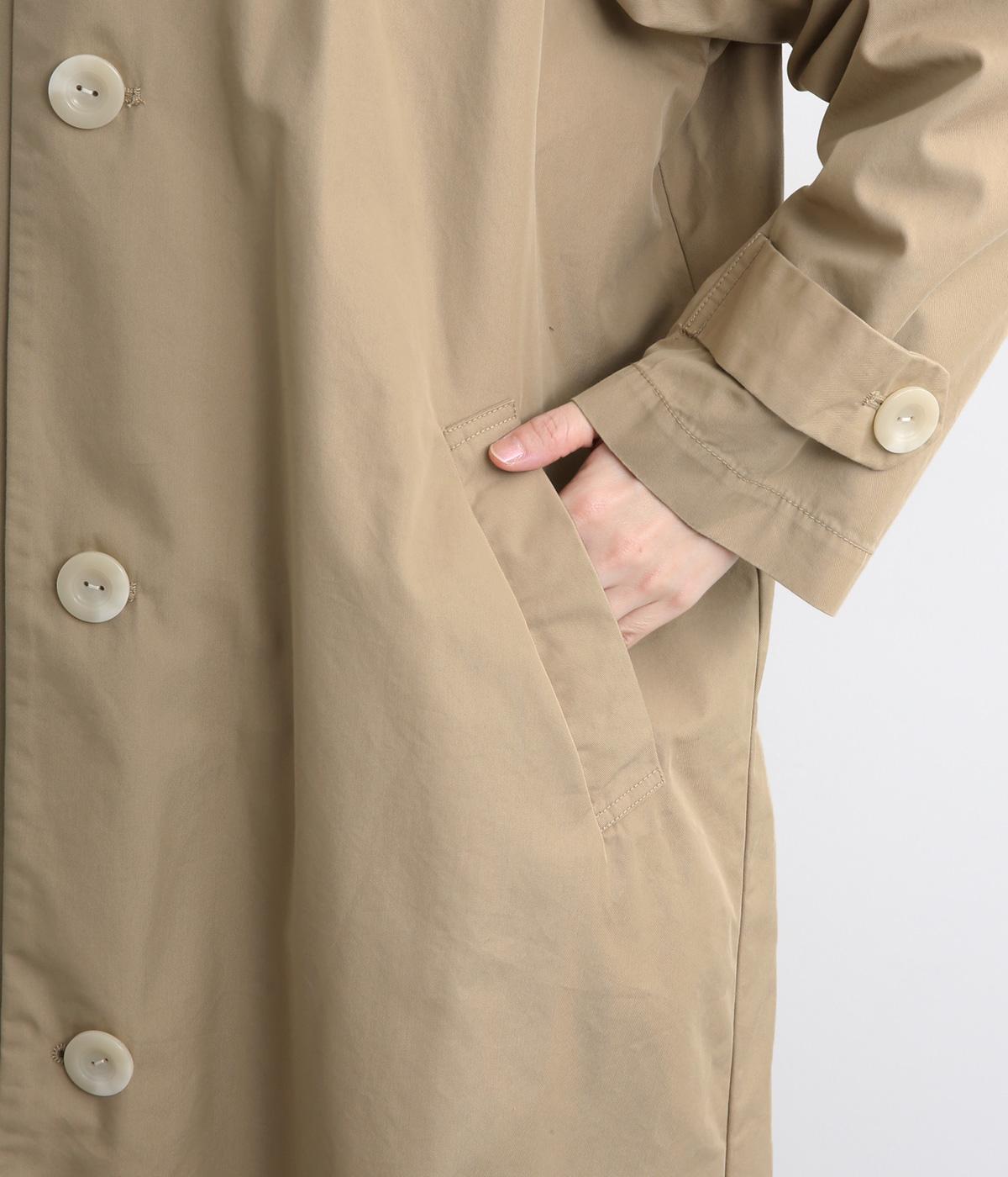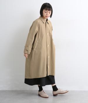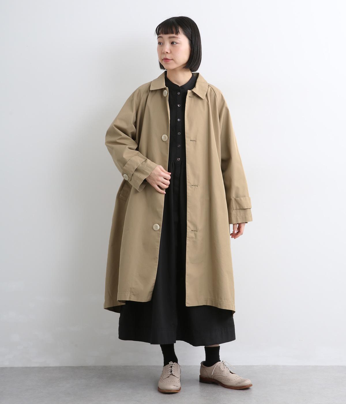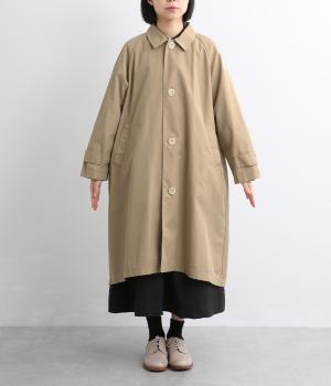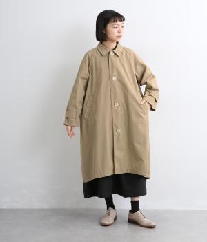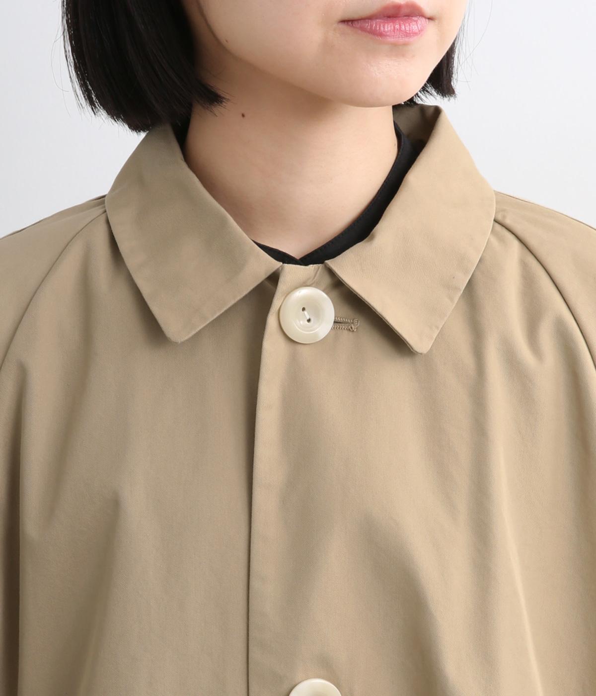 オーソドックスでマニッシュな印象のステンカラーコートにビッグボタンでカジュアルな遊び心を加えました。肩のラインをなだらかに見せるラグラン袖が、かっちり決めすぎずこなれた抜け感に。中に着込みやすいよう後ろタックでゆったりと。