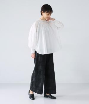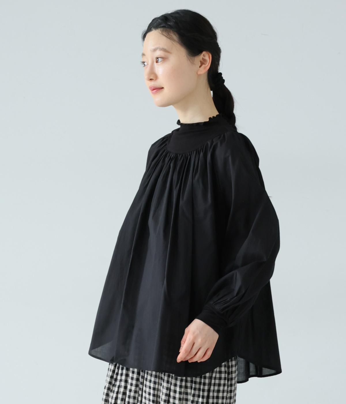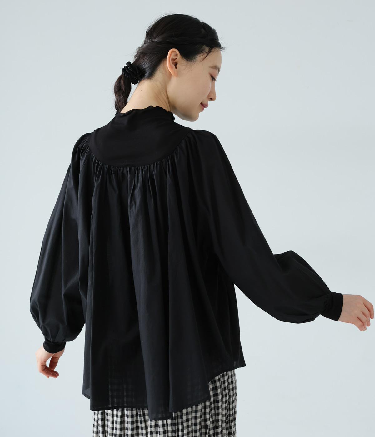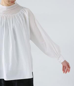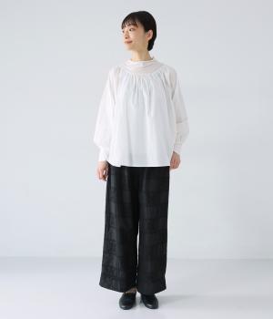 それぞれの生地の風合いをいかした異素材ミックスのブラウス。襟ぐりと袖口の切り替えにギャザーを入れて、ふんわりとした女性らしいシルエットに仕上げました。一枚でもインナーとしても着まわしのきく便利なアイテムです。